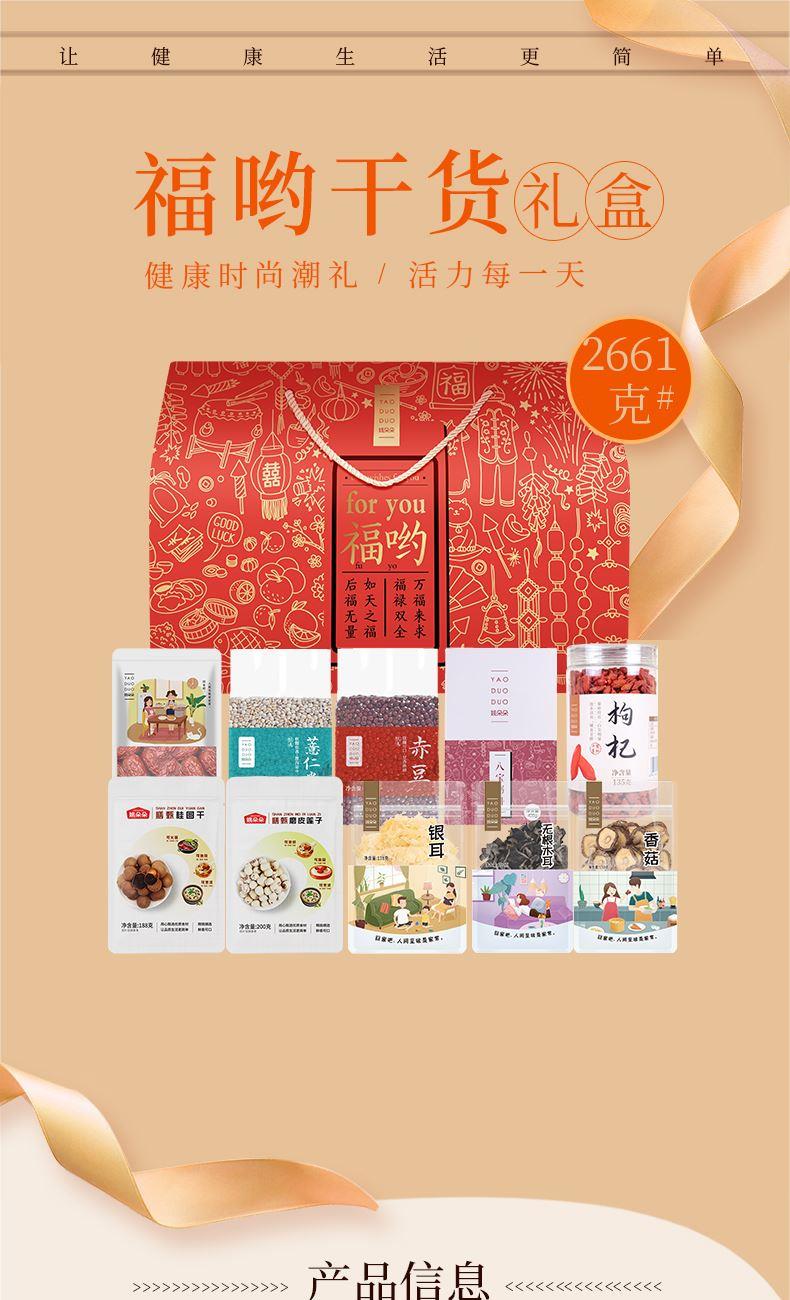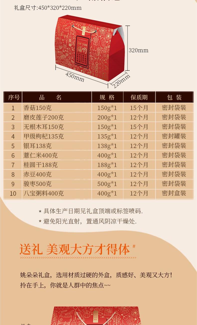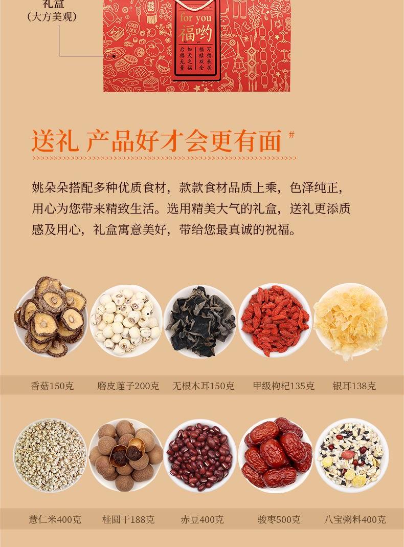 姚朵朵香菇150克 姚朵朵磨皮莲子200克 姚朵朵无根木耳150克 姚朵朵甲级枸杞135克 姚朵朵银耳138克 姚朵朵薏仁米400克 姚朵朵桂圆干188克 姚朵朵赤豆400克 姚朵朵骏枣500克 姚朵朵八宝粥料400克 福哟礼盒(锁底式)