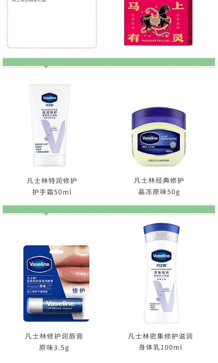 凡士林特润修护护手霜50ml 凡士林经典修护晶冻原味50g 凡士林修护润唇膏原味3.5g 凡士林密集修护滋润身体乳100ml 马上有灵精美礼盒