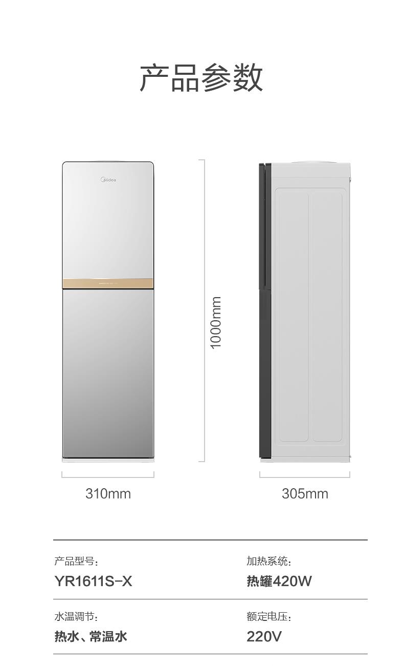 产品尺寸:310x305x1000mm 包装尺寸:370x370x1106mm 毛重:12.4kg 304不锈钢,加热内胆; U形一体机架; 隐藏前置排水; 下置隐藏水桶; 一体水路板;
