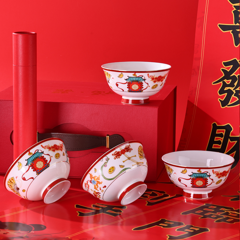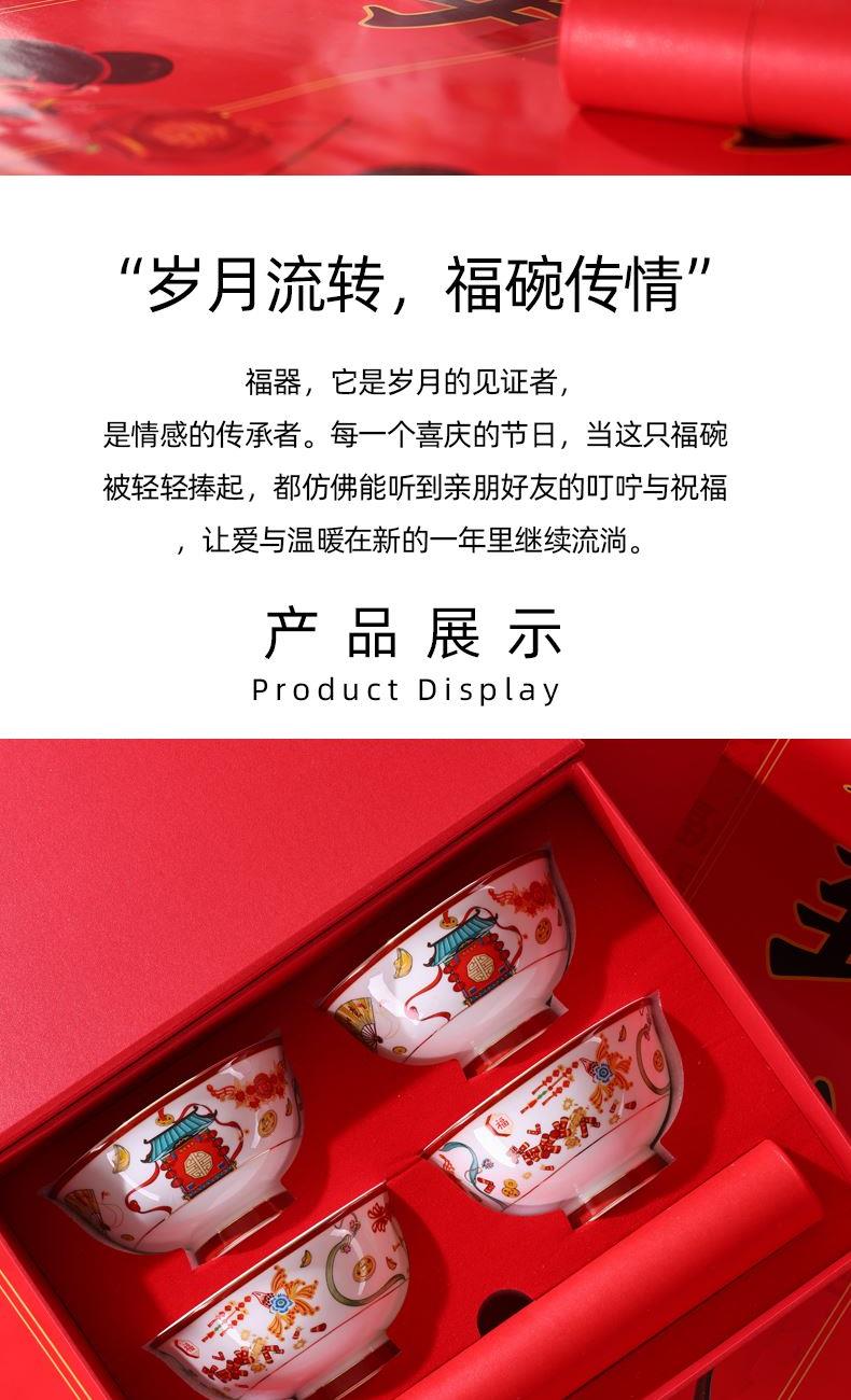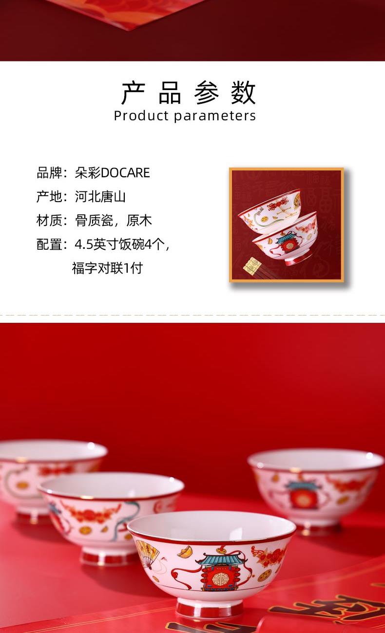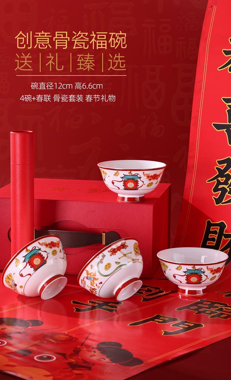 产品规格:福字春联1套,4.5英寸骨瓷碗4个。 产品材质:骨质瓷 产品花色:迎春闹福 包装方式:礼盒 单套重量:1.35KG 彩盒尺寸: 308*135*232mm 产品条码:6953300022316 零 售 价:499.00元