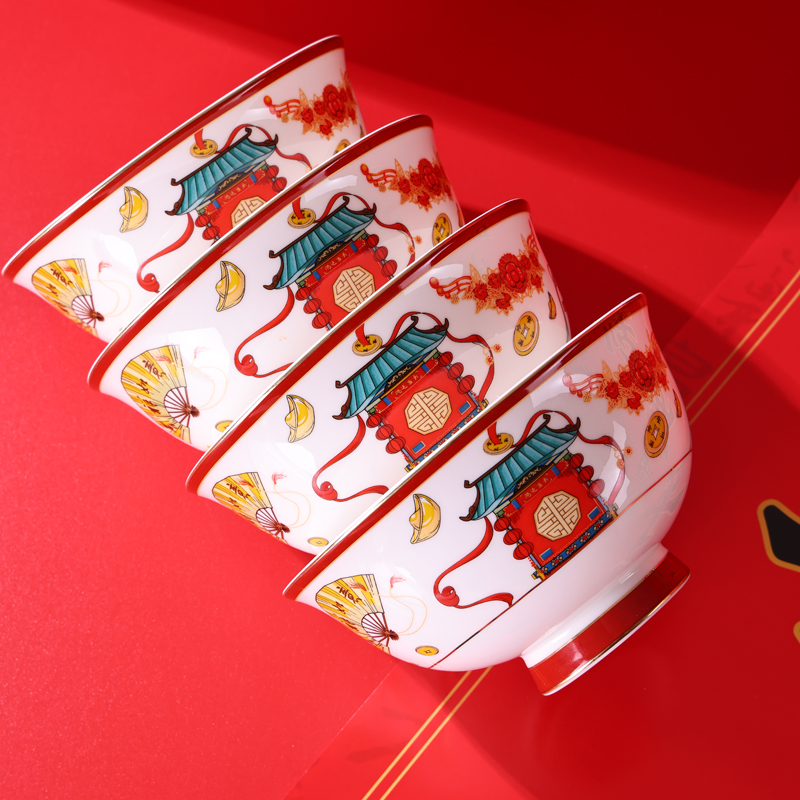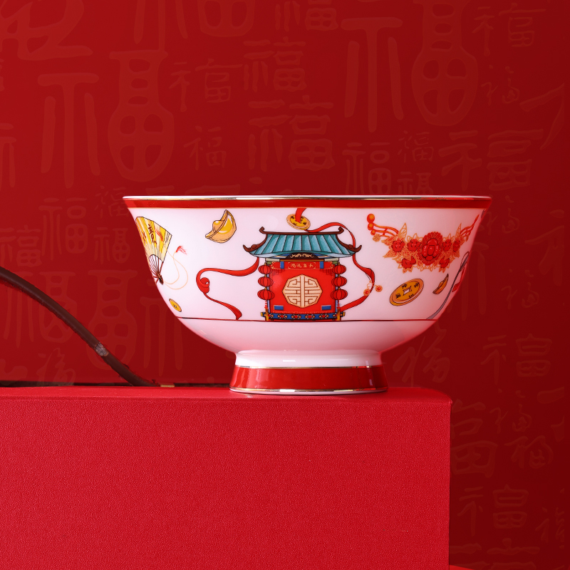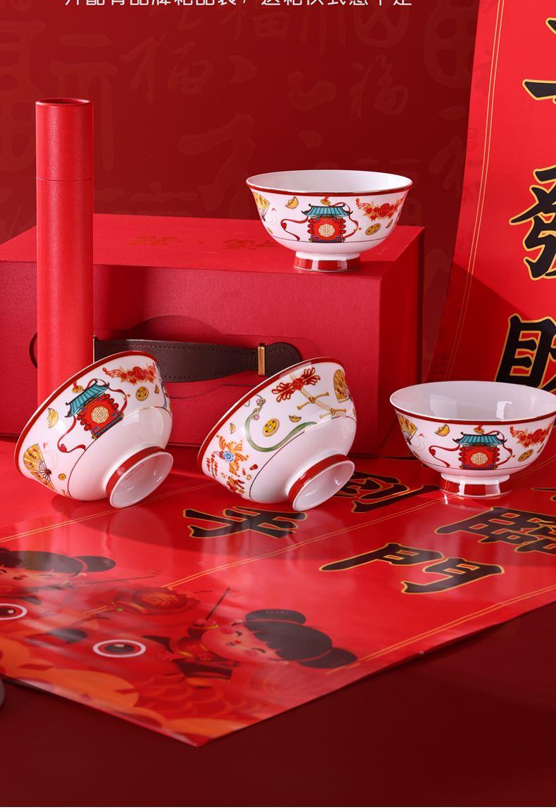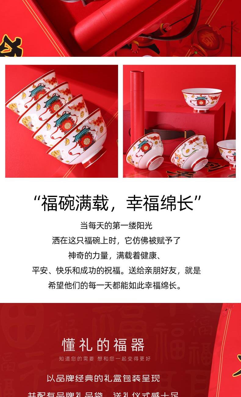 产品规格:福字春联1套,4.5英寸骨瓷碗4个。 产品材质:骨质瓷 产品花色:迎春闹福 包装方式:礼盒 单套重量:1.35KG 彩盒尺寸: 308*135*232mm 产品条码:6953300022316 零 售 价:499.00元