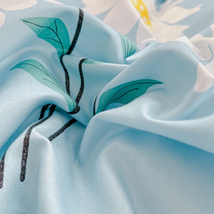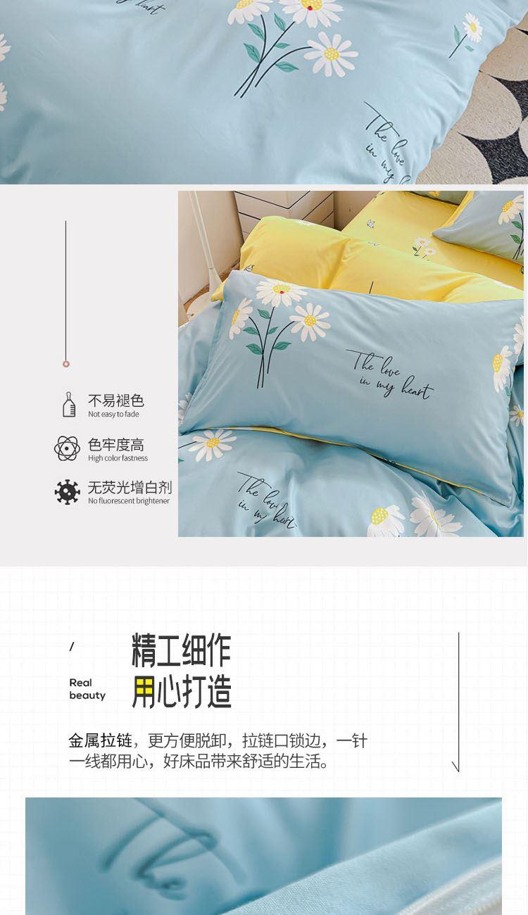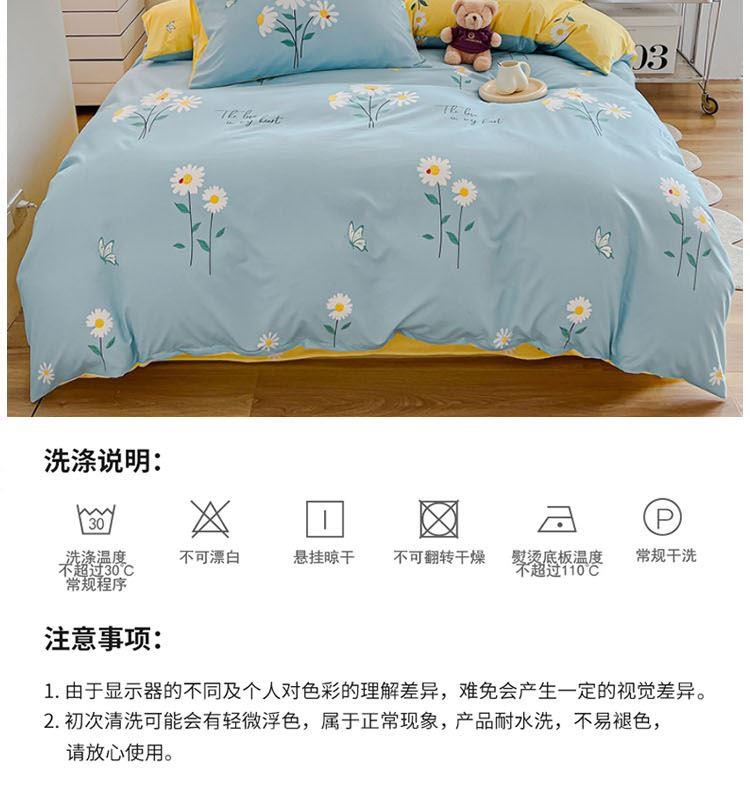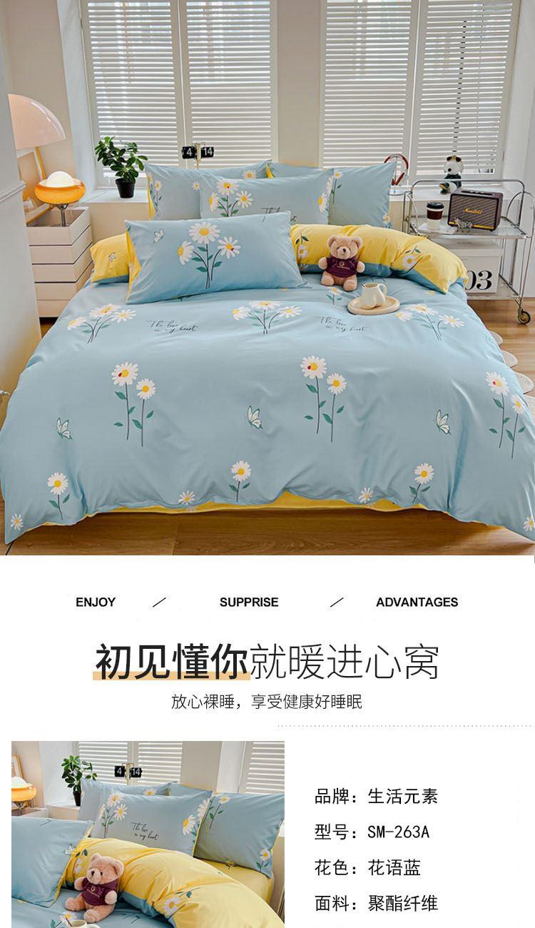 型号:SM-263A 花色:花语蓝 面料:聚酯纤维 被套:200*230cm 床单:230*250cm 枕套:48*74cm*2 外箱尺寸:520*370*900mm 采用活性磨毛印花,洗后不易脱色不变形、不起球。依然如新,绿色无污染,手感细腻柔软,经纬密度均匀,面料厚实不起球。