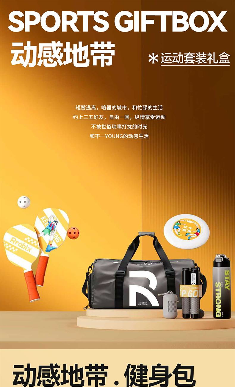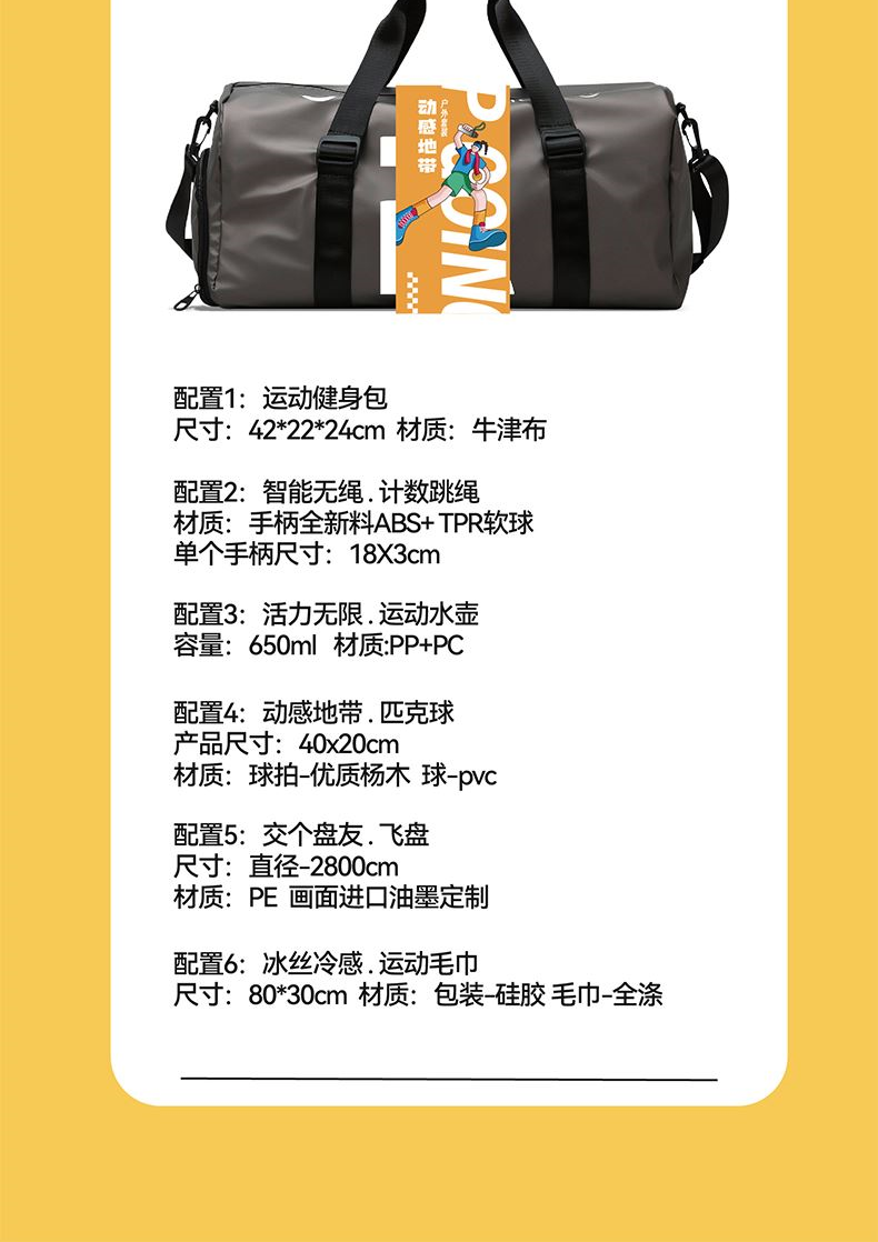 礼盒配置:多功能运动包*1、渐变运动水杯*1 运动毛巾*1、无绳跳绳*1 “交个盘友”飞盘*1 、匹克球套装* 1产品规格:运动水杯-650ml、飞盘-27.5cm 匹克球套装- 40x20cm (含1副球拍、4个球) 运动毛巾-80*30cm 跳绳-18*3*18cm 运动包-42*22*24cm