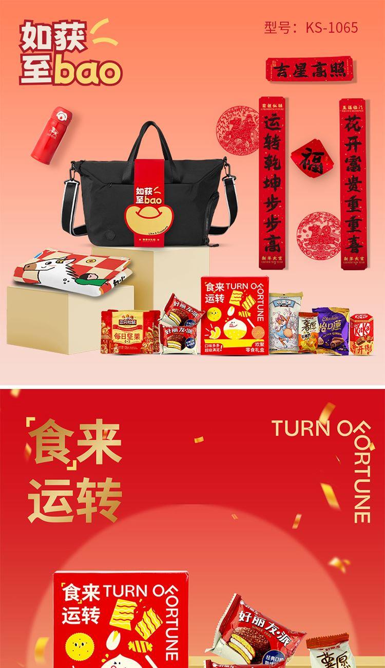 采用运动健身包作为外包装,搭配精美元宝腰封,时尚又环保,年味亦十足。