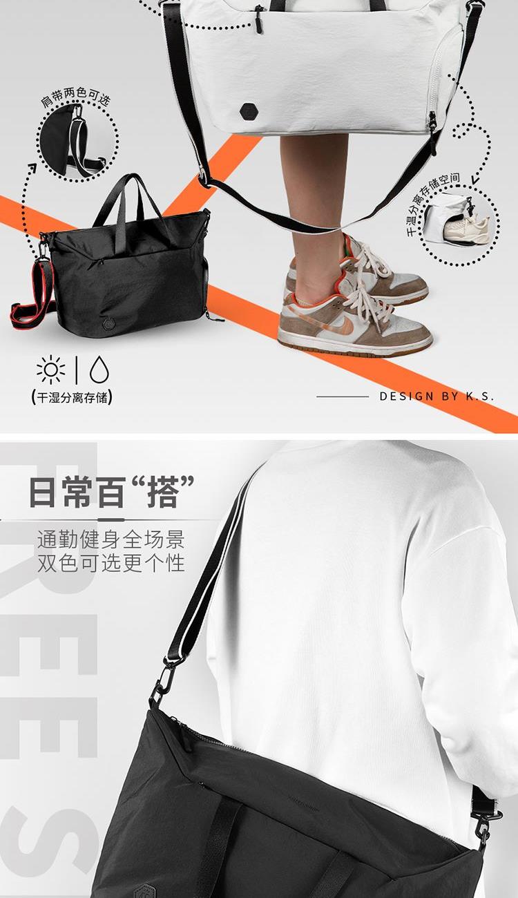 健身包:50CM*27CM 主料:尼龙塔丝隆,成分:99.9%尼龙里布:桃皮绒+210T,99.9%涤纶 肩带和提手:99.9%涤纶