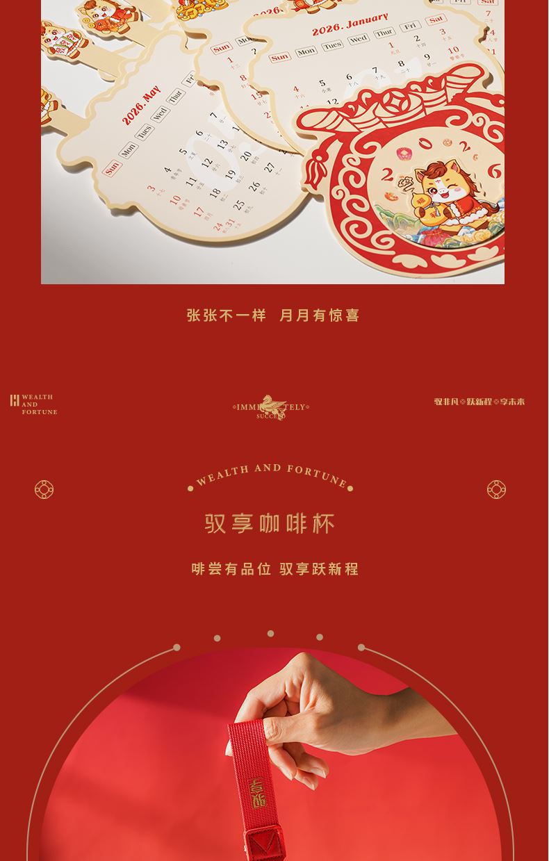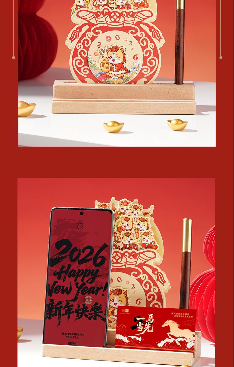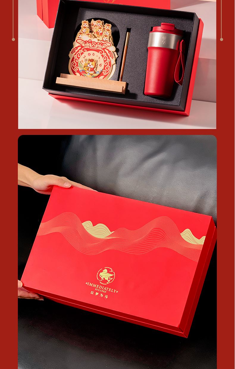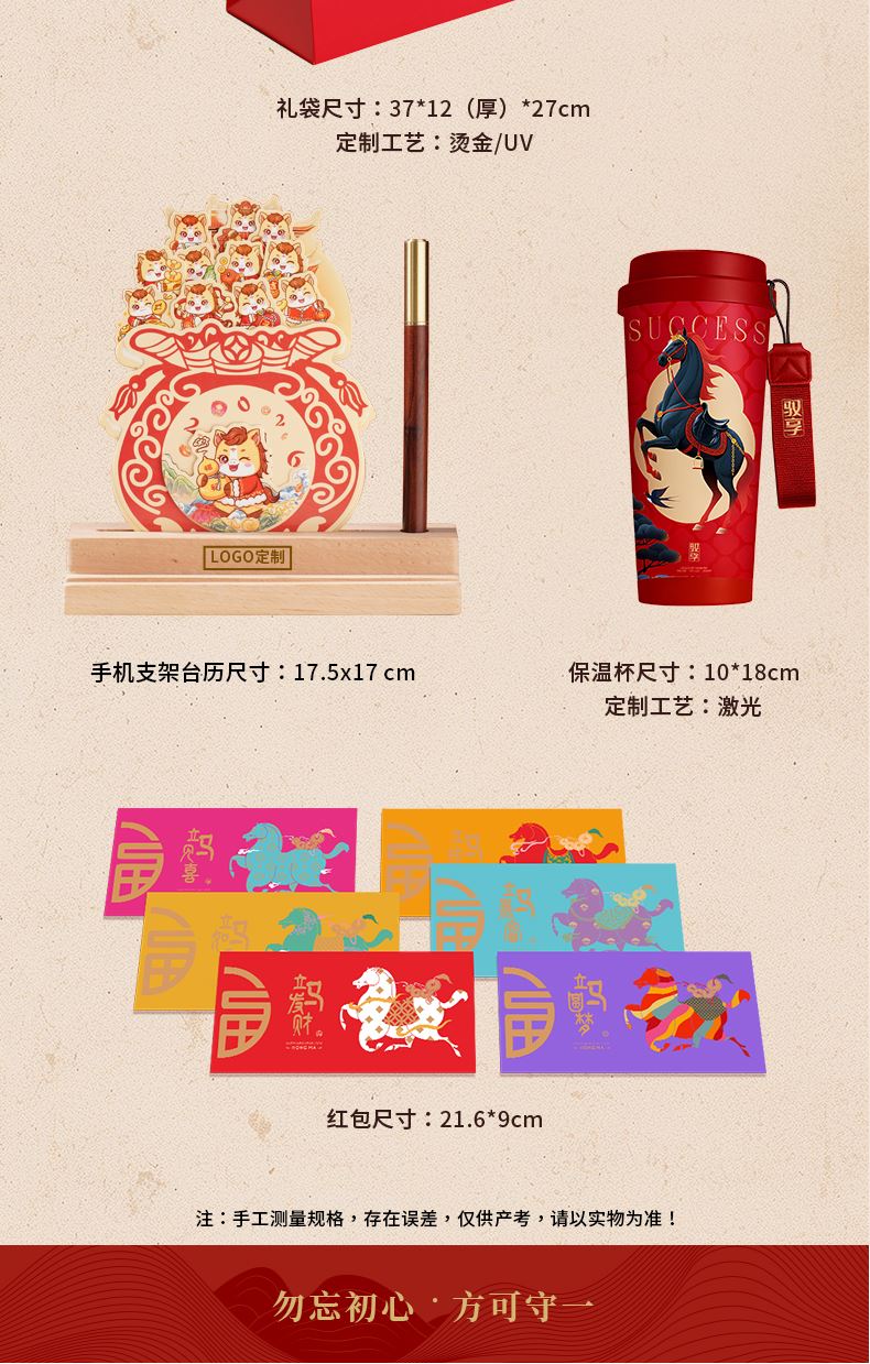 1、多功能日历摆件:底坐榉木,手机加平板电脑支架功能、笔插功能、留言板功能 2、红色咖啡杯:500ML 316不锈钢 3、红木签字笔:书写新年 新篇章 4、新年红包*6:开启新年好运程
