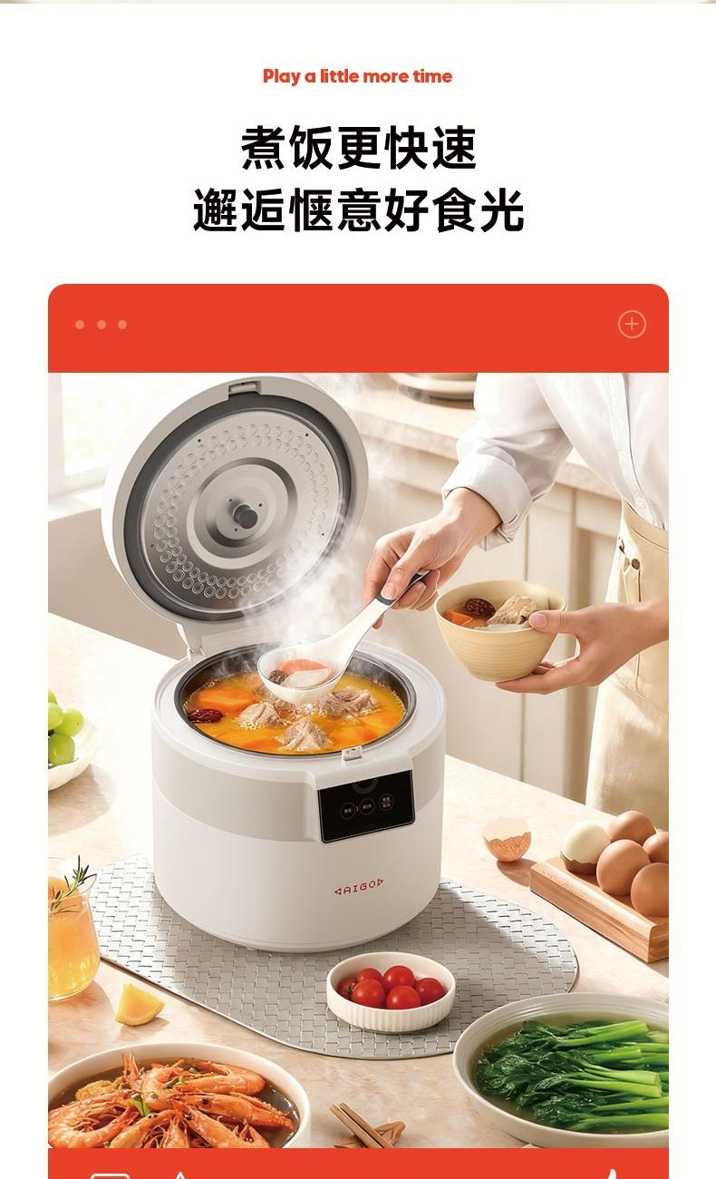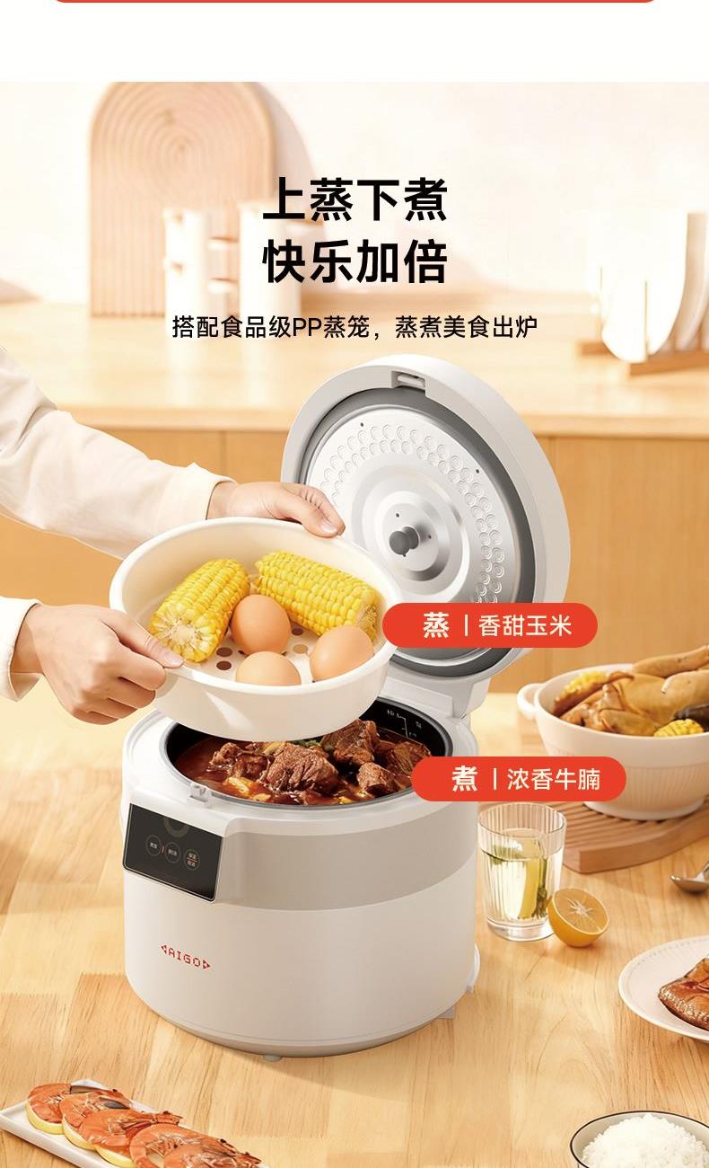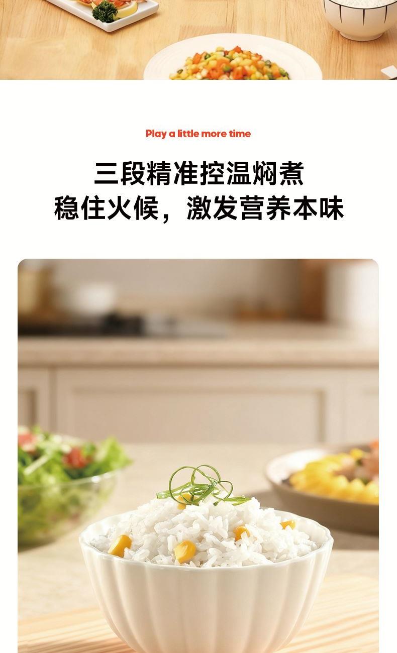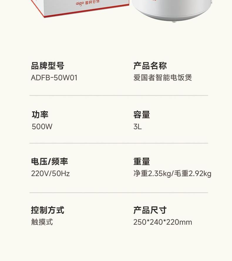 1、3.0L容量设计,满足3-5人之家的饭量; 2、超厚球釜内胆,碗型发热盘,让米粒充分均匀受热,米饭更香甜; 3、微压蒸煮技术,确保米饭软硬适中,让米饭颗颗饱满; 4、可拆卸内盖设计,清洗更方便; 5、触控面板,三键控制直观简易操作; 6、自主研发电控,控温,美味随 时享。 功率:500W 容量:3L 毛重:3.2kg 包装方式:单邮 包装尺寸:295*295*262mm