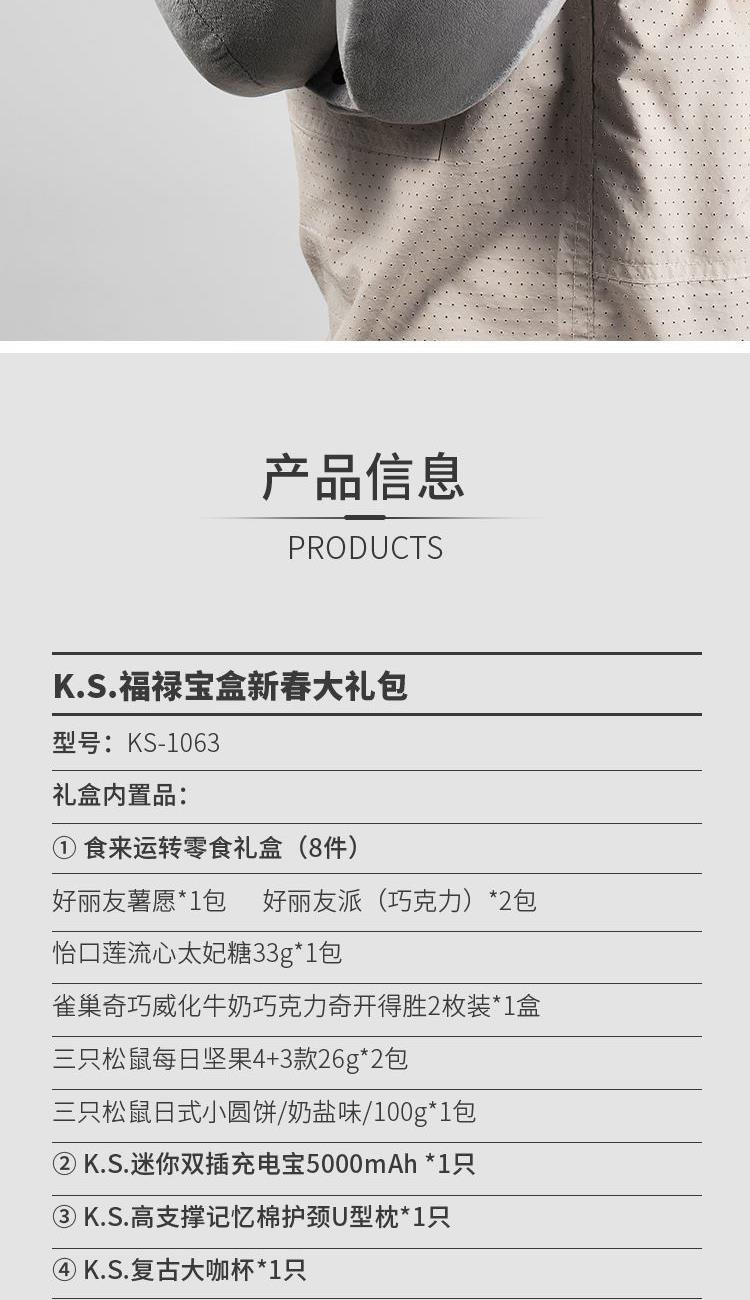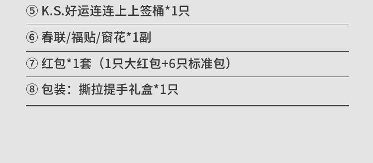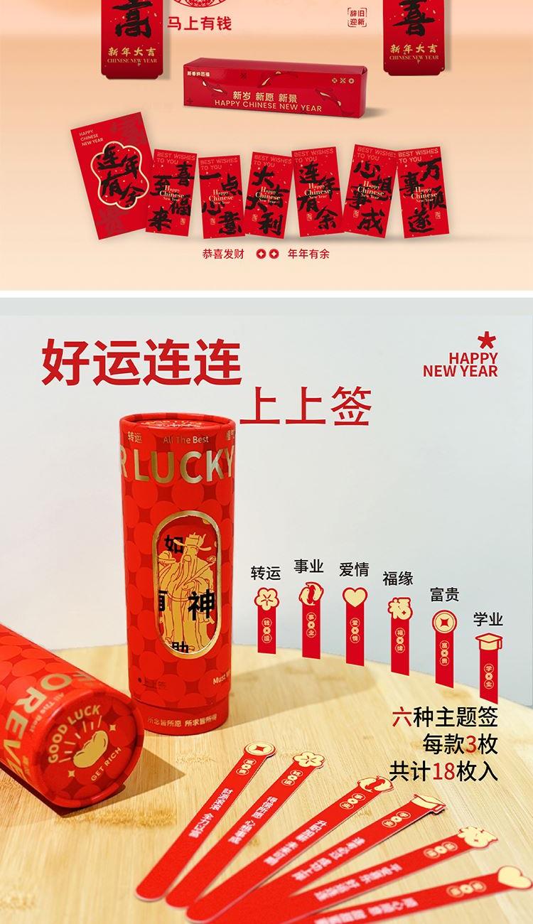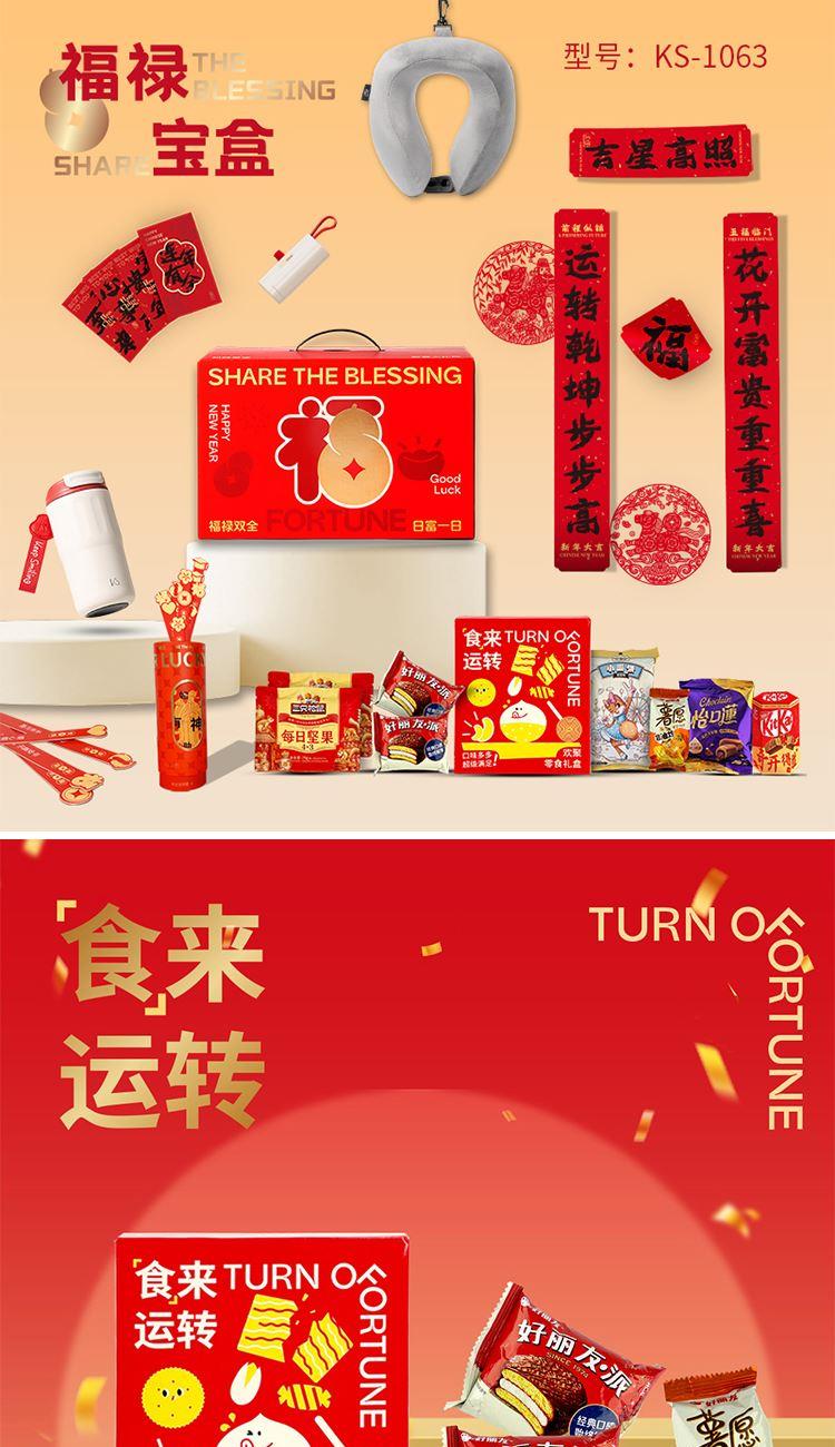 精选传统年味春联、红包、窗花与零食礼盒构成经典组合,并搭配实用好物(保温杯、求签桶、U型枕、充电宝),支持产品替换,灵活自由。