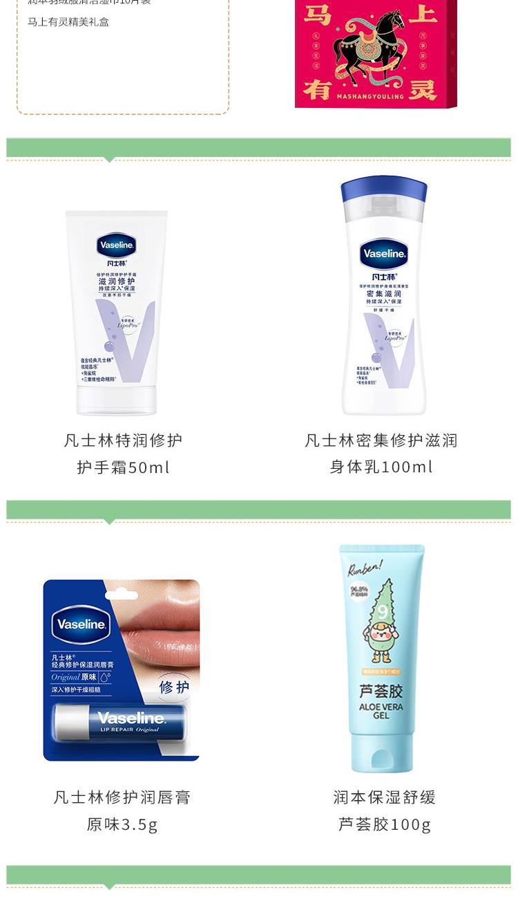 凡士林密集修护滋润身体乳100ml 凡士林特润修护护手霜50ml 凡士林修护润唇膏原味3.5g 润本保湿舒缓芦荟胶100g 润本羽绒服清洁湿巾10片装 马上有灵精美礼盒