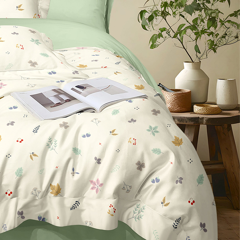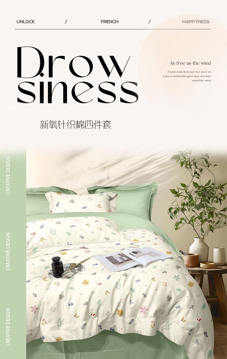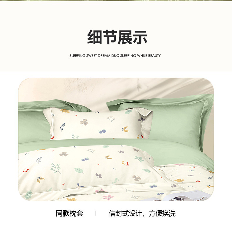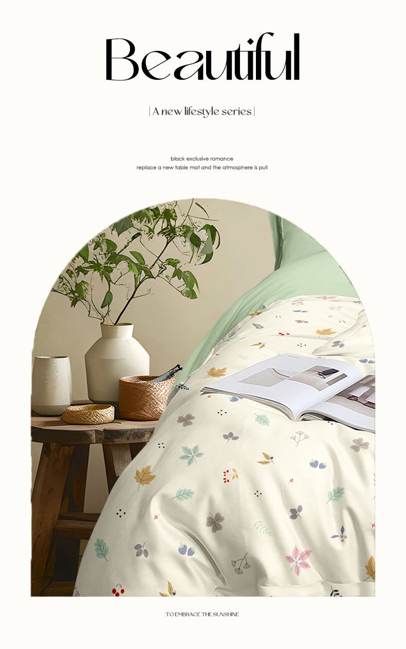 被套:200*230cm 床单:230*235cm 枕套:48*74cm*2 面料:新氧棉(聚酯纤维) 执行标准:GB/T22796-2021 安全类别:GB18401-2010 B类 采用精选针织棉面料,以AB版双面设计诠释清新自然美学。面料拥有仿若旧T恤的柔软触感,经纬交织的天然弹力让被套更贴合被芯,带来无拘束的睡眠体验。A面采用活性印染技术呈现清新花草图案,B面搭配柔和的纯色基底,正反翻转即可切换卧室风格。
