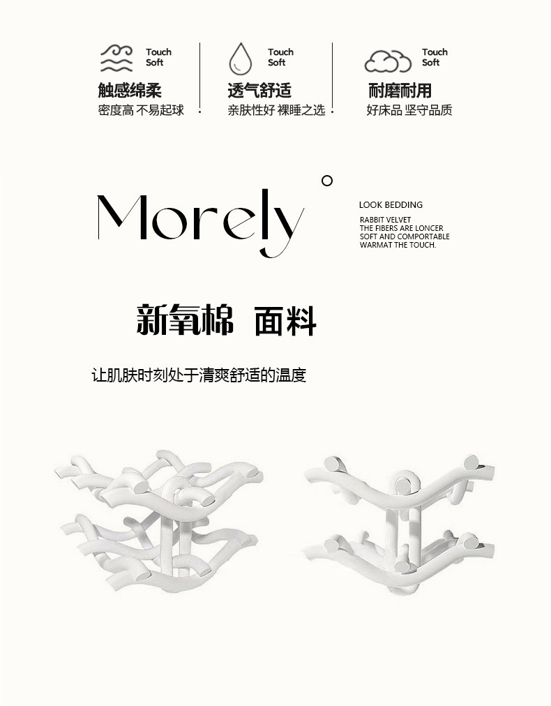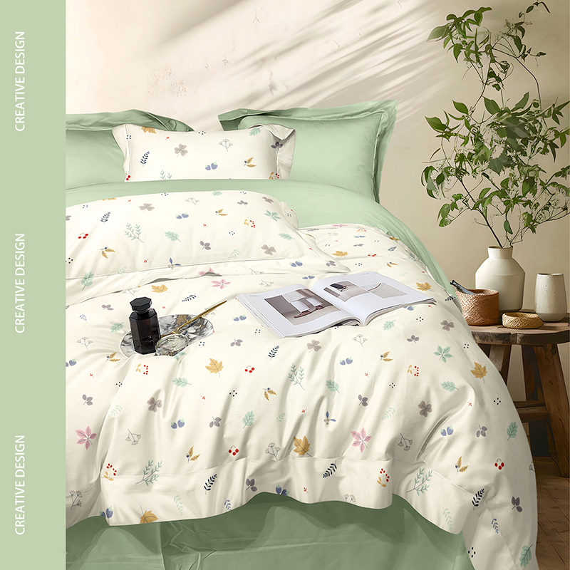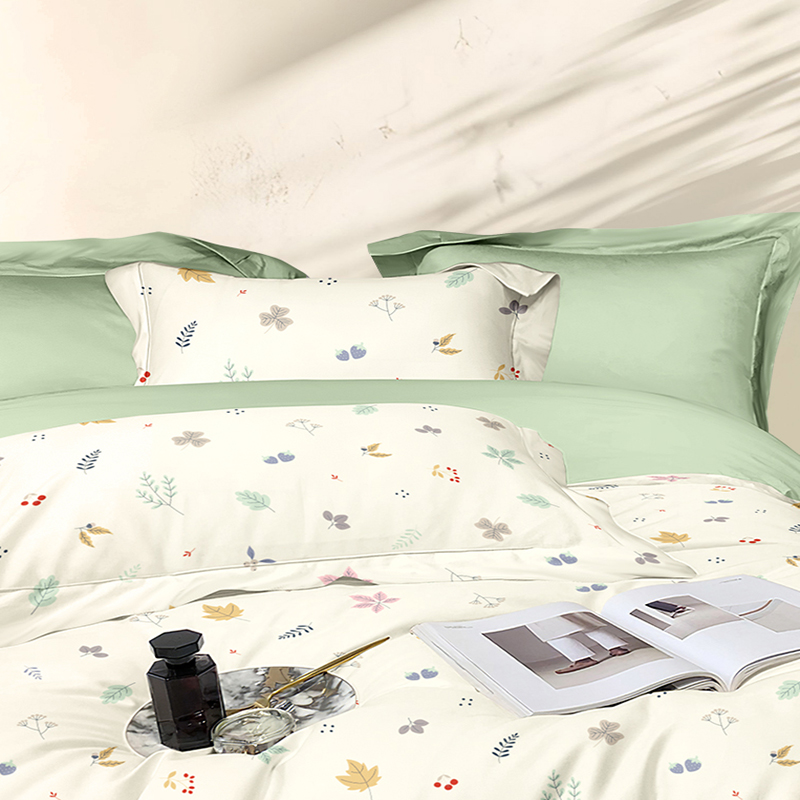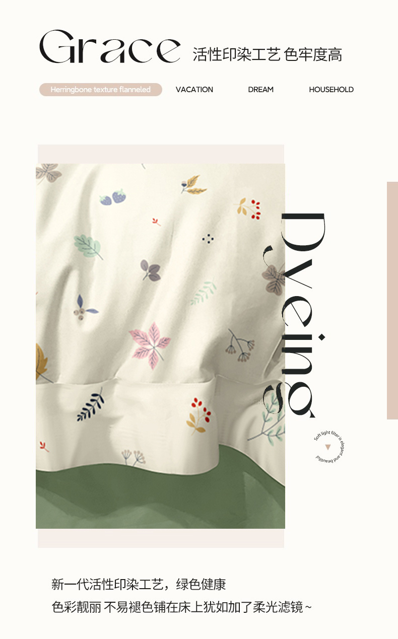 被套:200*230cm 床单:230*235cm 枕套:48*74cm*2 面料:新氧棉(聚酯纤维) 执行标准:GB/T22796-2021 安全类别:GB18401-2010 B类 采用精选针织棉面料,以AB版双面设计诠释清新自然美学。面料拥有仿若旧T恤的柔软触感,经纬交织的天然弹力让被套更贴合被芯,带来无拘束的睡眠体验。A面采用活性印染技术呈现清新花草图案,B面搭配柔和的纯色基底,正反翻转即可切换卧室风格。