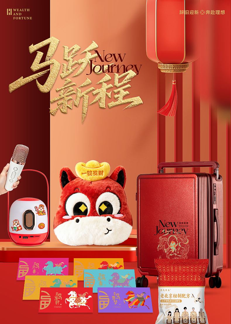 产品配置:20寸行李箱、多功能蓝牙音响加氛围灯加唛、一锭发财可爱抱枕、十八味药材泡脚包30小包、马年大吉红包*6个