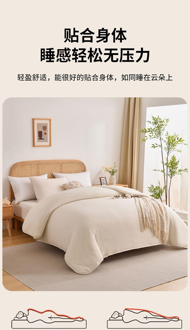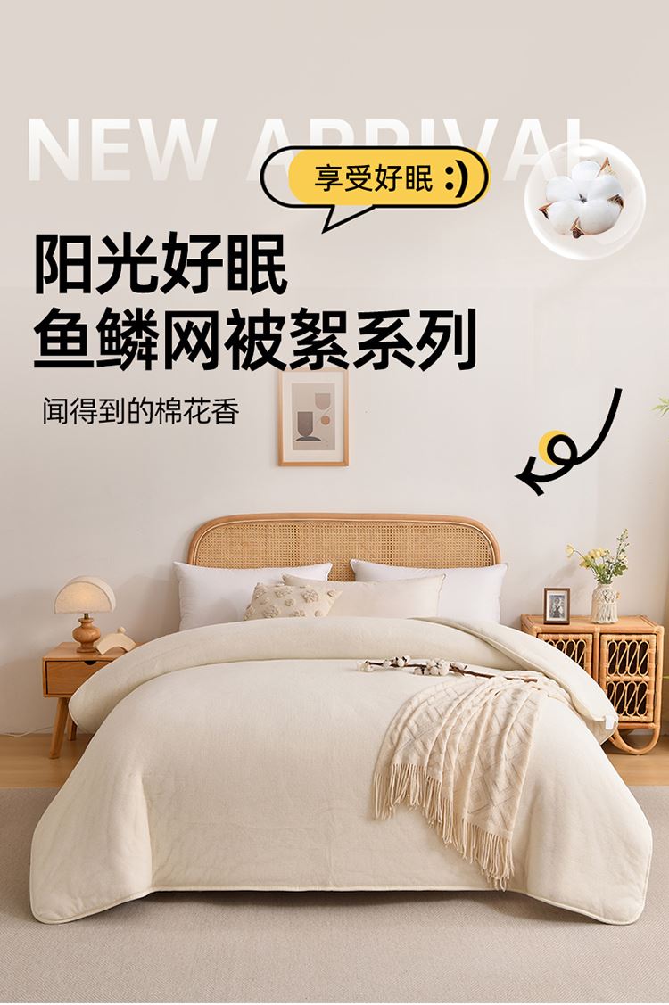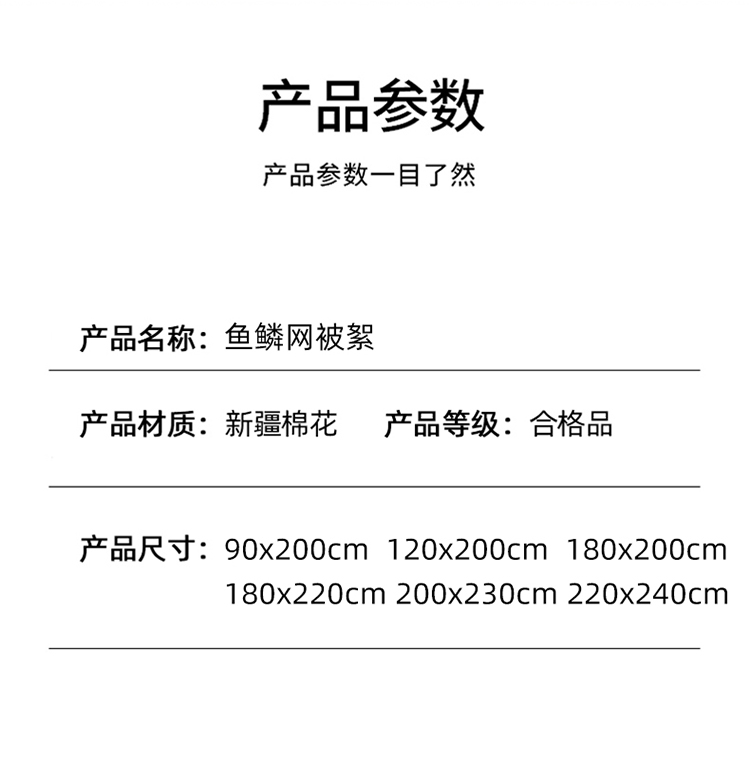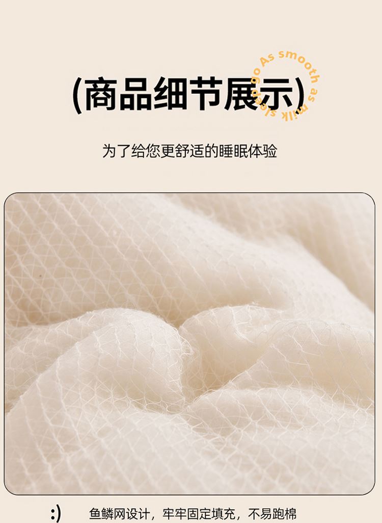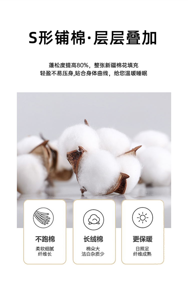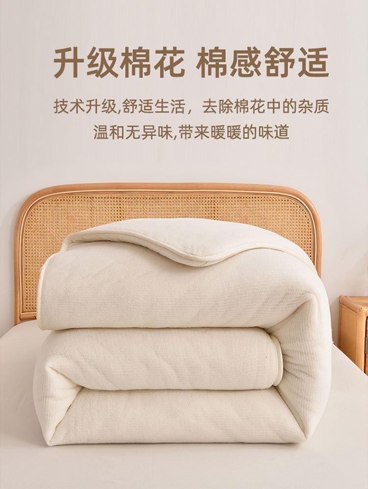 1:升级棉花 棉感舒适 技术升级,舒适生活,去除棉花中的杂质温和无异味,带来暖暖的味道 2:蓬松度提高80%,整张新疆棉花填充轻盈不易压身,贴合身体曲线,给您温暖睡眠 3:鱼鳞网设计,牢牢固定填充,不易跑棉,细致包边,针脚细腻,耐磨耐用 尺寸: 200x230cm5斤(可定做任意尺寸重量) 包装:礼袋