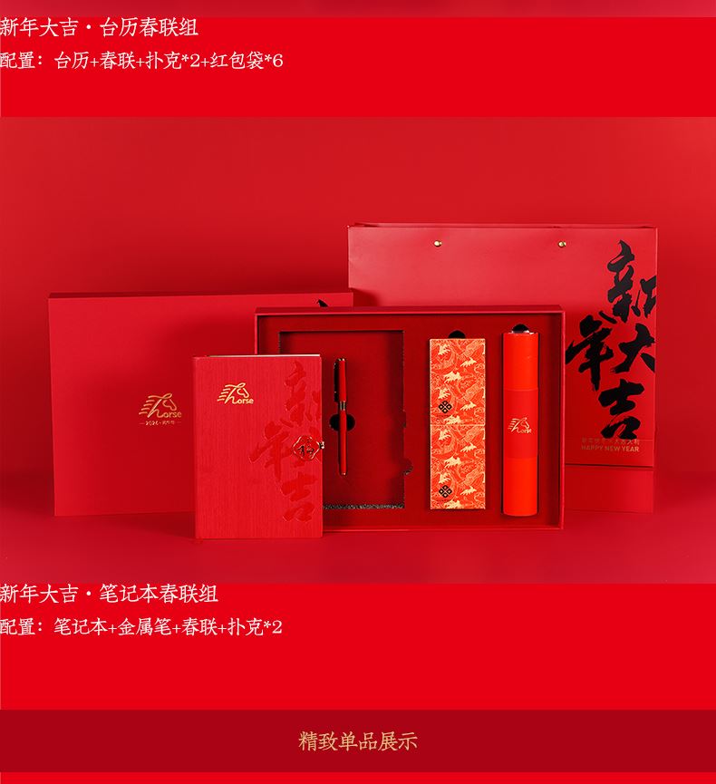 配置:A5福本+签字笔+扑克*2+春联 材质:特种纸+PU+五金+特级白芯 尺寸:福本145*215mm 笔12.5*138mm 扑克99*62mm 春联210*1180mm 包装:礼盒(358*262*53mm)+手提袋
