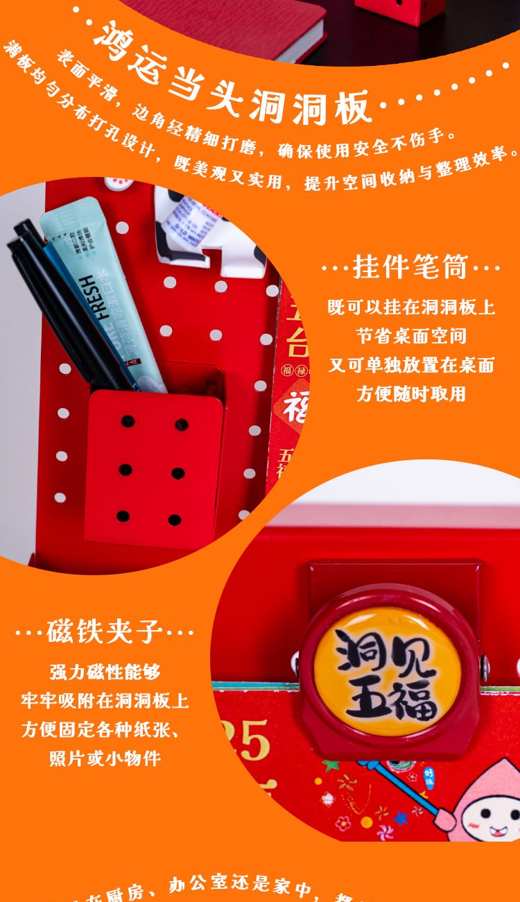 鸿运当头洞洞板*1 23cm*20cm 挂件笔筒*1 6.5cm*5cm 磁铁夹子*1 3.5cm*3cm 记事月历*1 10cm*15cm 13张 包装盒尺寸:27.5*23.3*10.5cm