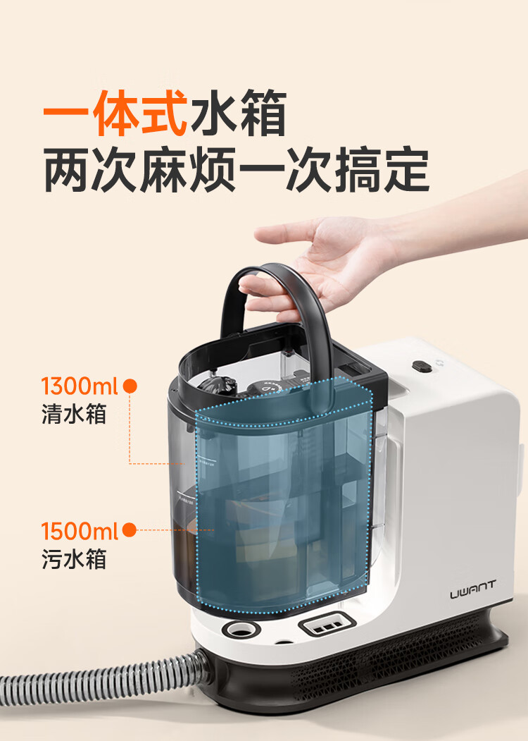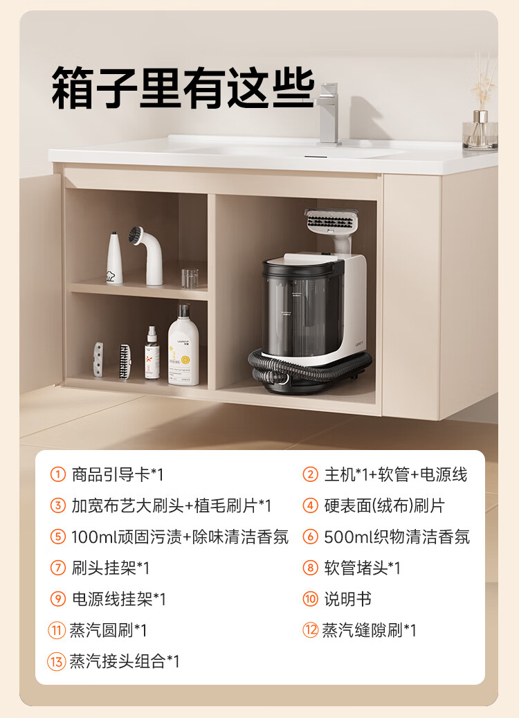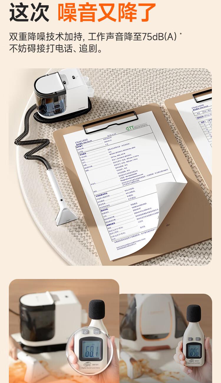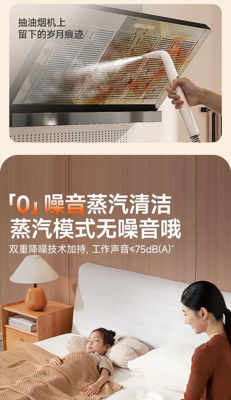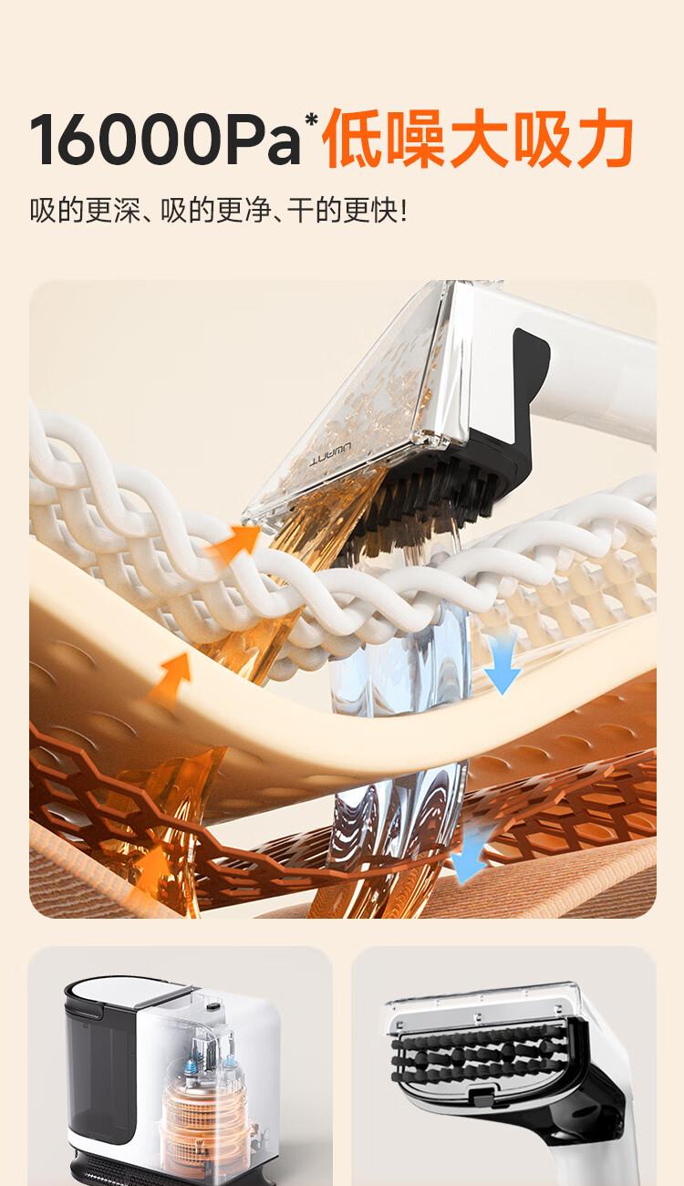 产品类目:友望蒸汽清洁机 产品吸力:16000pa 刷头配置:加宽标准布艺刷 刷片配置:灵动刷片*2 电源线长:3m 软管长度: 1.6m 双重降噪技术加持,工作声音<75dB(A) 16000Pa*低噪大吸力,吸的更深、吸的更净、干的更快!