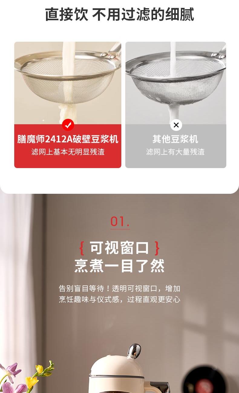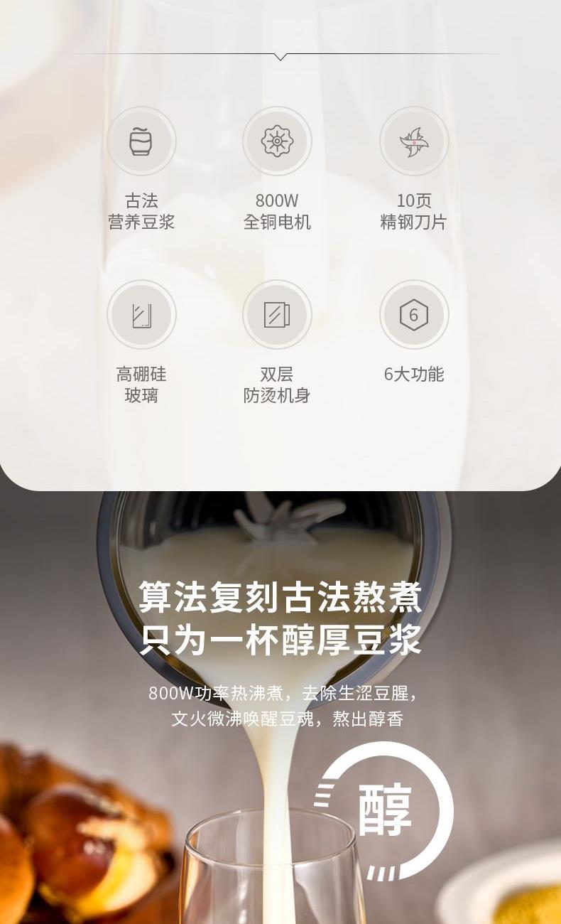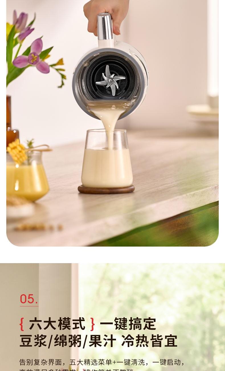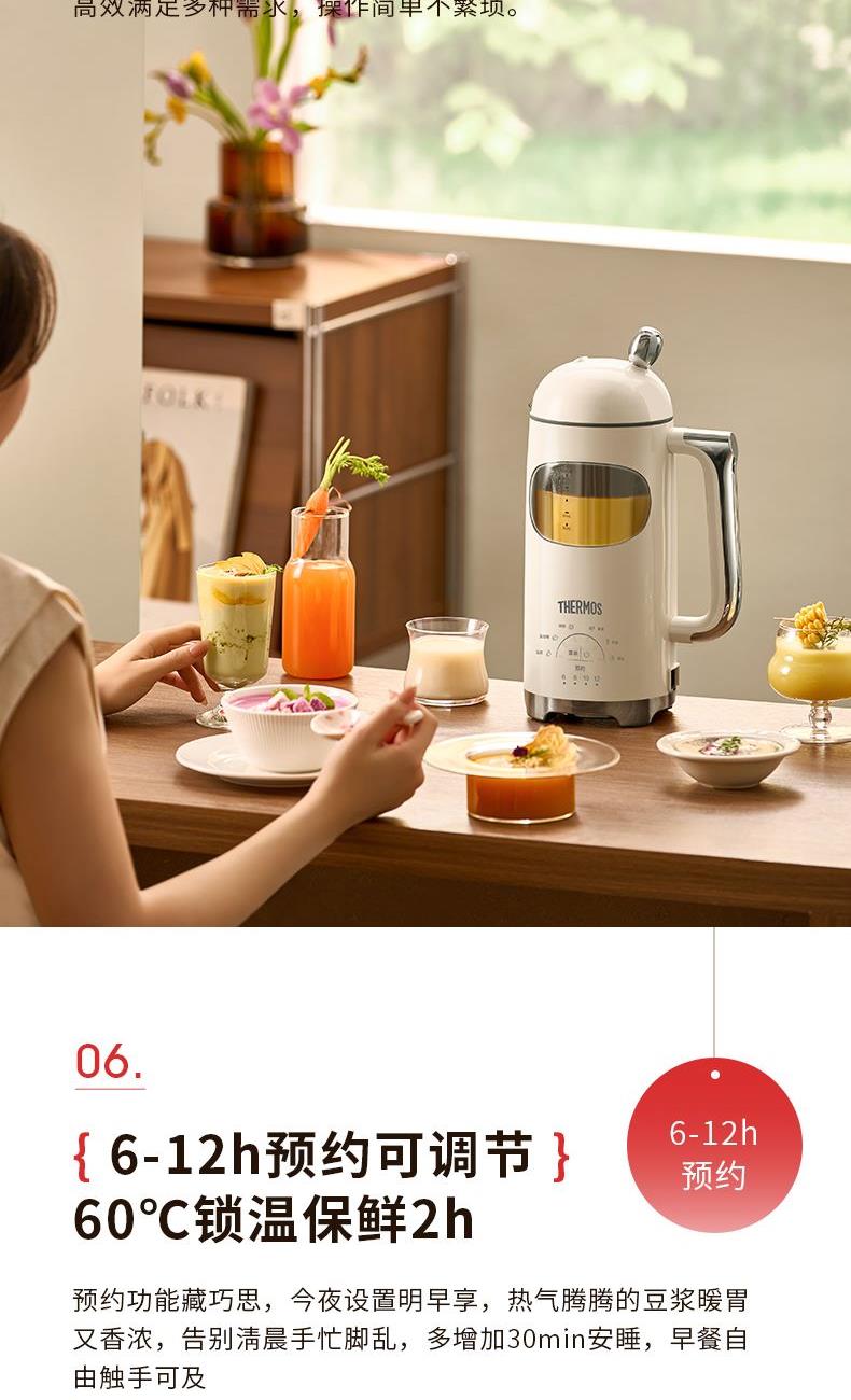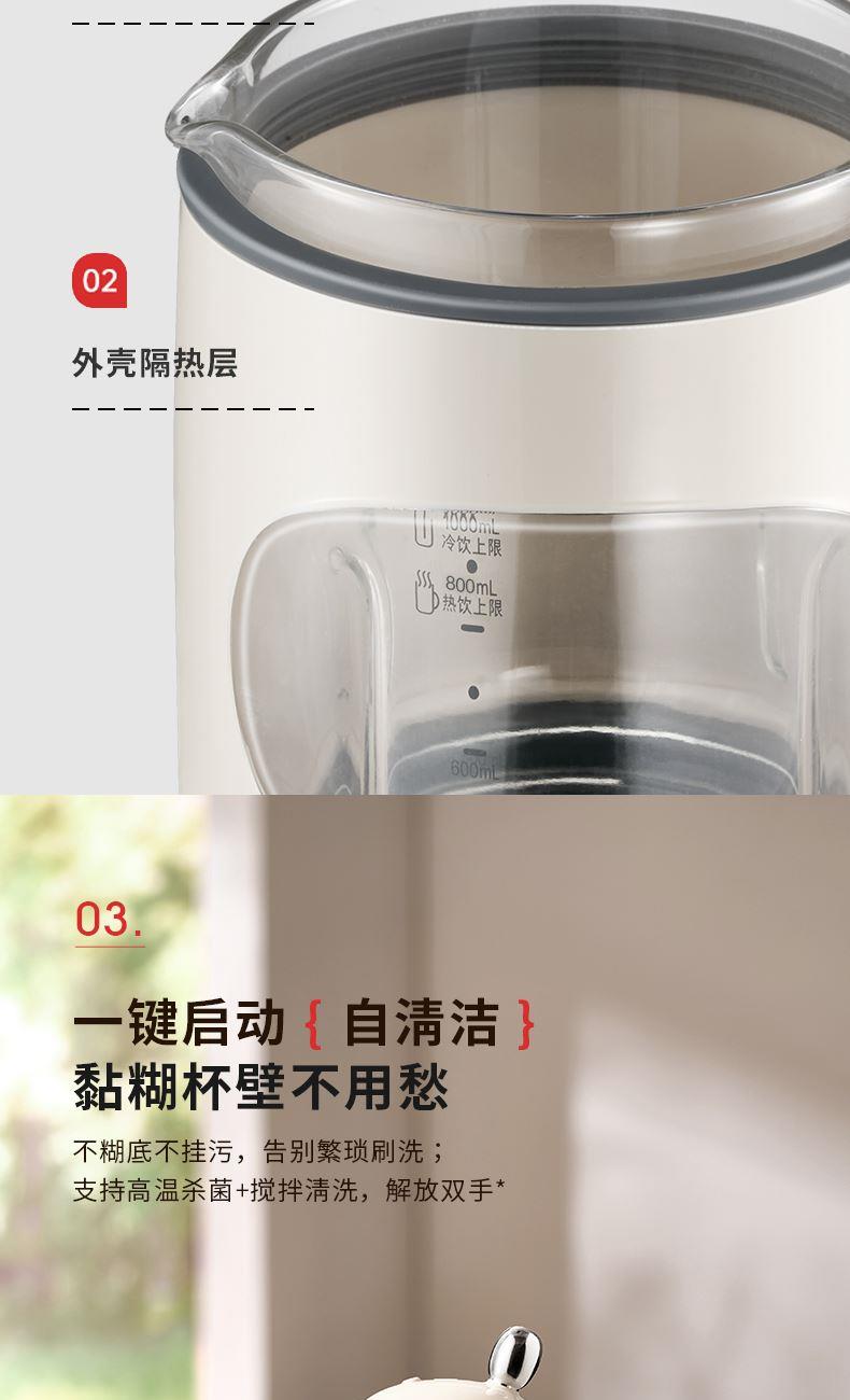 产品型号:EHA-2412A 产品颜色:原白色 额定电压:220V 额定功率:800W(加热)/200W(搅拌) 额定容量:1L(冷饮)/0.8L(热饮) 内胆材质:高硼硅玻璃 操作方式:触控 产品转速:23000R/MIN 预约时间:6-12h 产品尺寸:195*135*321mm 古法营养熬煮豆浆,去除生涩豆腥,熬出醇香 10叶精钢刀头,无死角粉碎食材,口感顺滑无渣感 透明可视窗口,过程直观可见 双层隔热机身,有效防烫更降噪,高硼硅玻璃内层,使用更安心 操作简单易上手,六大模式 一键搞定 6-12h预约可调节,60°C锁温保鲜2小时