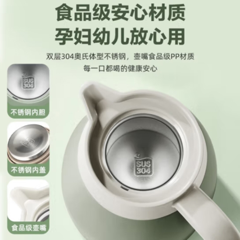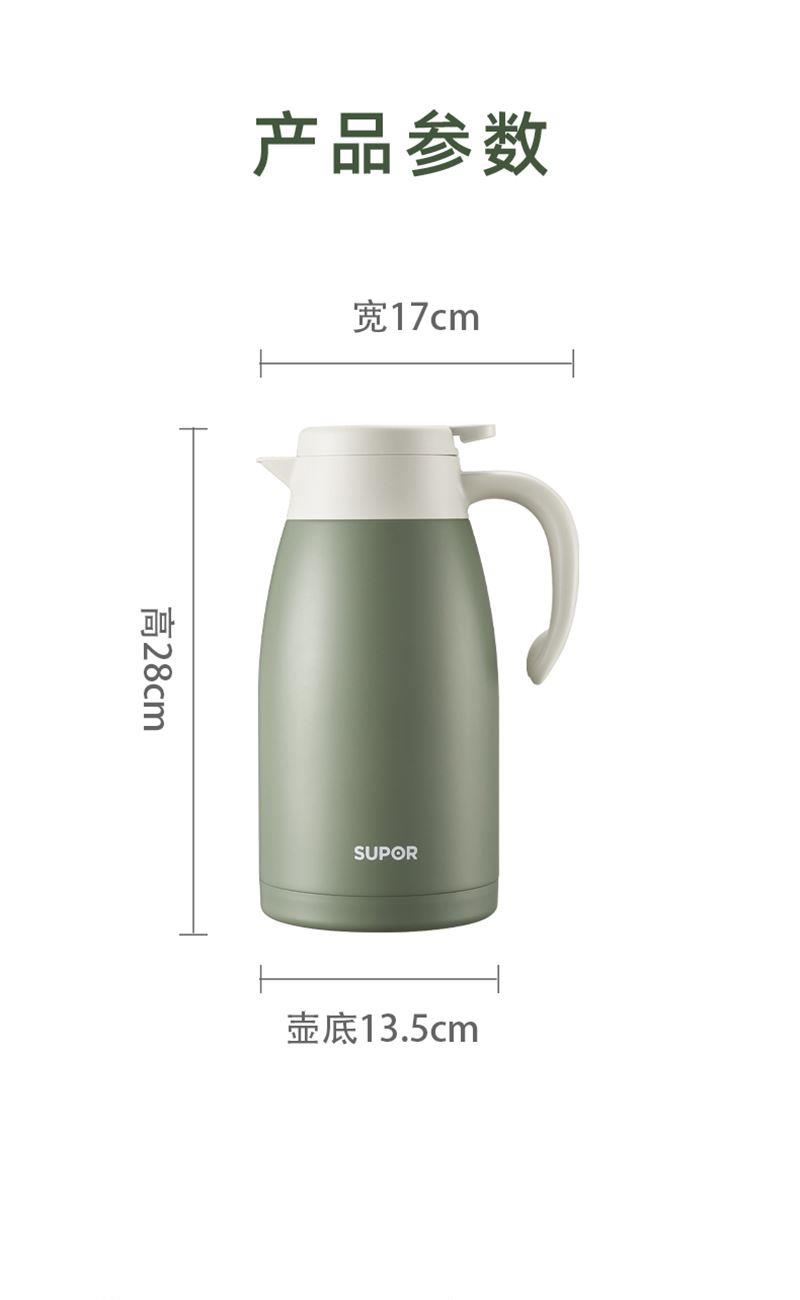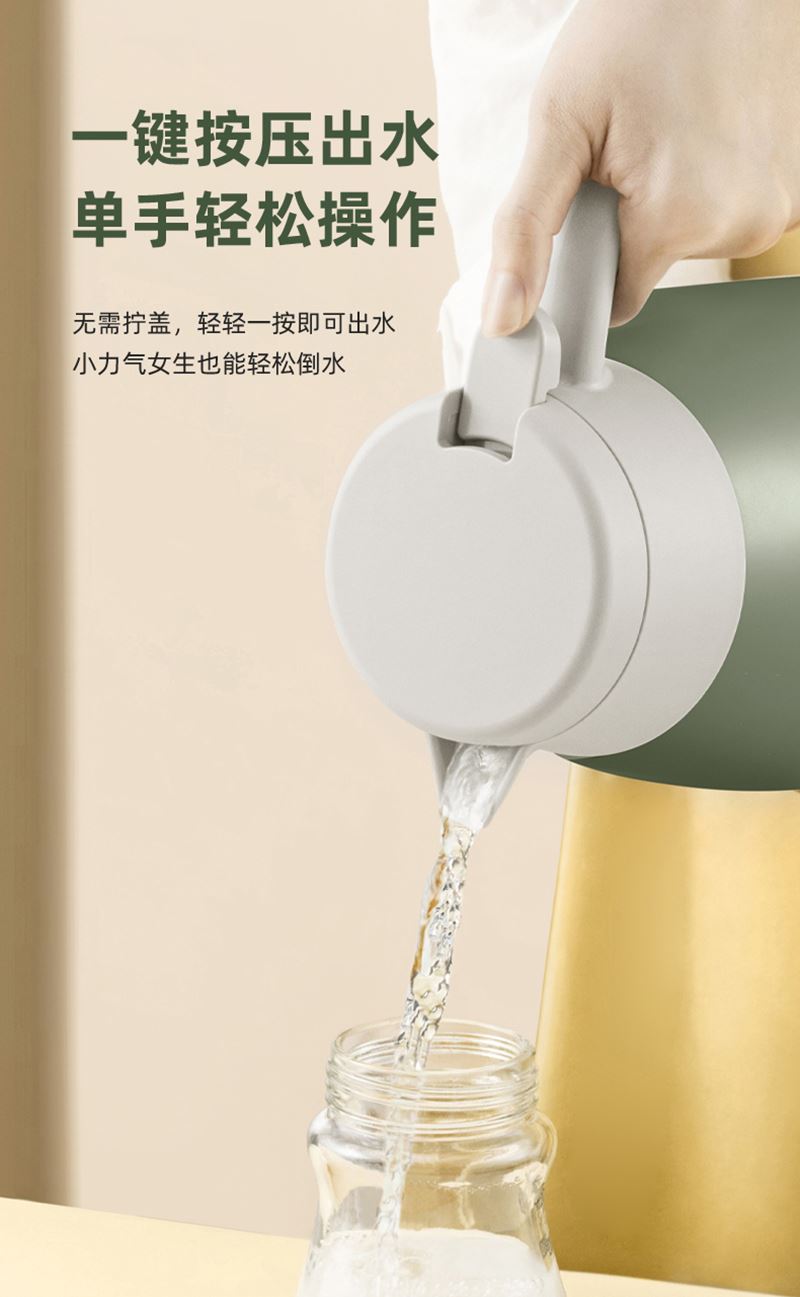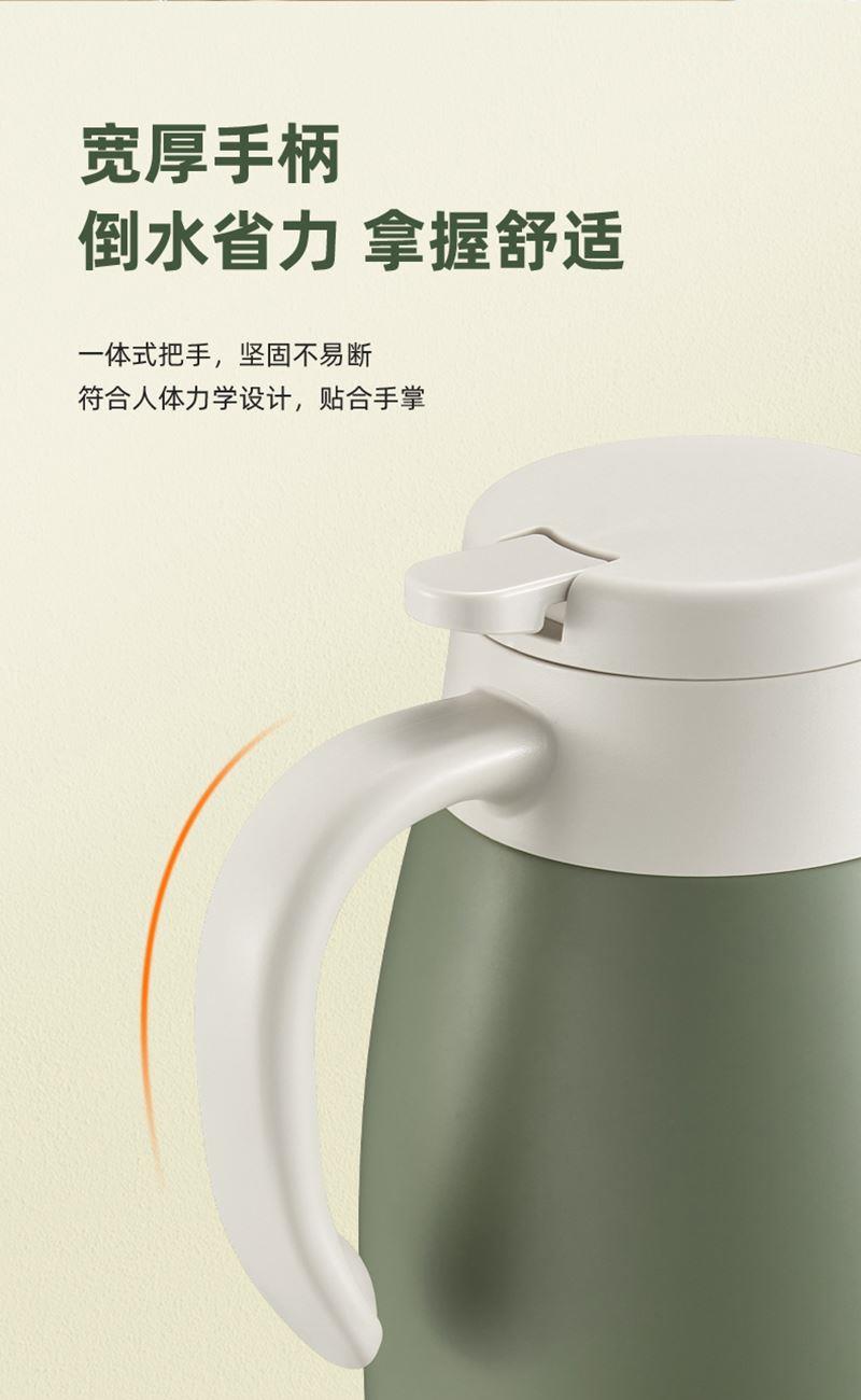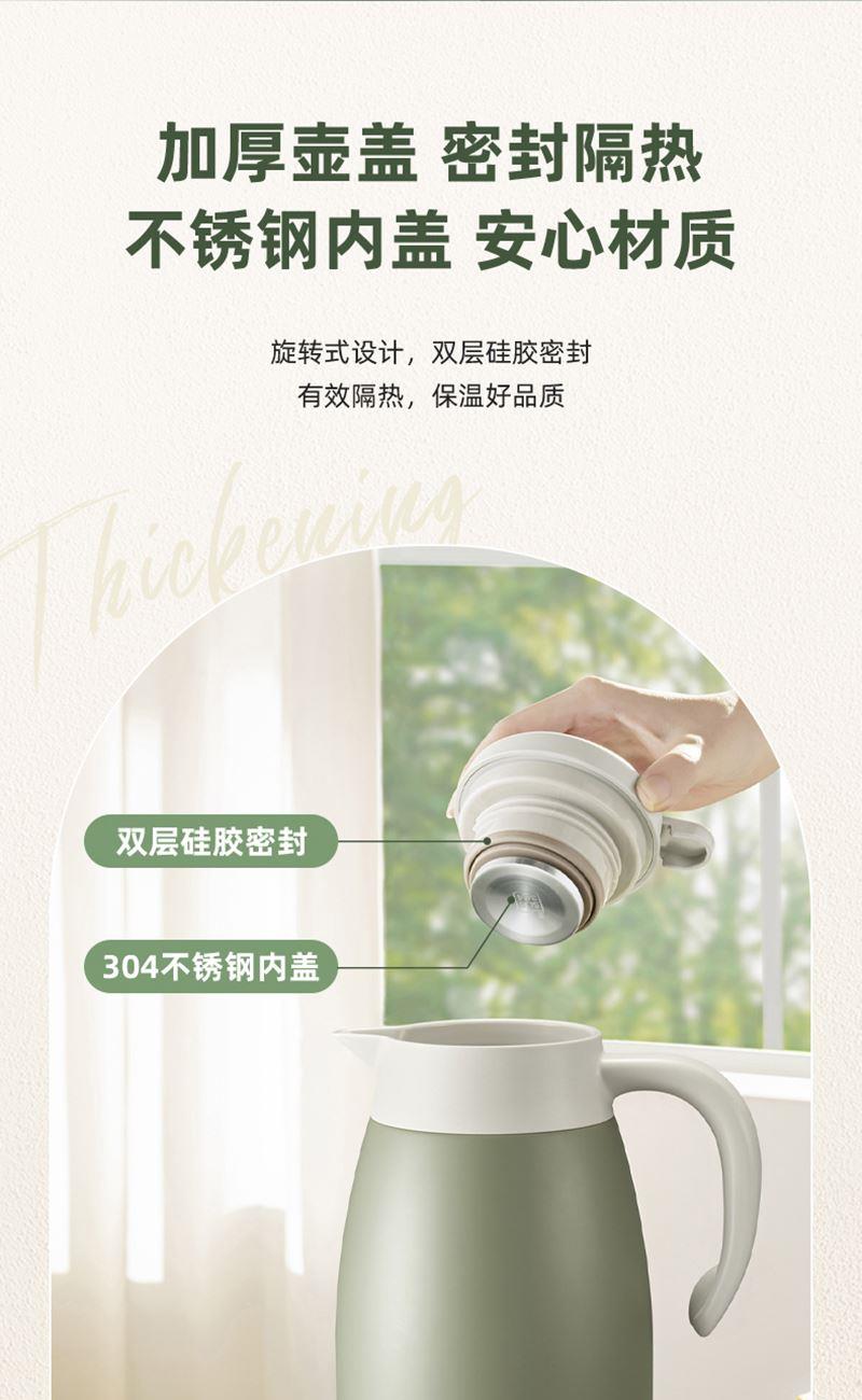容量 2000ml 材质 304不锈钢真空内胆,视频级硅胶 规格参数 代发在库颜色:罗勒绿 商品毛重(kg):1.313 功能卖点 1、强效保温 一键出水; 2、真空304不锈钢内胆内底; 3、鹰式V型壶嘴,出水流畅,断水利落; 3、宽厚手柄 倒水省力; 4、360°密封不漏水; 4、质感哑光壶身; 5、底部防滑硅胶圈。