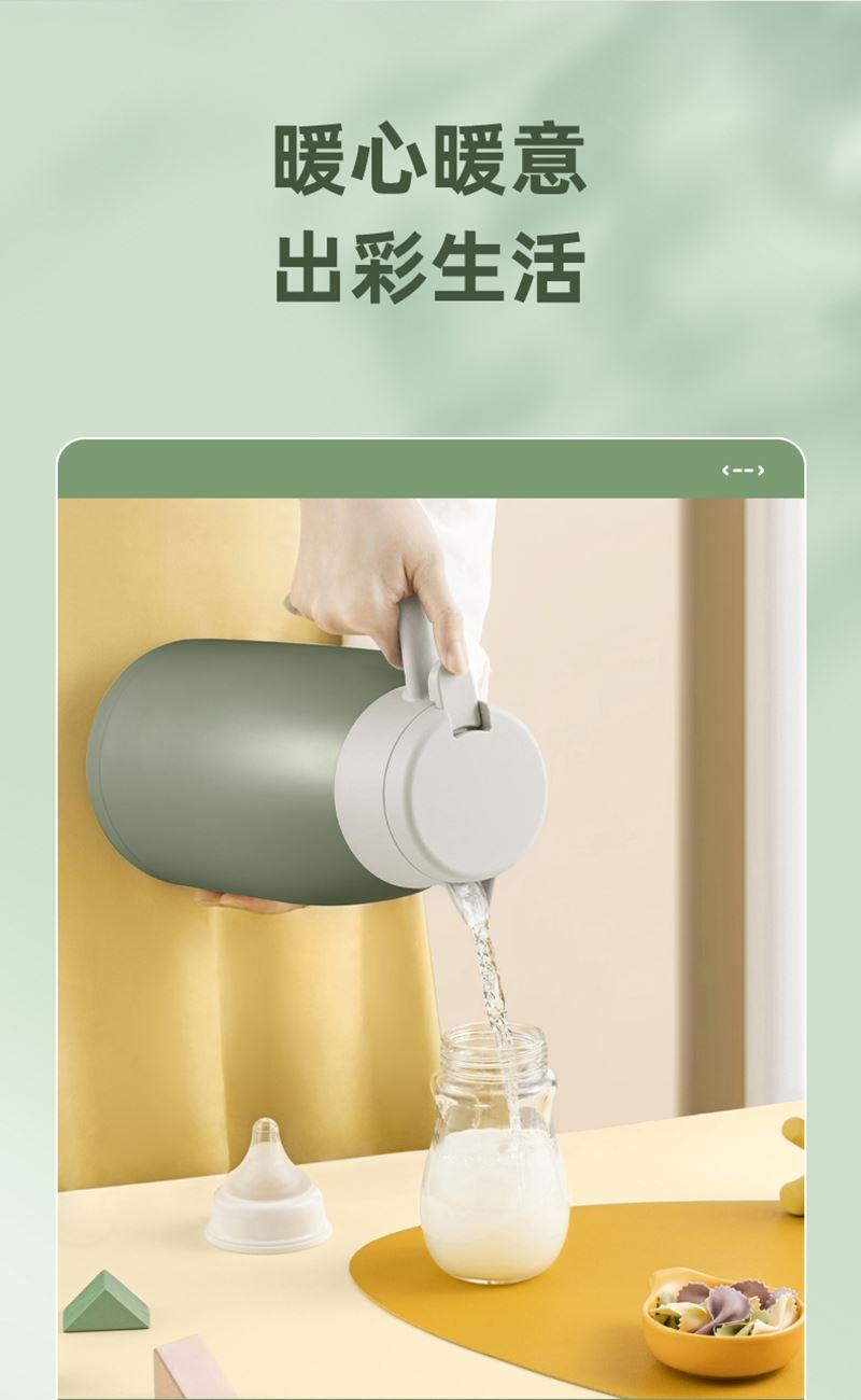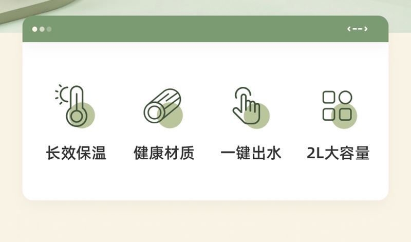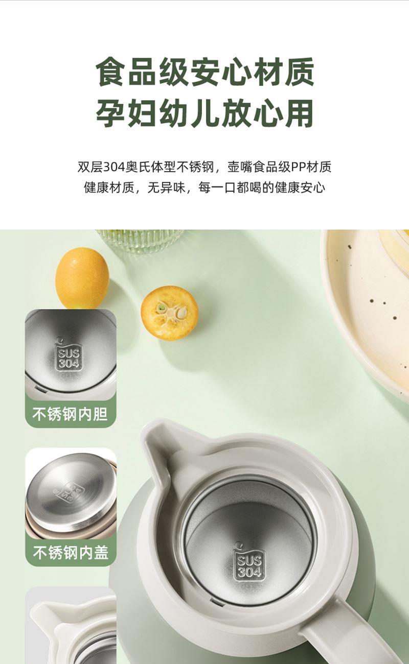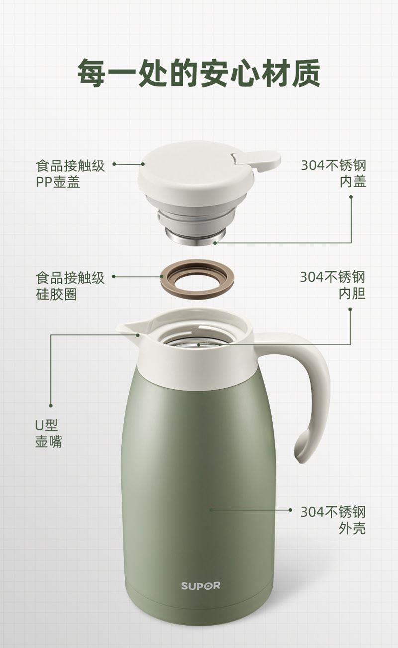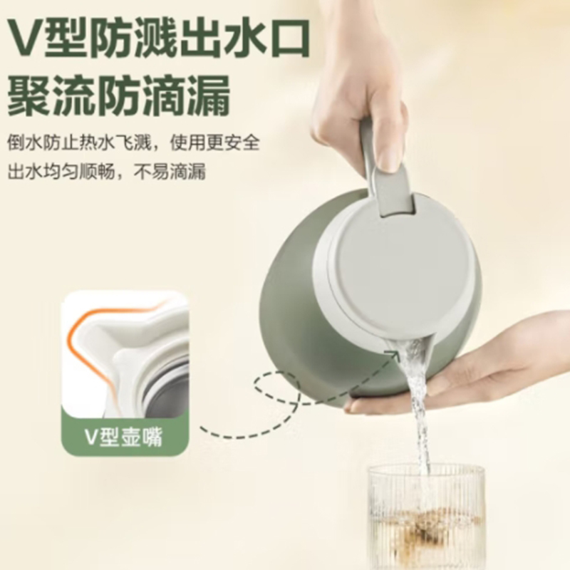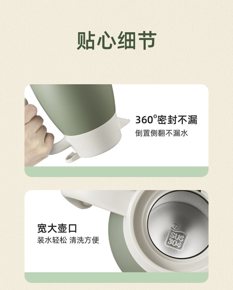 容量 2000ml 材质 304不锈钢真空内胆,视频级硅胶 规格参数 代发在库颜色:罗勒绿 商品毛重(kg):1.313 功能卖点 1、强效保温 一键出水; 2、真空304不锈钢内胆内底; 3、鹰式V型壶嘴,出水流畅,断水利落; 3、宽厚手柄 倒水省力; 4、360°密封不漏水; 4、质感哑光壶身; 5、底部防滑硅胶圈。
