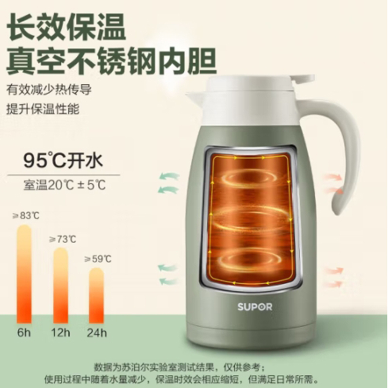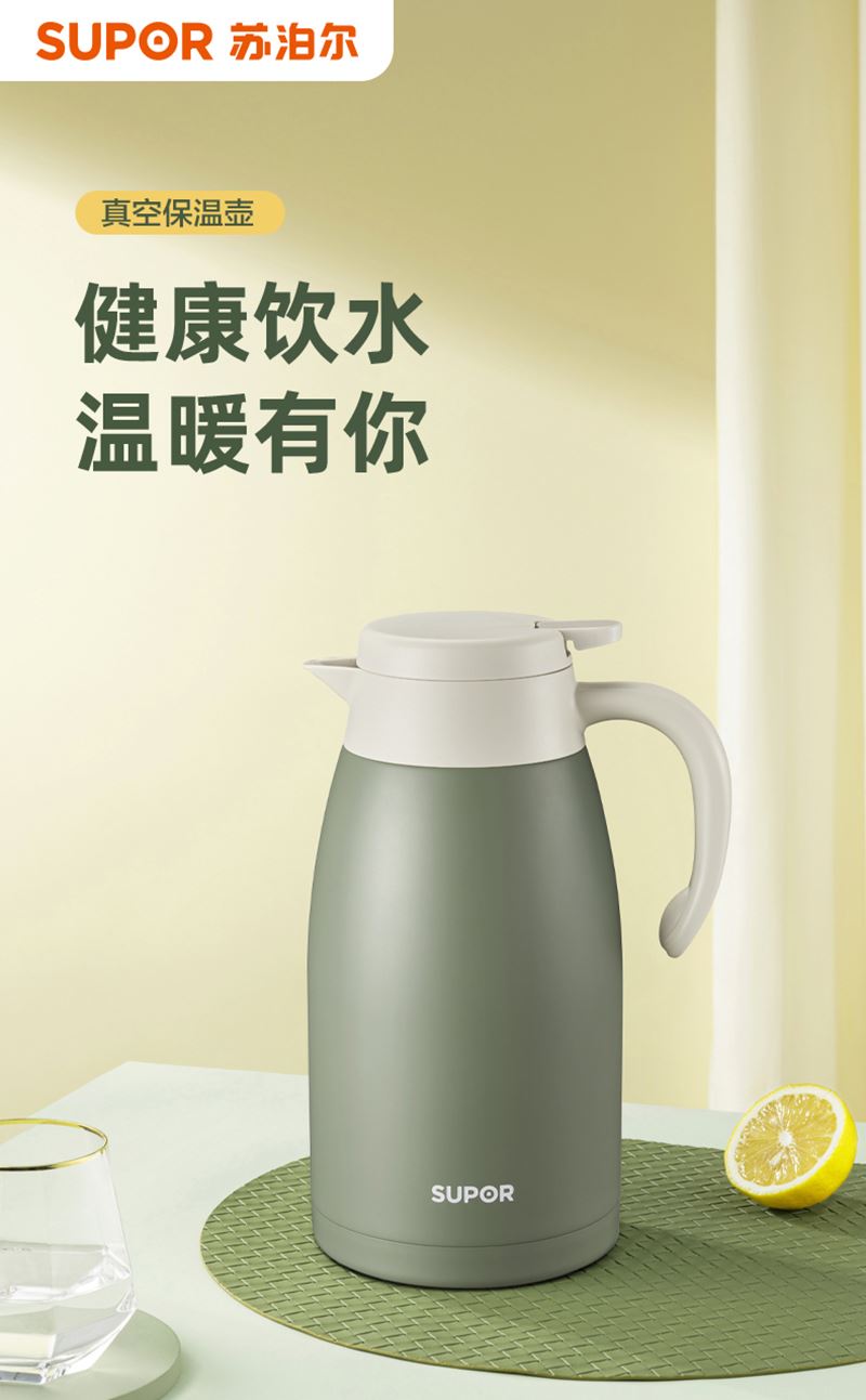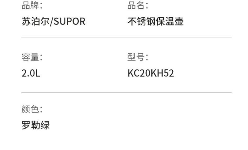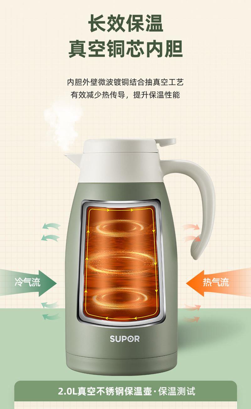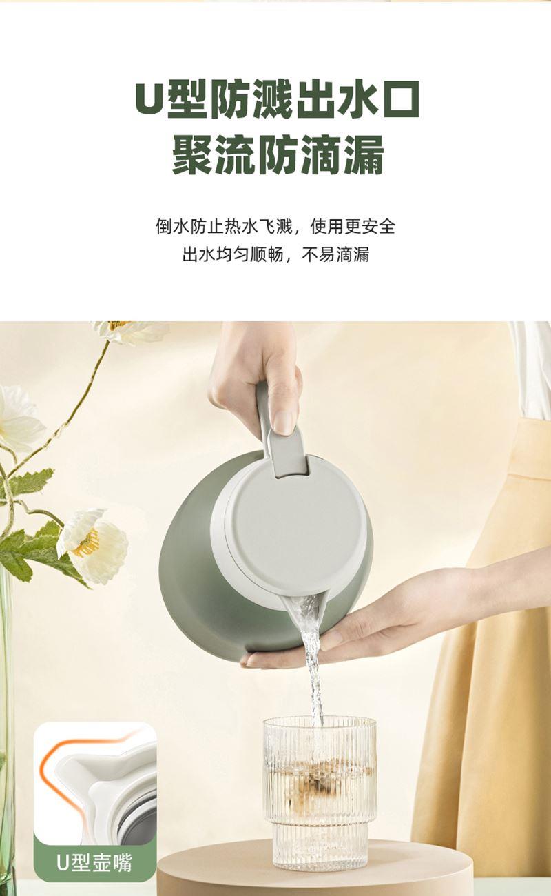 容量 2000ml 材质 304不锈钢真空内胆,视频级硅胶 规格参数 代发在库颜色:罗勒绿 商品毛重(kg):1.313 功能卖点 1、强效保温 一键出水; 2、真空304不锈钢内胆内底; 3、鹰式V型壶嘴,出水流畅,断水利落; 3、宽厚手柄 倒水省力; 4、360°密封不漏水; 4、质感哑光壶身; 5、底部防滑硅胶圈。
