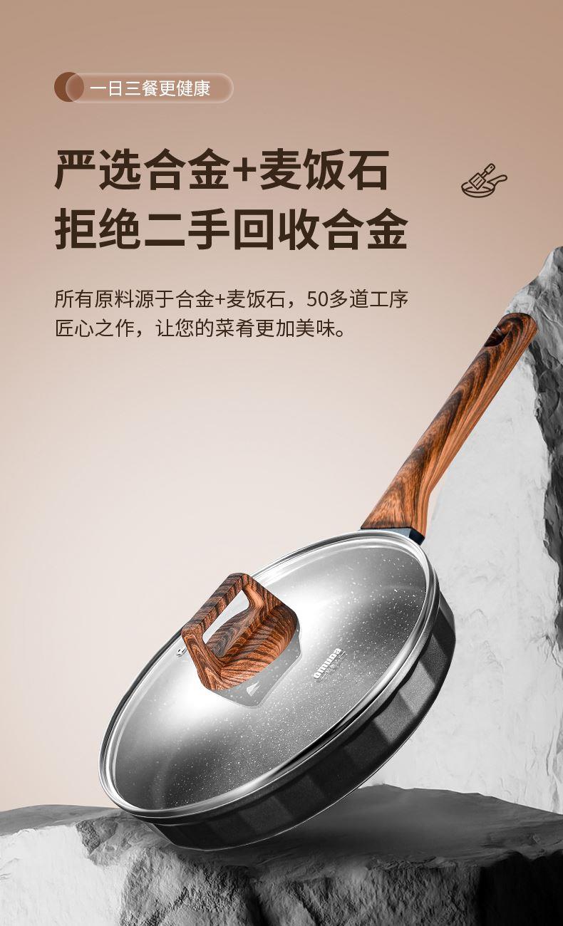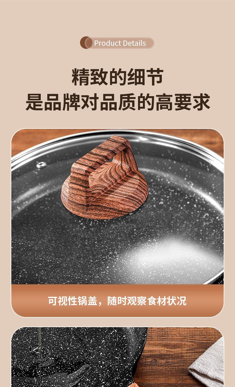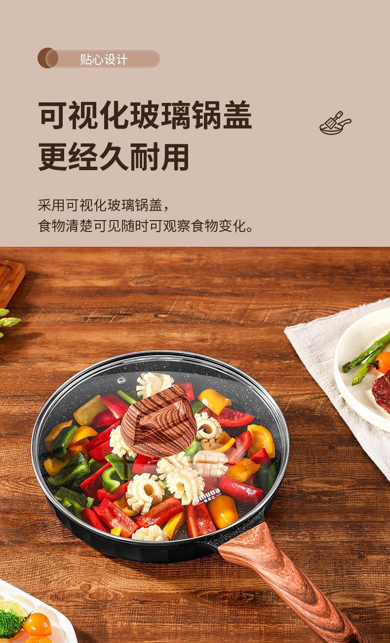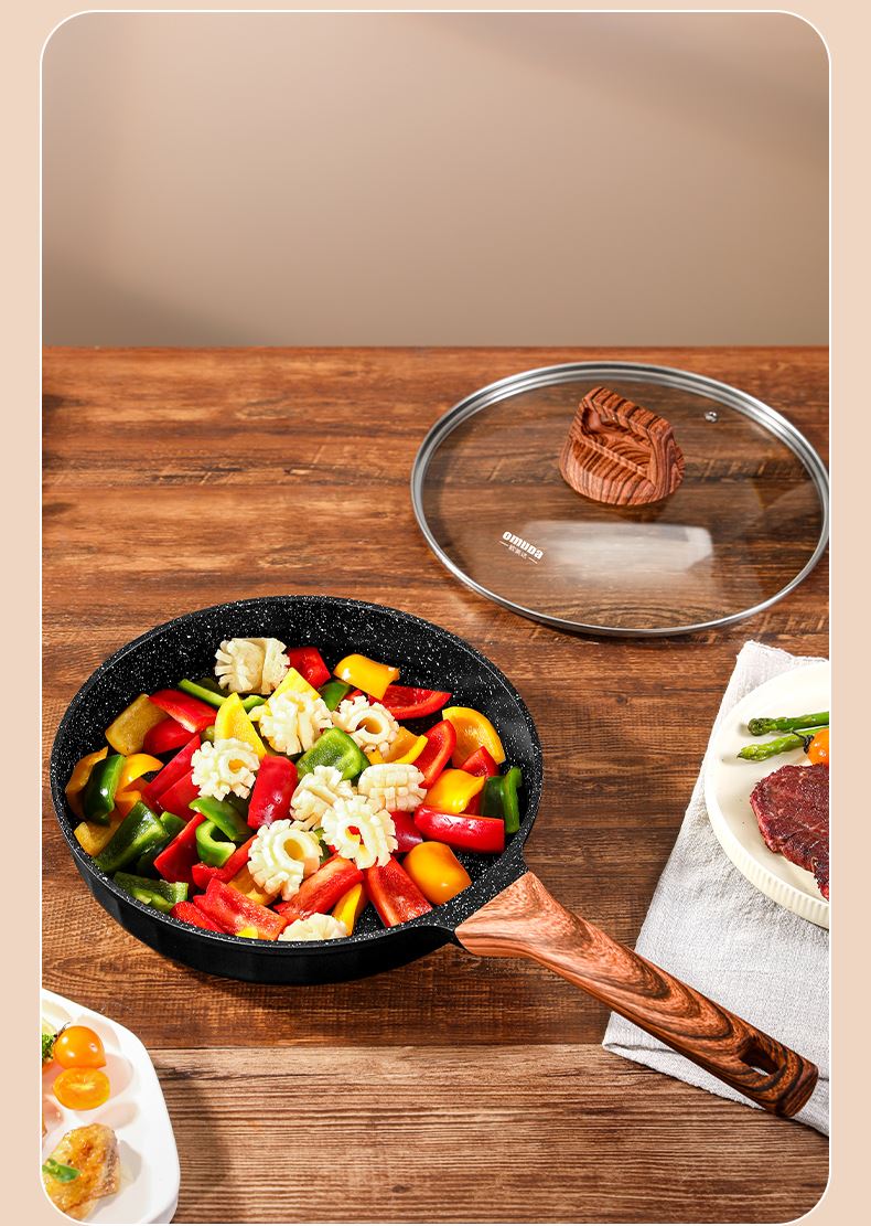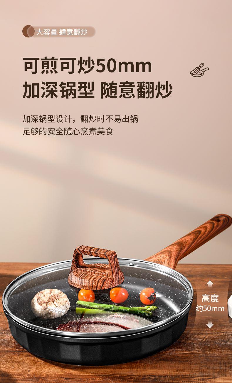 铝压铸 +食品级不粘复底 产品描述: ① 可煎可炒、随意翻炒 ② 一体压铸成型,坚固耐用,无铆钉设计易清洗, ③ 可视锅盖、防烫电木手柄、导流口设计,细节更彰显品质 ④ 兼容各种炉具,从煤气到电磁炉的热源都可以使用,锅底是浇铸不锈钢板,不会发生脱 落现象