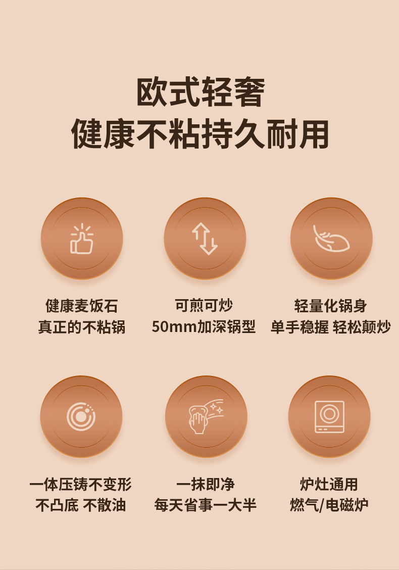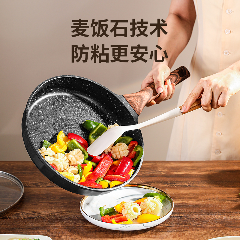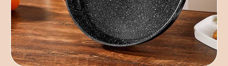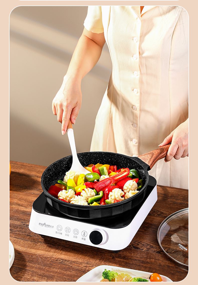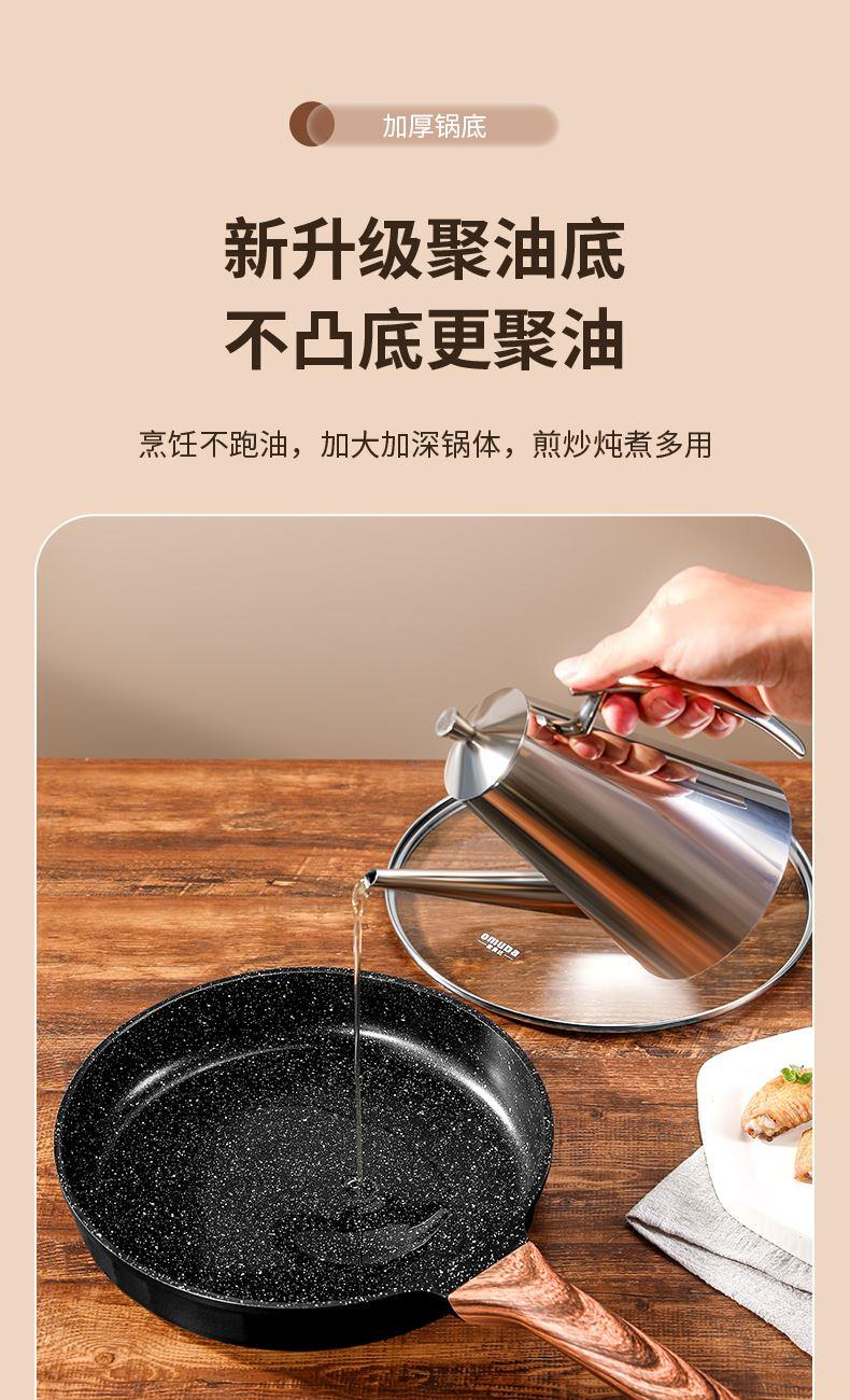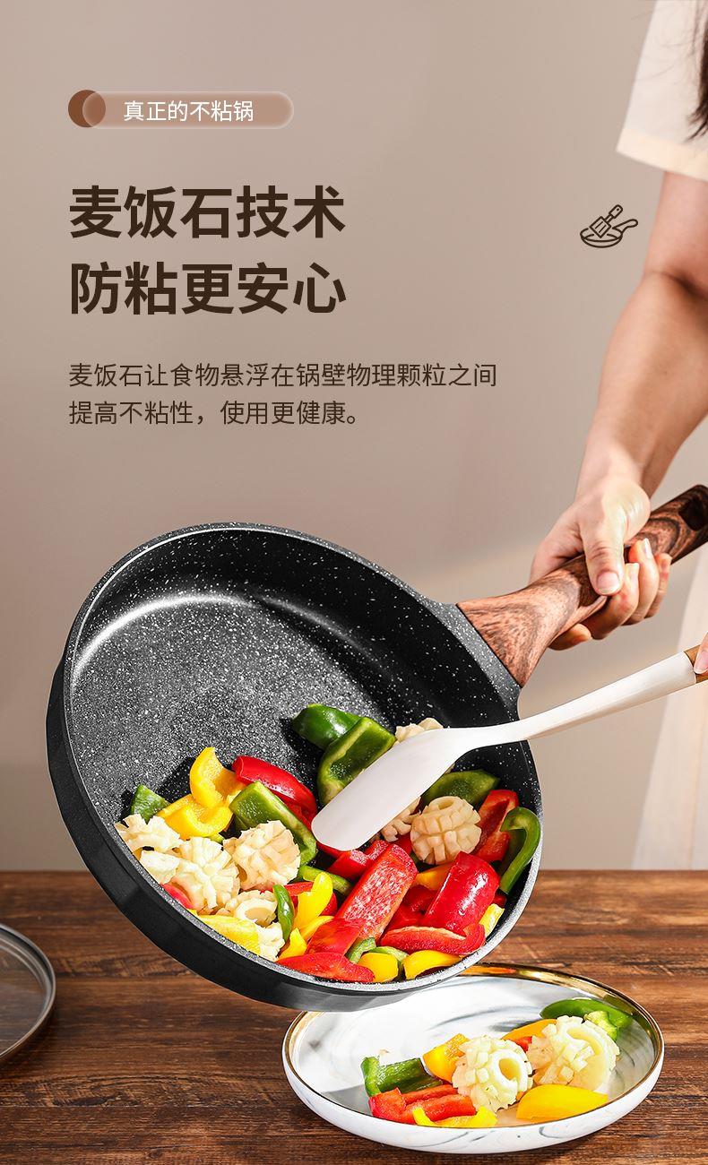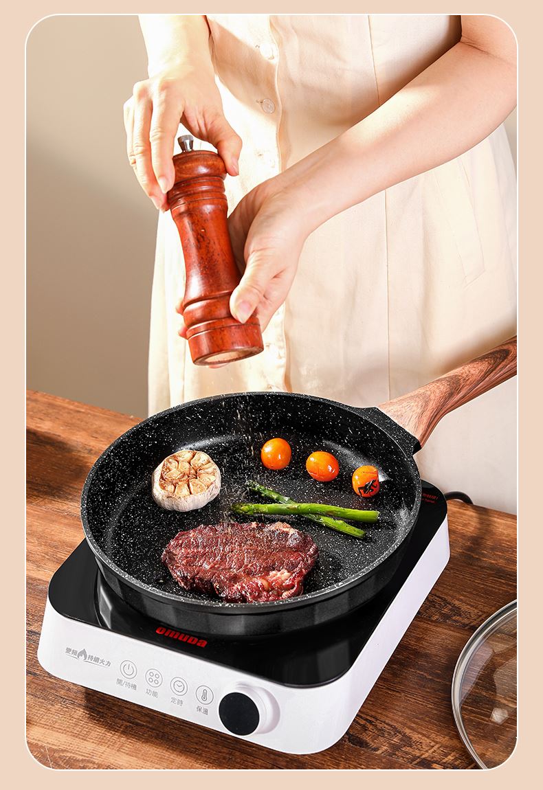 铝压铸 +食品级不粘复底 产品描述: ① 可煎可炒、随意翻炒 ② 一体压铸成型,坚固耐用,无铆钉设计易清洗, ③ 可视锅盖、防烫电木手柄、导流口设计,细节更彰显品质 ④ 兼容各种炉具,从煤气到电磁炉的热源都可以使用,锅底是浇铸不锈钢板,不会发生脱 落现象