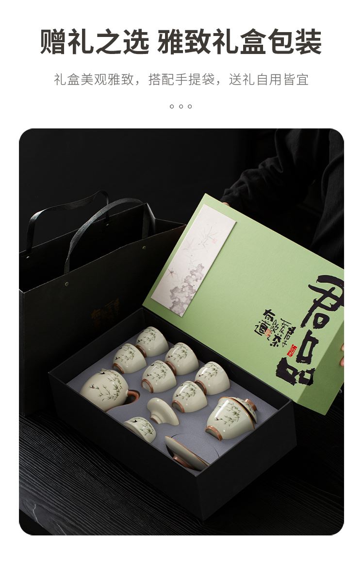 配置:品茗杯*6 盖碗*1 茶海*1 茶漏*1 礼盒*1 手提袋*1 材质:汝窑 礼盒尺寸:40.3cm*25cm*12cm 产品尺寸:盖碗 160ml 茶海 230ml 品茗杯 80ml