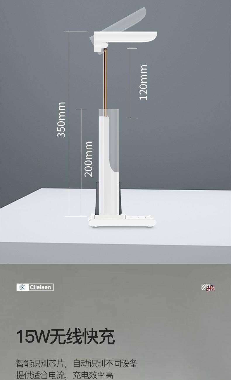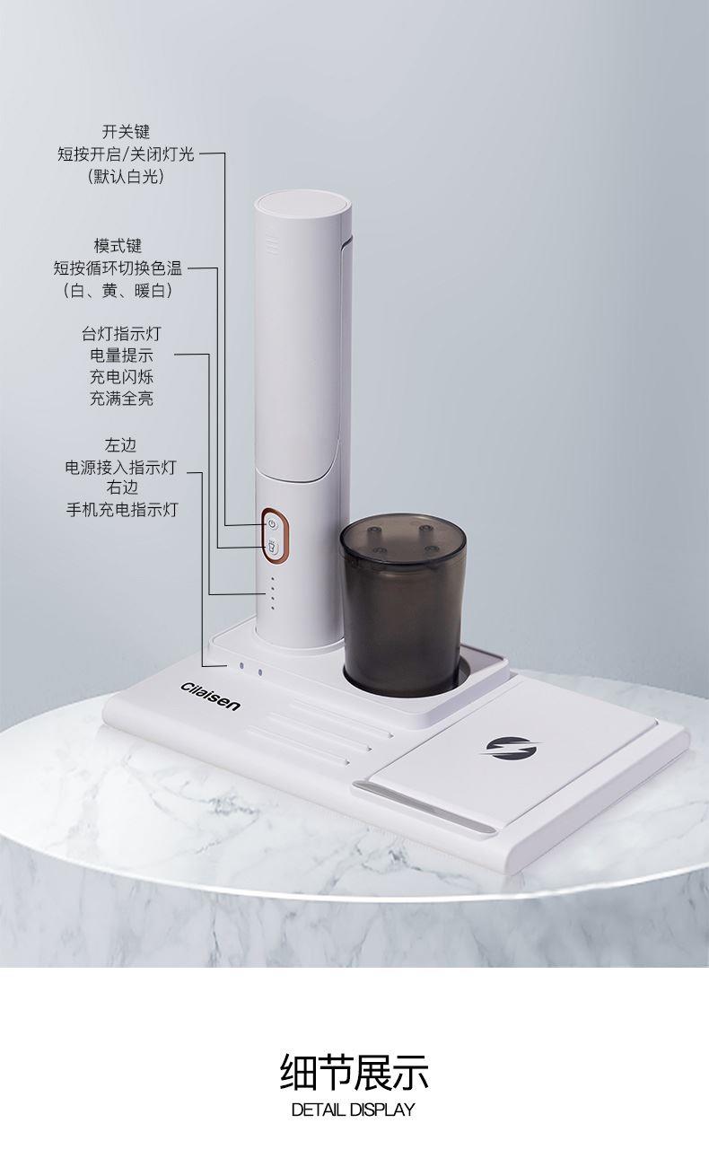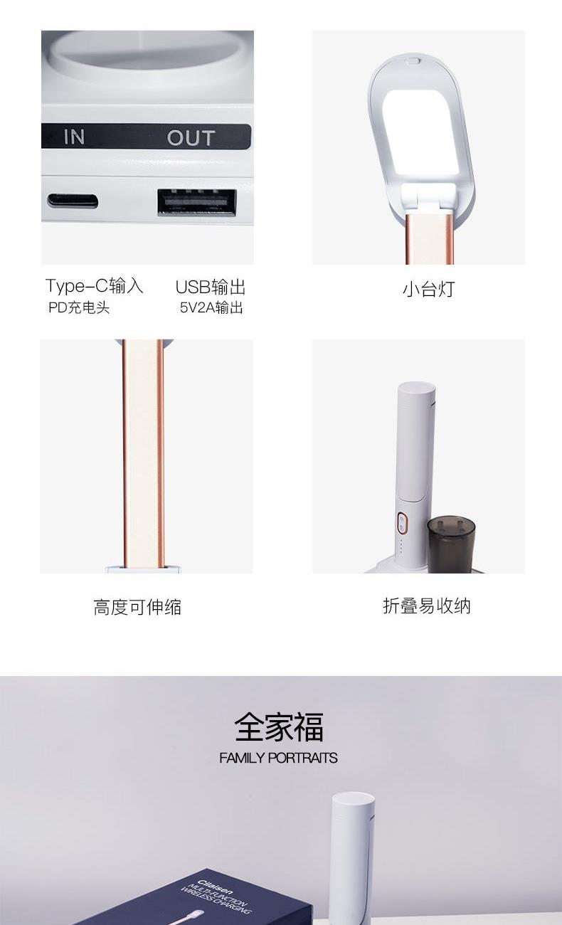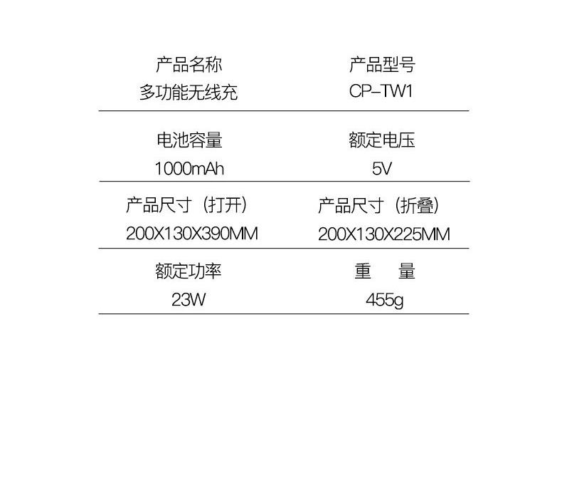 产品参数: 产品型号:CP-TW1 额定电压 : 5V 额定功率:23W 电池容量:1000mAh 商品条码 : 6972831860716 产品毛重 : 605g 产品尺寸:200X130X225mm(折叠尺寸) 彩盒尺寸:235X150X85mm 包装清单:无线充电底座x1、折叠台灯x1、笔筒x1、 充电线x1、说明书x1