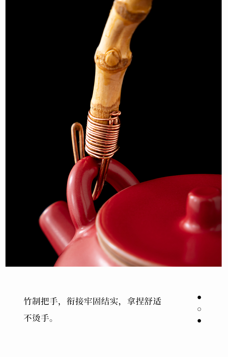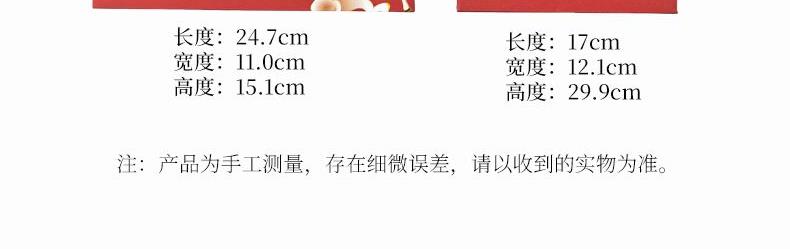 茶杯口径:6.8cm高度:5.6cm容量:100ml, 提梁壶口径:5.3cm高度:15.9cm容量:260ml, 礼盒长度:24.7cm宽度:11.0cm高度:15.1cm。