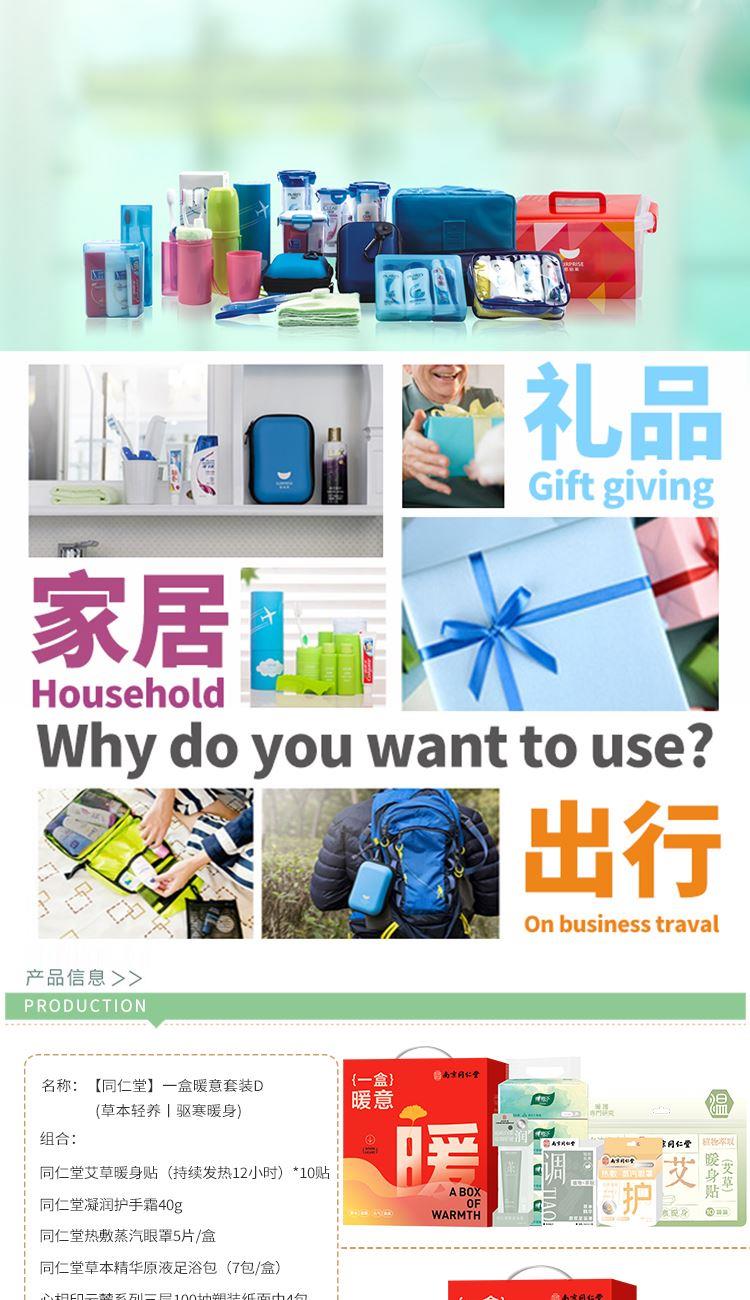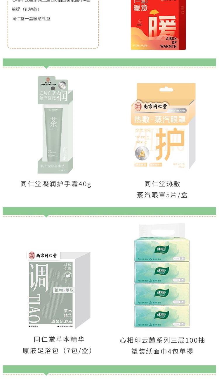 同仁堂艾草暖身贴(持续发热12小时)*10贴 同仁堂凝润护手霜40g 同仁堂热敷蒸汽眼罩5片/盒 同仁堂草本精华原液足浴包(7包/盒) 心相印云麓系列三层100抽塑装纸面巾4包单提(包销款) 思珀莱一盒暖意礼盒
