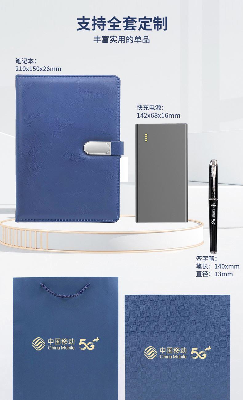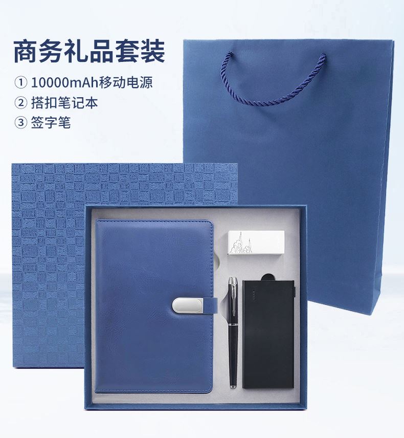 礼盒配置 : A5搭扣硬皮PU皮笔记本 金属烤漆签字笔 10000mAh移动电源 包装盒尺寸:278x256x45mm 手提袋尺寸:271x307x55mm 箱重:约32kg/箱
