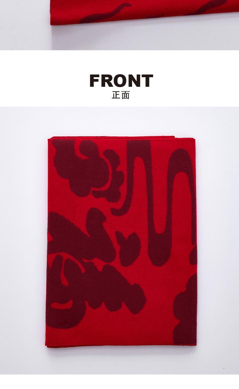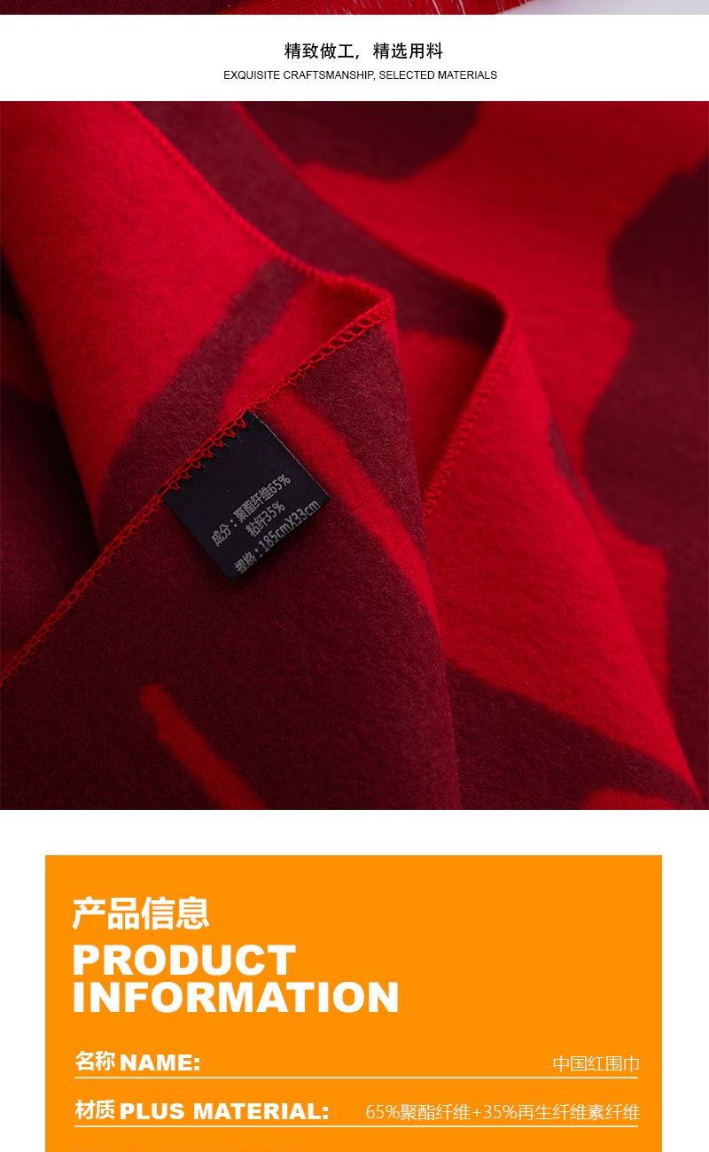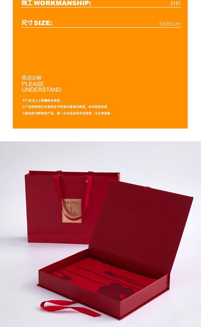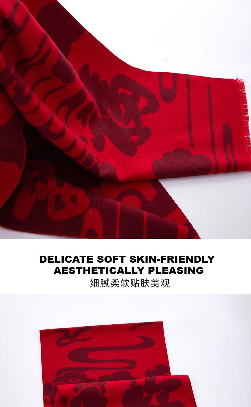 默认OPP袋包装,如需要礼盒装请与我们联系。 面料:65%聚酯纤维+35%再生纤维素纤维 尺寸:33x185cm 卖点: 1、采用新型再生纤维素纤维材质,极度细腻柔软。 2、中国红祥云设计,寓意吉祥喜庆。 3、搭配精美礼盒。