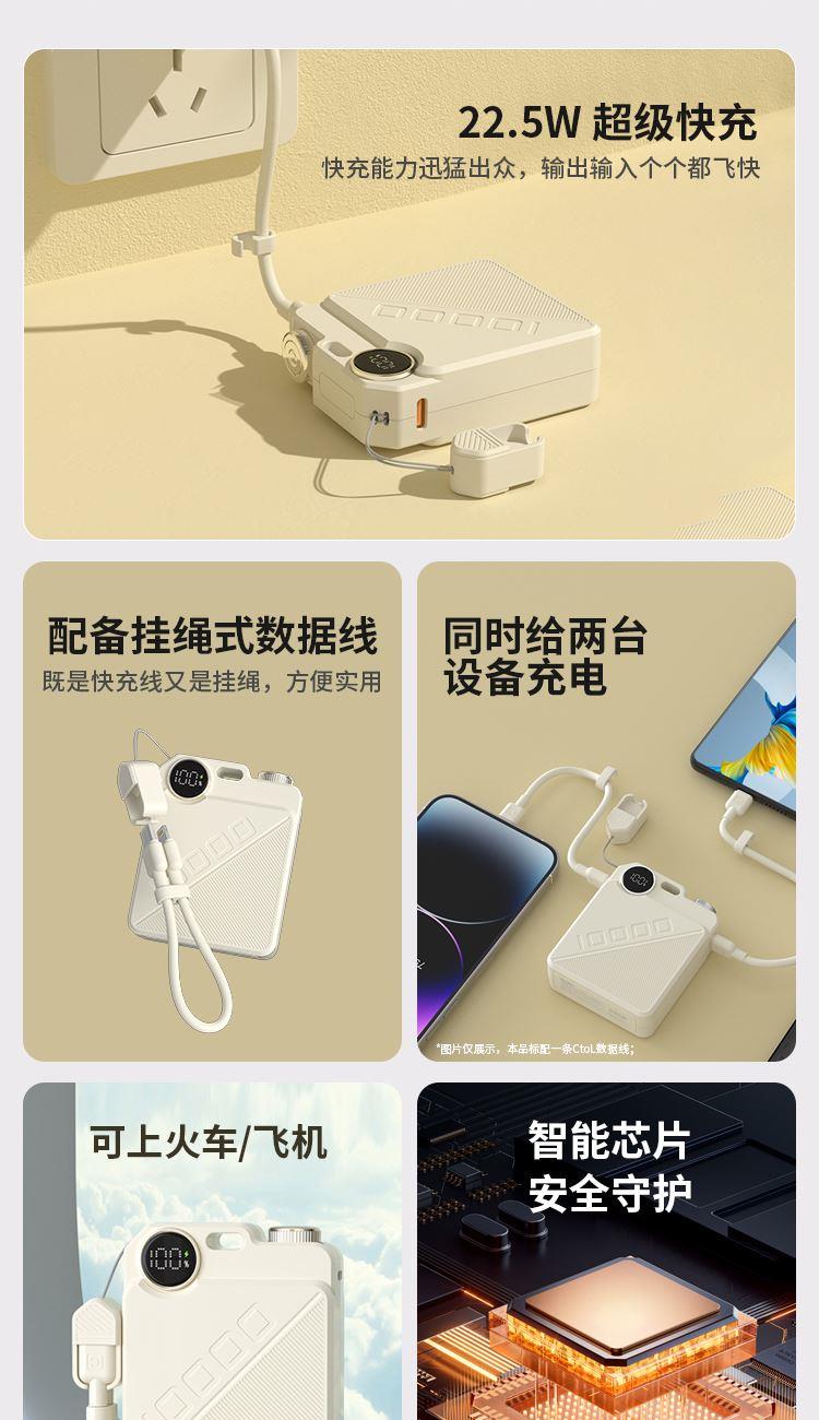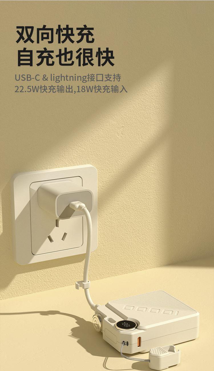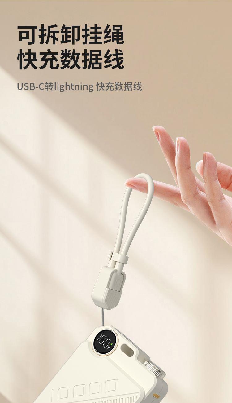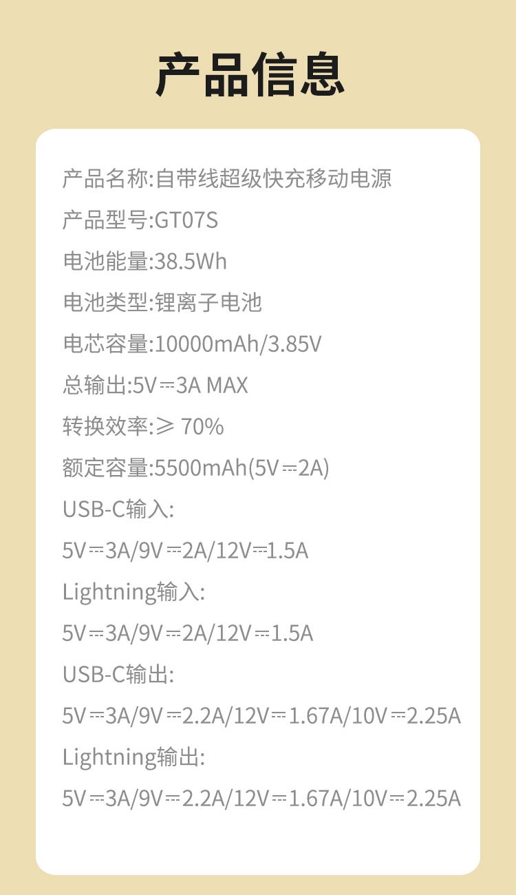 电池能量:38.5Wh 转换效率:≥ 70% 电芯容量:10000mAh/3.85V 电池类型:锂离子电池 总输出:5V-3A Max 额定容量:5500mAh(5V-2A) USB-C输入:5V-3A/9V-2A/12V-1.5A Lightning输入:5V-3A/9V-2A/12V-1.5A USB-C输出:5V-3A/9V-2.2A/12V-1.67A/10V-2.25A Lightning输出:5V-3A/9V-2.2A/12V-1.67A/10V-2.25A 挂绳式快充数据线、USB-C & lightning端口双向快充 迷你身材、10000mAh大容量体型小巧、的出行伴侣 USB-C & lightning接囗支持、22.5W快充输出,18W快充输入 国标CCC安全认证,安心使用 可拆卸挂绳、快充数据线 可同时为、两台设备充电 LED电量显示屏、电量一目了然