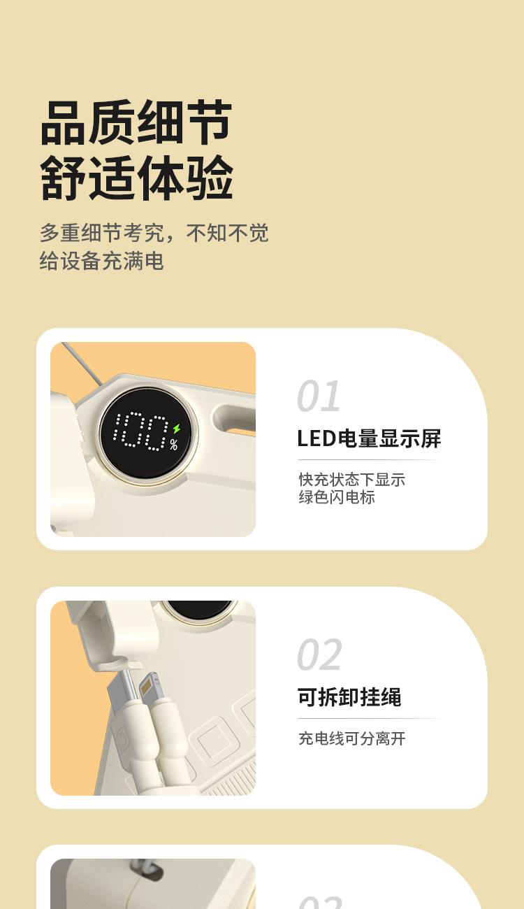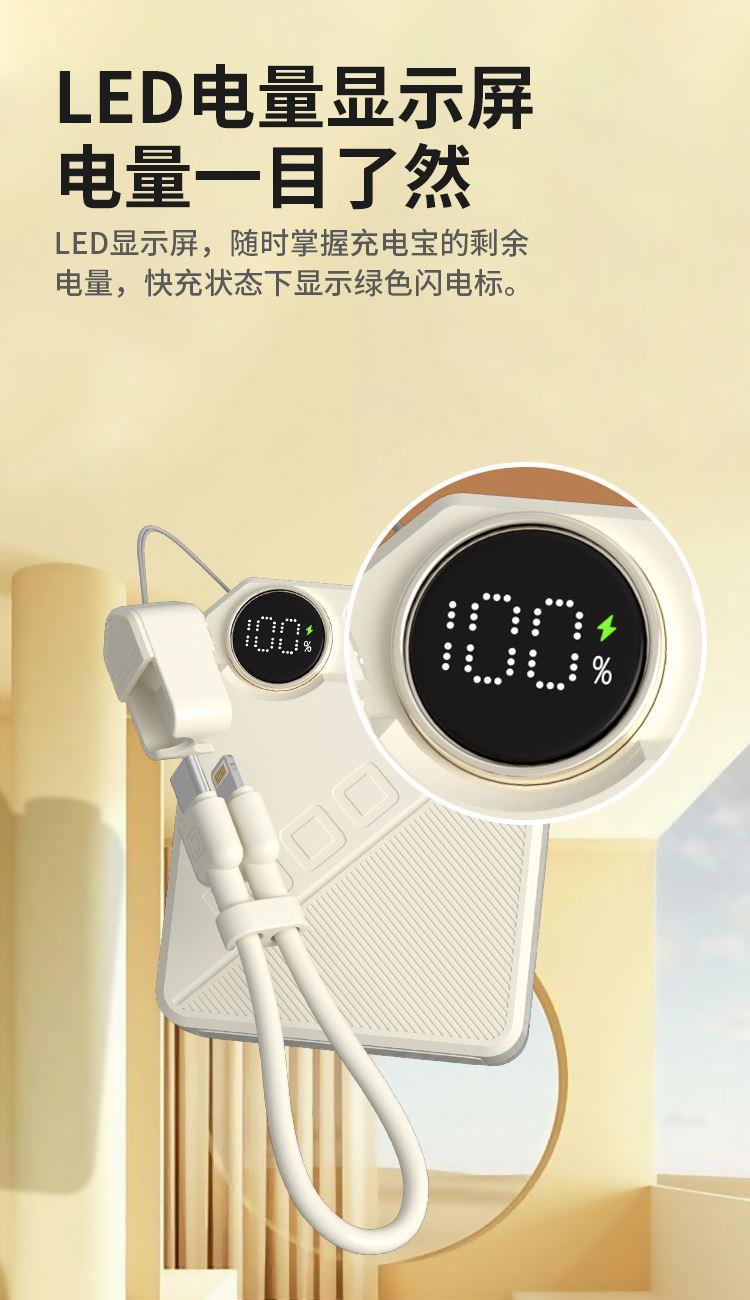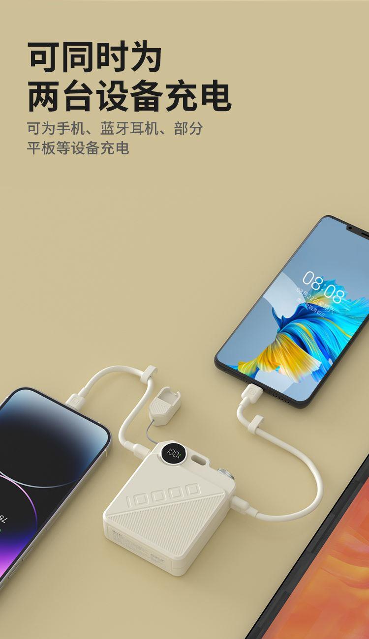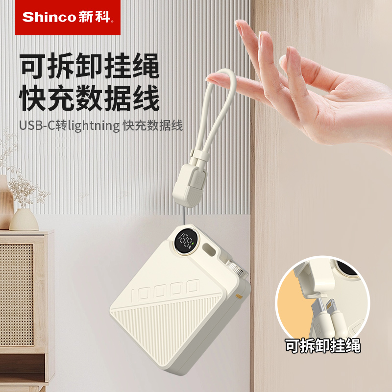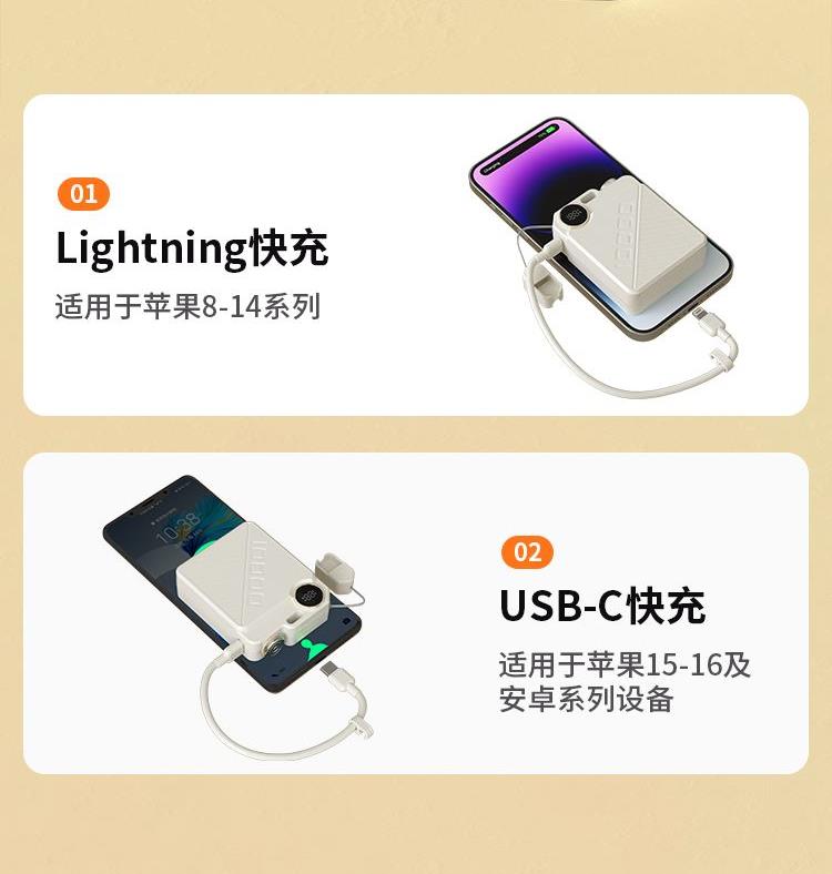 电池能量:38.5Wh 转换效率:≥ 70% 电芯容量:10000mAh/3.85V 电池类型:锂离子电池 总输出:5V-3A Max 额定容量:5500mAh(5V-2A) USB-C输入:5V-3A/9V-2A/12V-1.5A Lightning输入:5V-3A/9V-2A/12V-1.5A USB-C输出:5V-3A/9V-2.2A/12V-1.67A/10V-2.25A Lightning输出:5V-3A/9V-2.2A/12V-1.67A/10V-2.25A 挂绳式快充数据线、USB-C & lightning端口双向快充 迷你身材、10000mAh大容量体型小巧、的出行伴侣 USB-C & lightning接囗支持、22.5W快充输出,18W快充输入 国标CCC安全认证,安心使用 可拆卸挂绳、快充数据线 可同时为、两台设备充电 LED电量显示屏、电量一目了然