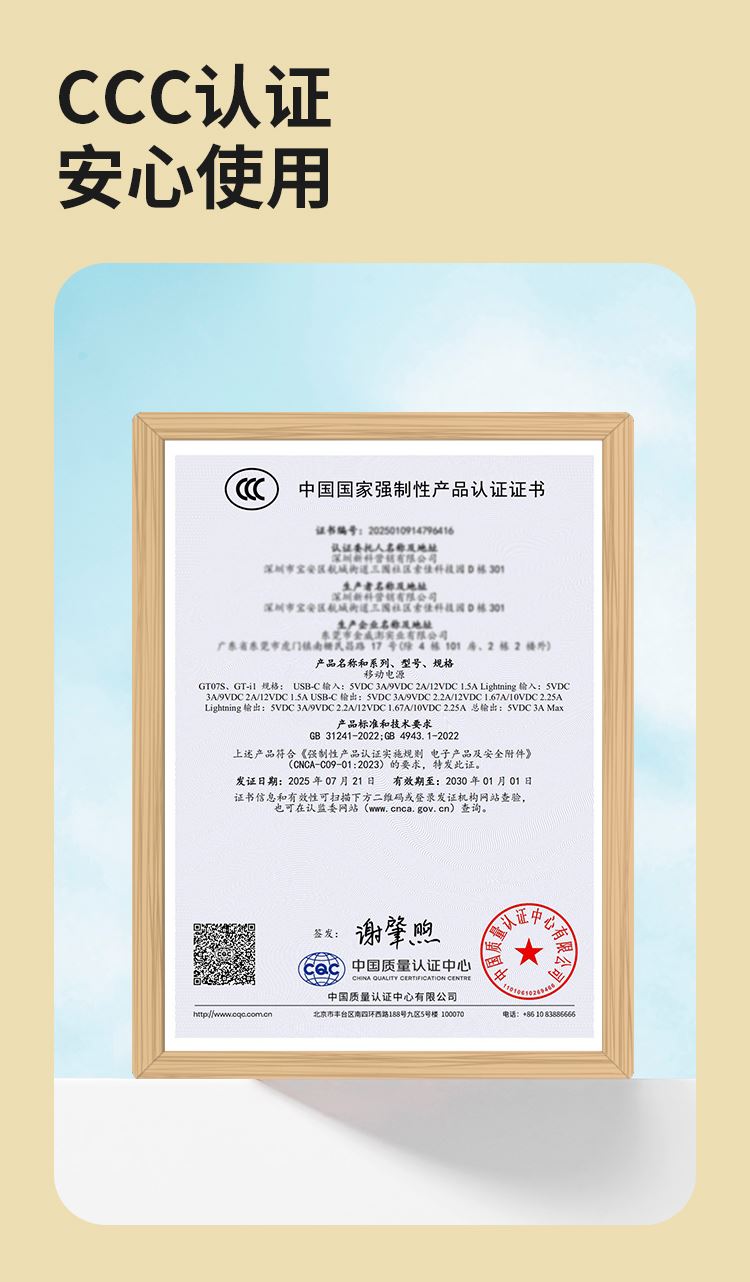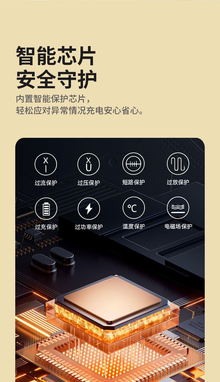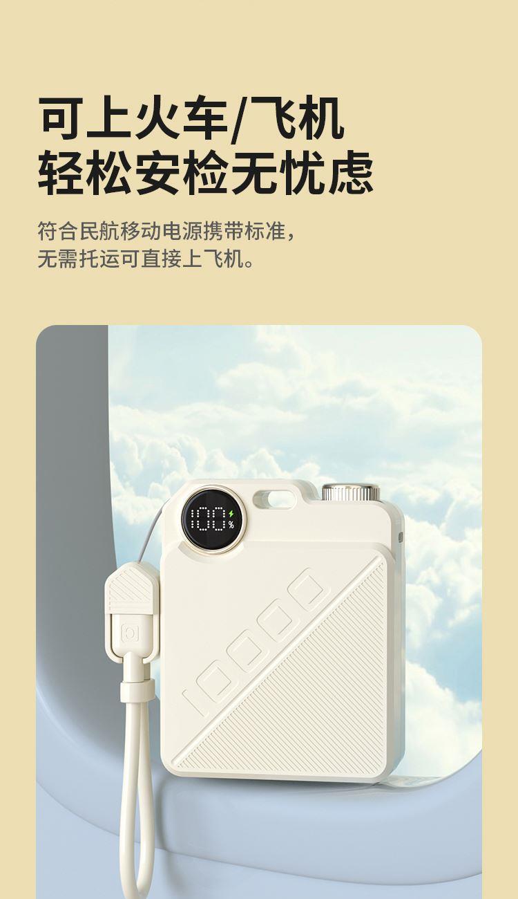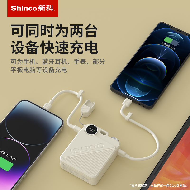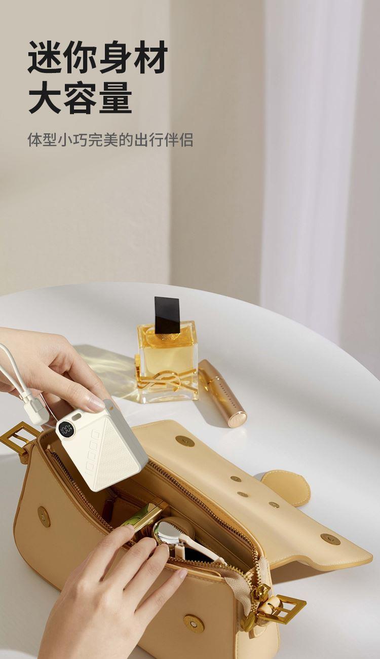 电池能量:38.5Wh 转换效率:≥ 70% 电芯容量:10000mAh/3.85V 电池类型:锂离子电池 总输出:5V-3A Max 额定容量:5500mAh(5V-2A) USB-C输入:5V-3A/9V-2A/12V-1.5A Lightning输入:5V-3A/9V-2A/12V-1.5A USB-C输出:5V-3A/9V-2.2A/12V-1.67A/10V-2.25A Lightning输出:5V-3A/9V-2.2A/12V-1.67A/10V-2.25A 挂绳式快充数据线、USB-C & lightning端口双向快充 迷你身材、10000mAh大容量体型小巧、的出行伴侣 USB-C & lightning接囗支持、22.5W快充输出,18W快充输入 国标CCC安全认证,安心使用 可拆卸挂绳、快充数据线 可同时为、两台设备充电 LED电量显示屏、电量一目了然