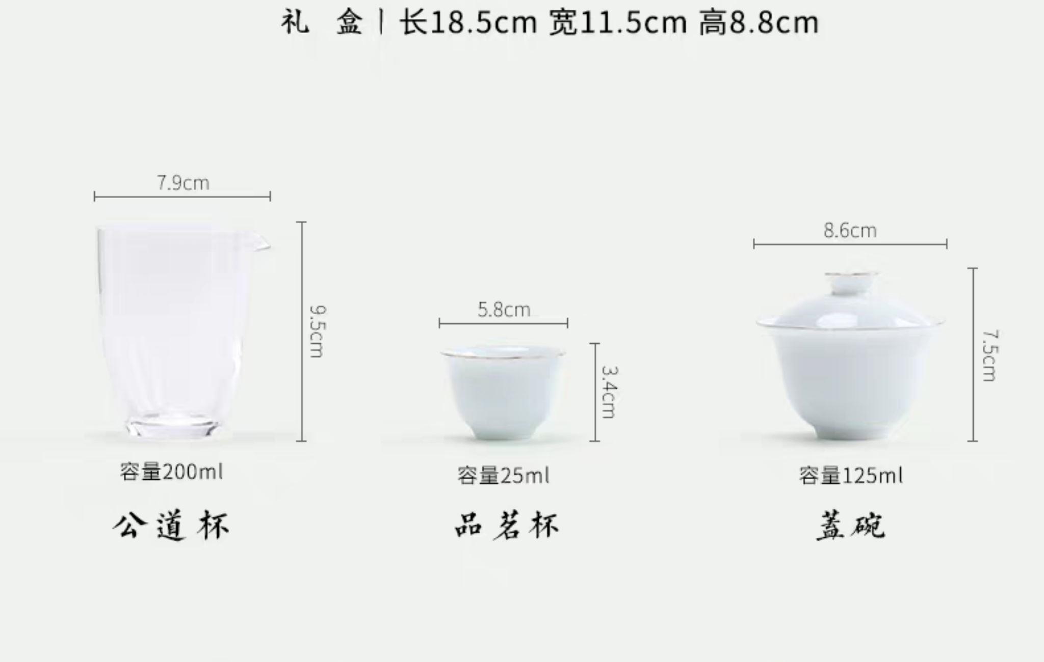 配置:盖碗*1,茶杯*3,玻璃公道*1. 尺寸:盖碗8.6*7.5cm 容量125ml, 品茗杯5.8*3.4cm 容量25ml, 公道7.9*9.5cm 容量200ml。 礼盒长18.5cm宽11.5cm高8.8cm。