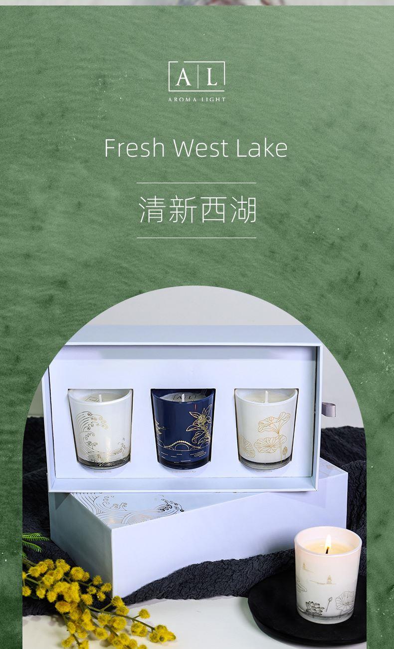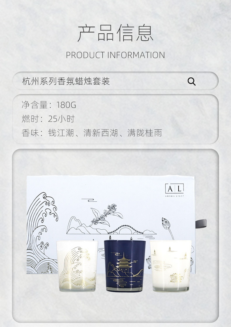 香薰蜡烛:65g*3 尺寸:长 24cm 宽14cm 高7cm 香味描述:钱江潮 满陇桂雨 清新西湖