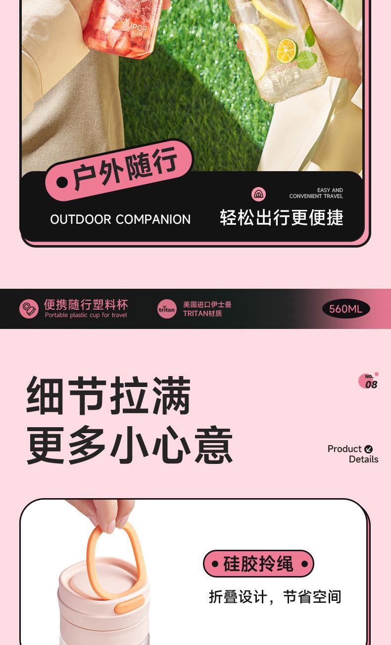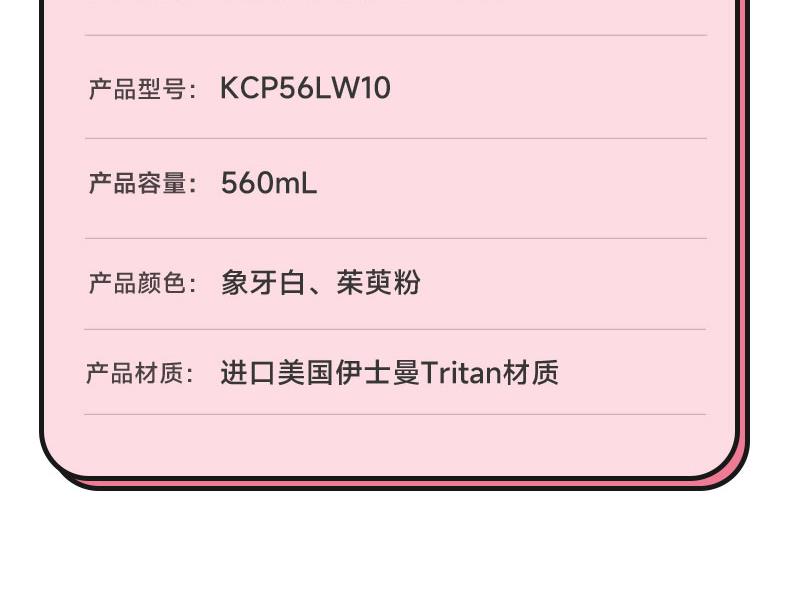 容量 560ml 材质 Tritan 规格参数 产品说明 颜色:茱萸粉/象牙白 外箱尺寸(mm):490*327*417mm 毛重(kg):10.99kg