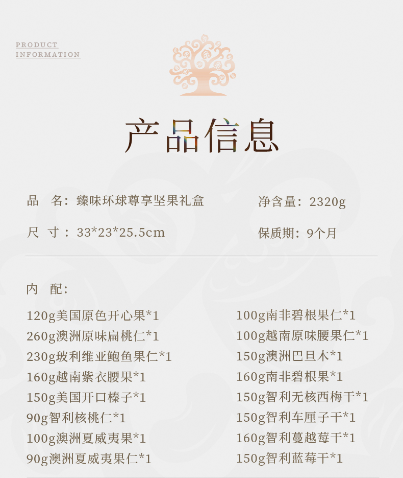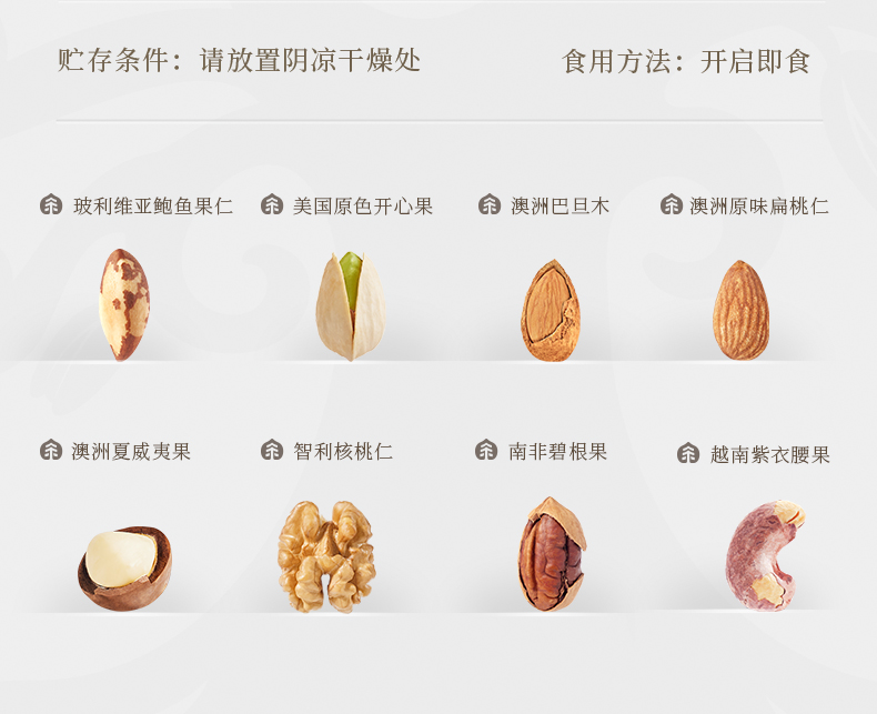 120g美国原色开心果*1 260g澳洲原味扁桃仁*1 230g玻利维亚鲍鱼果仁*1 160g越南紫衣腰果*1 150g美国开口榛子*1 90g智利核桃仁*1 100g澳洲夏威夷果*1 90g澳洲夏威夷果仁*1 100g南非碧根果仁*1 100g越南原味腰果仁*1 150g澳洲巴旦木*1 160g南非碧根果*1 150g智利无核西梅干*1 150g智利车厘子干*1 160g智利蔓越莓干*1 150g智利蓝莓干*1