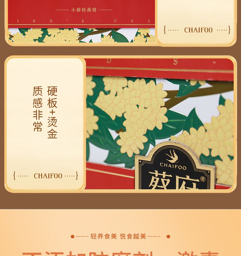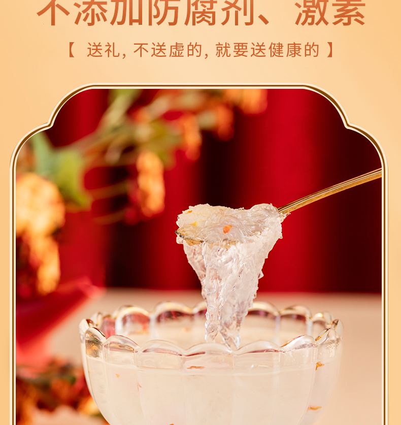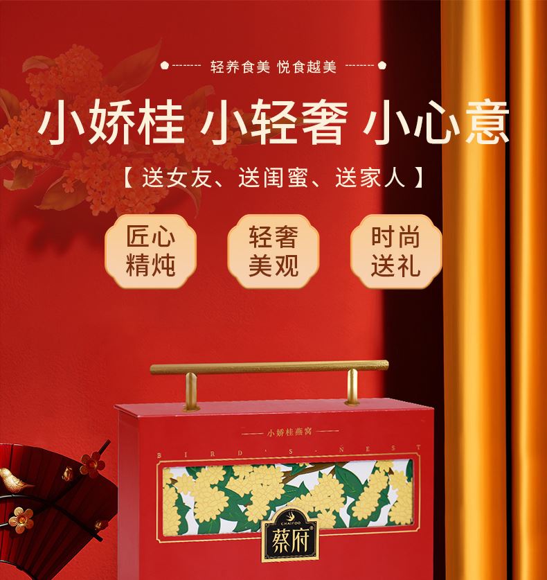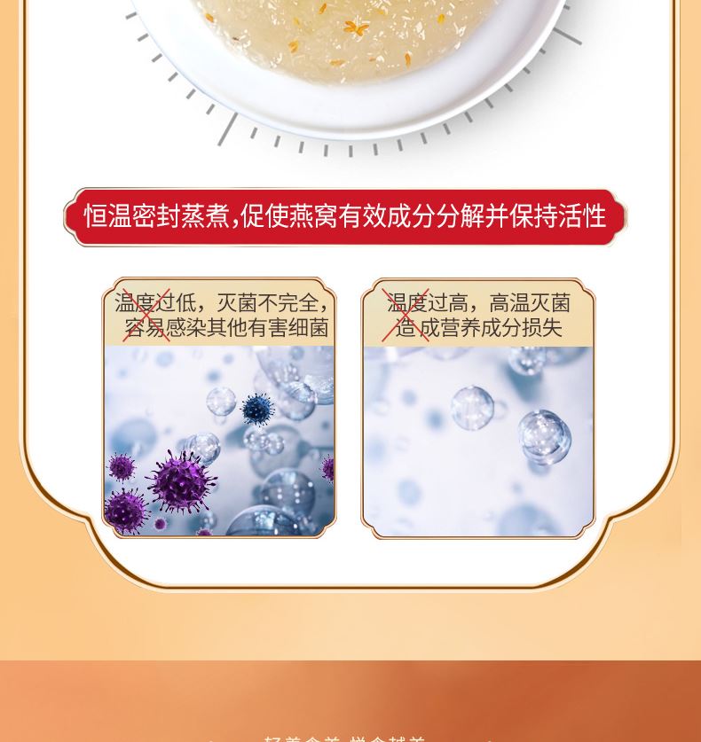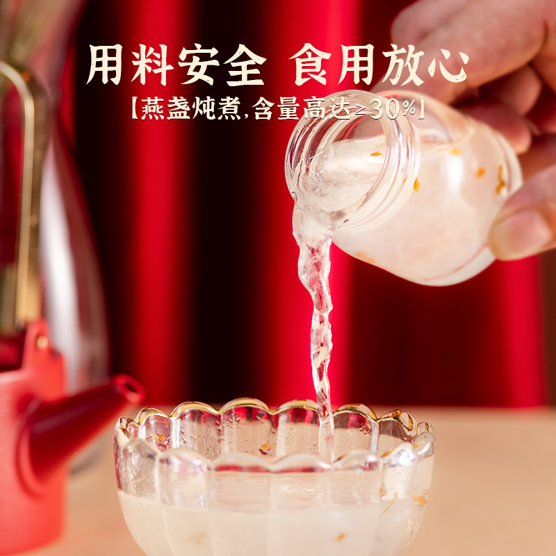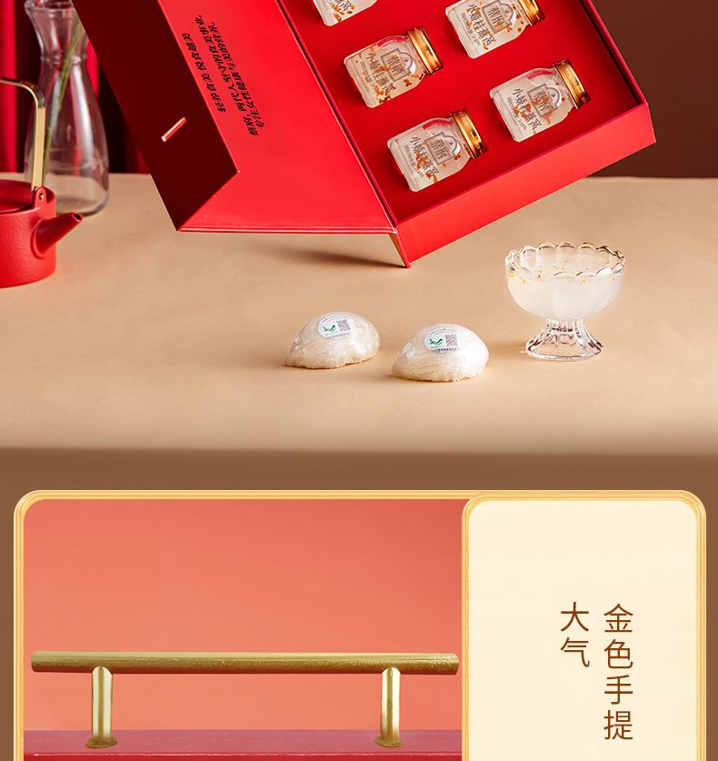 产品规格:240g(40g*6) 包装尺寸:26*24*6.5cm 精致百元档即食燕窝礼盒 马来燕盏+清新丹桂,双重加持,蛋清清香和丹桂甜香,相得益彰; 精选马来红树林燕盏炖煮,每瓶干燕窝投放量1克,固形物含量≥30%; 优选花中贡品丹桂,花型娇美,芳香馥郁,沁人心脾; 121℃商业无菌工艺,10万级无菌净化车间,精工锁鲜炖煮; 开盖即食,一天一瓶,省时省力又省心。