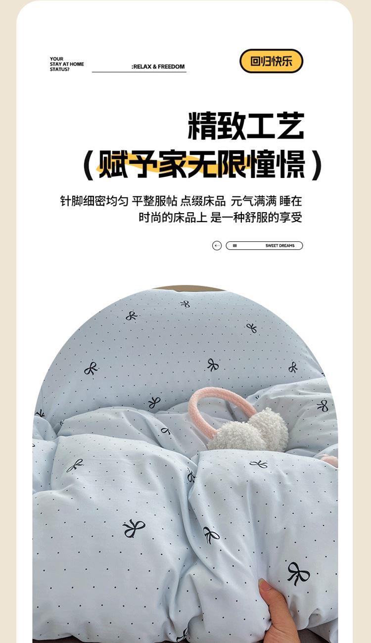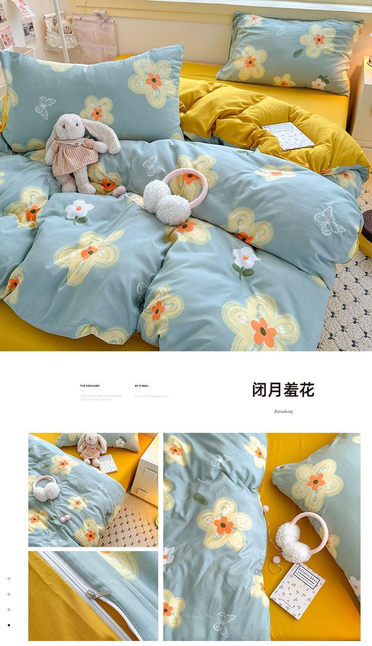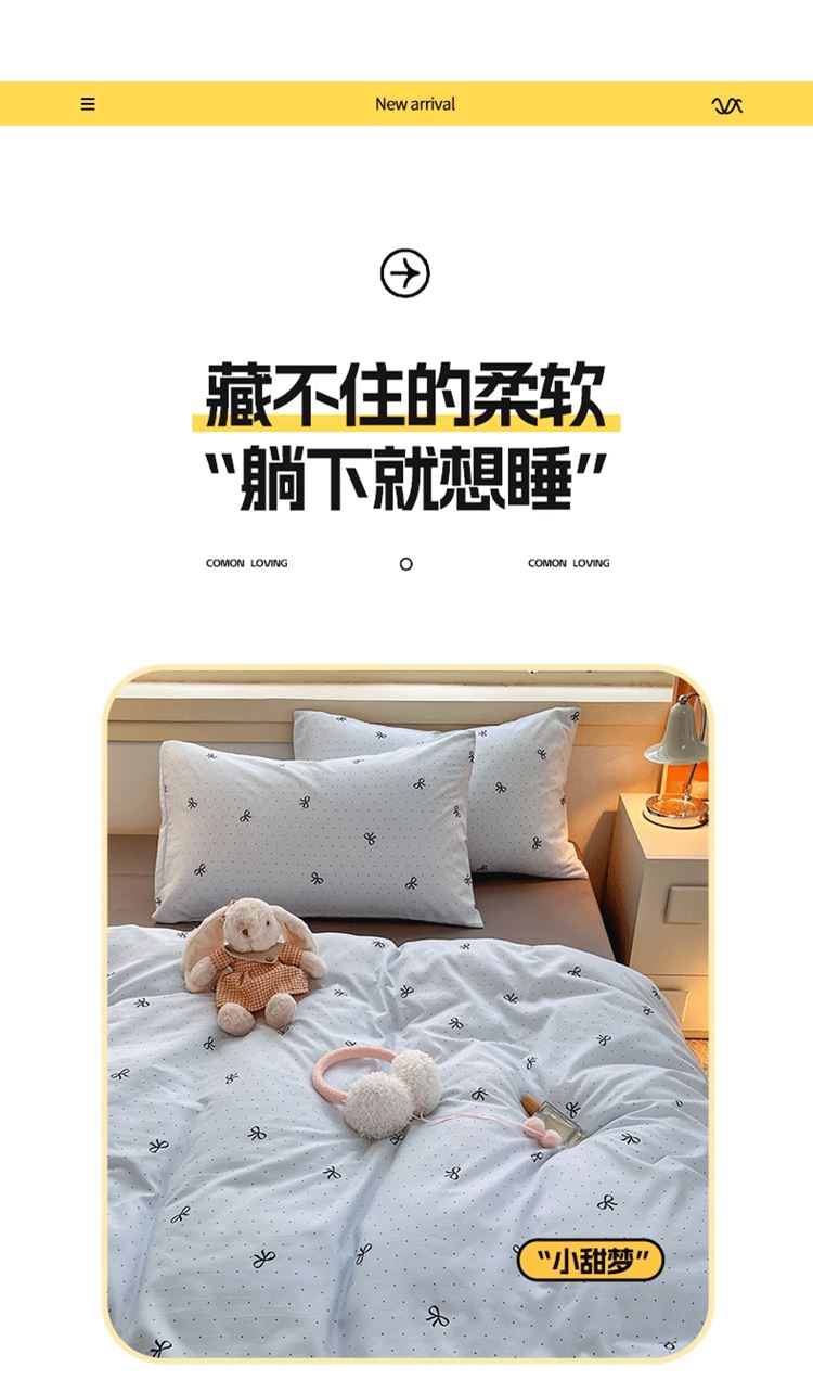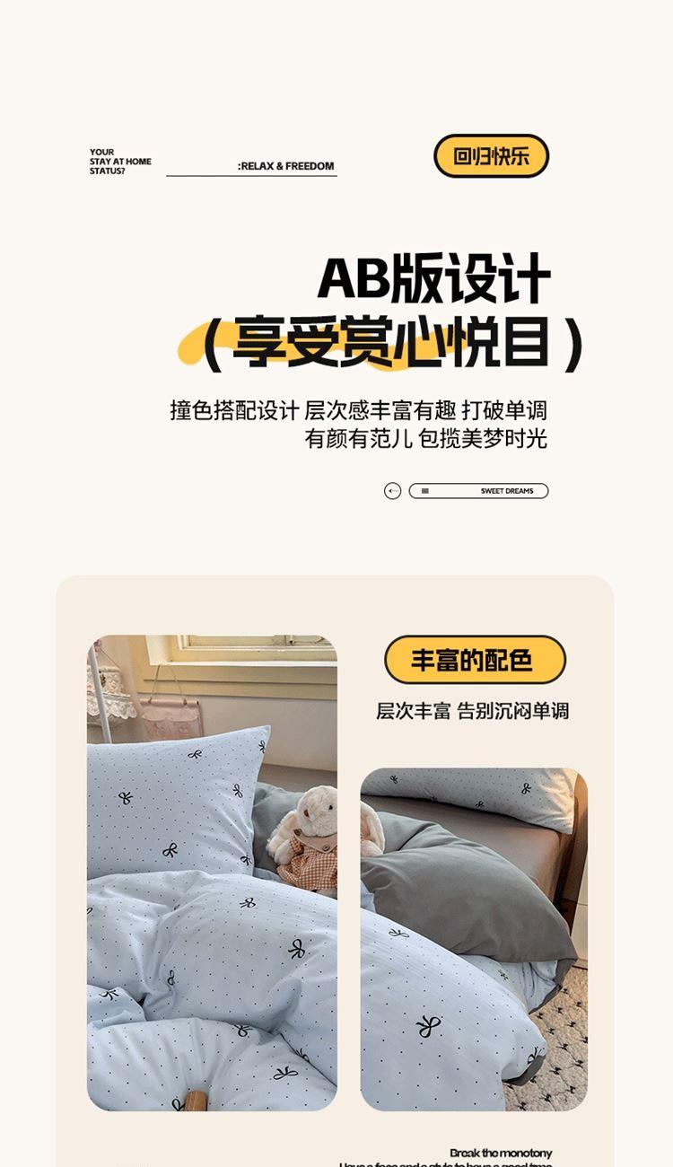 1:甄选绵软水洗棉面料 舒适柔软莹润宠溺你的肌肤 触感细腻 感知好睡眠 2:让睡眠更柔软,绵软透气 如坠云端般睡感 3:撞色搭配设计 层次感丰富有趣 打破单调有颜有范儿 包揽美梦时光 尺寸:被套200*230cm*1 床单:230*230cm*1 枕套:48*74cm*2 包装:彩盒 面料:亲柔棉