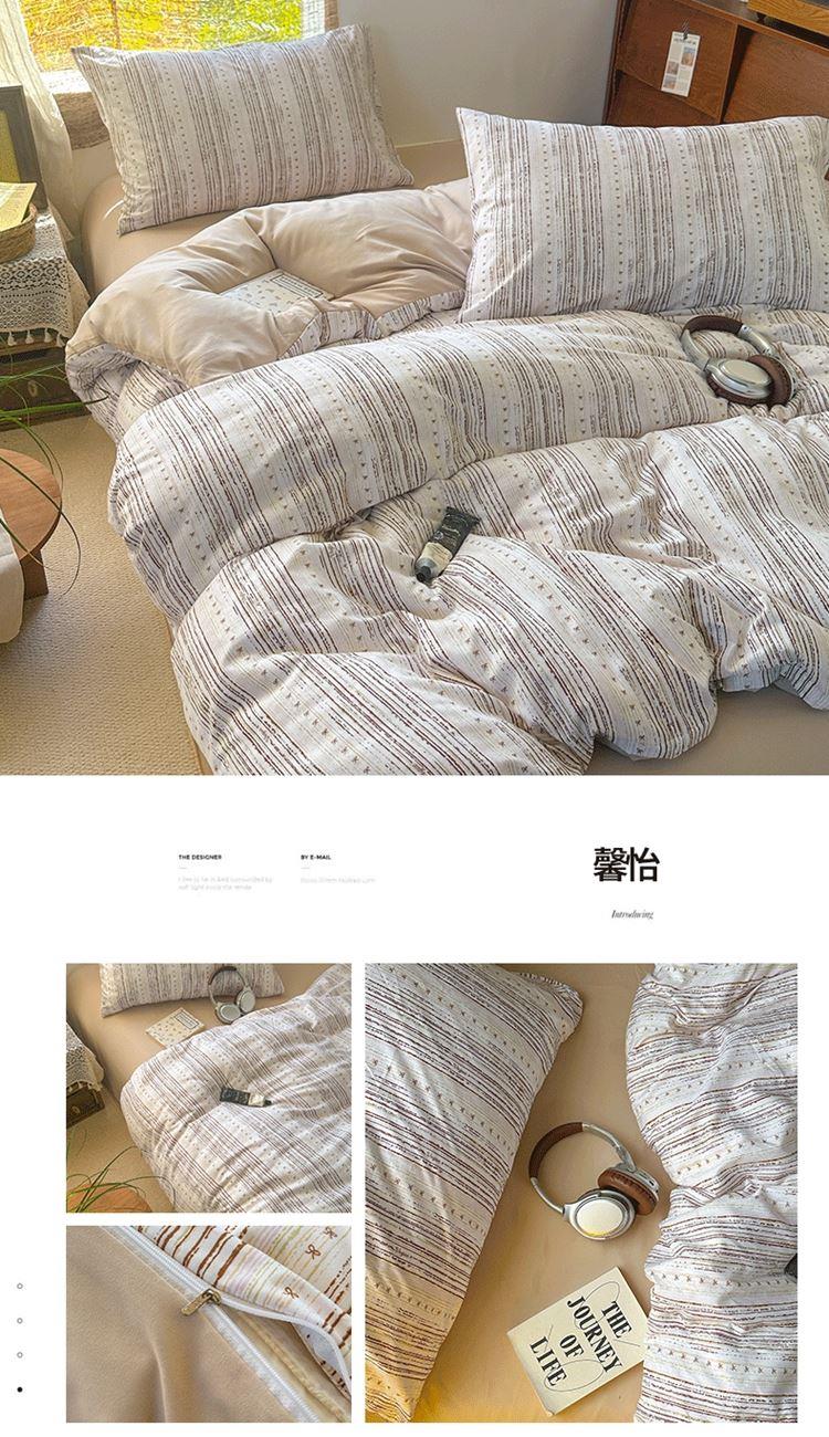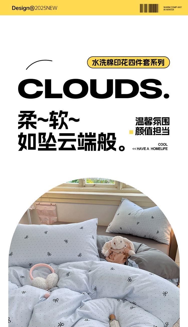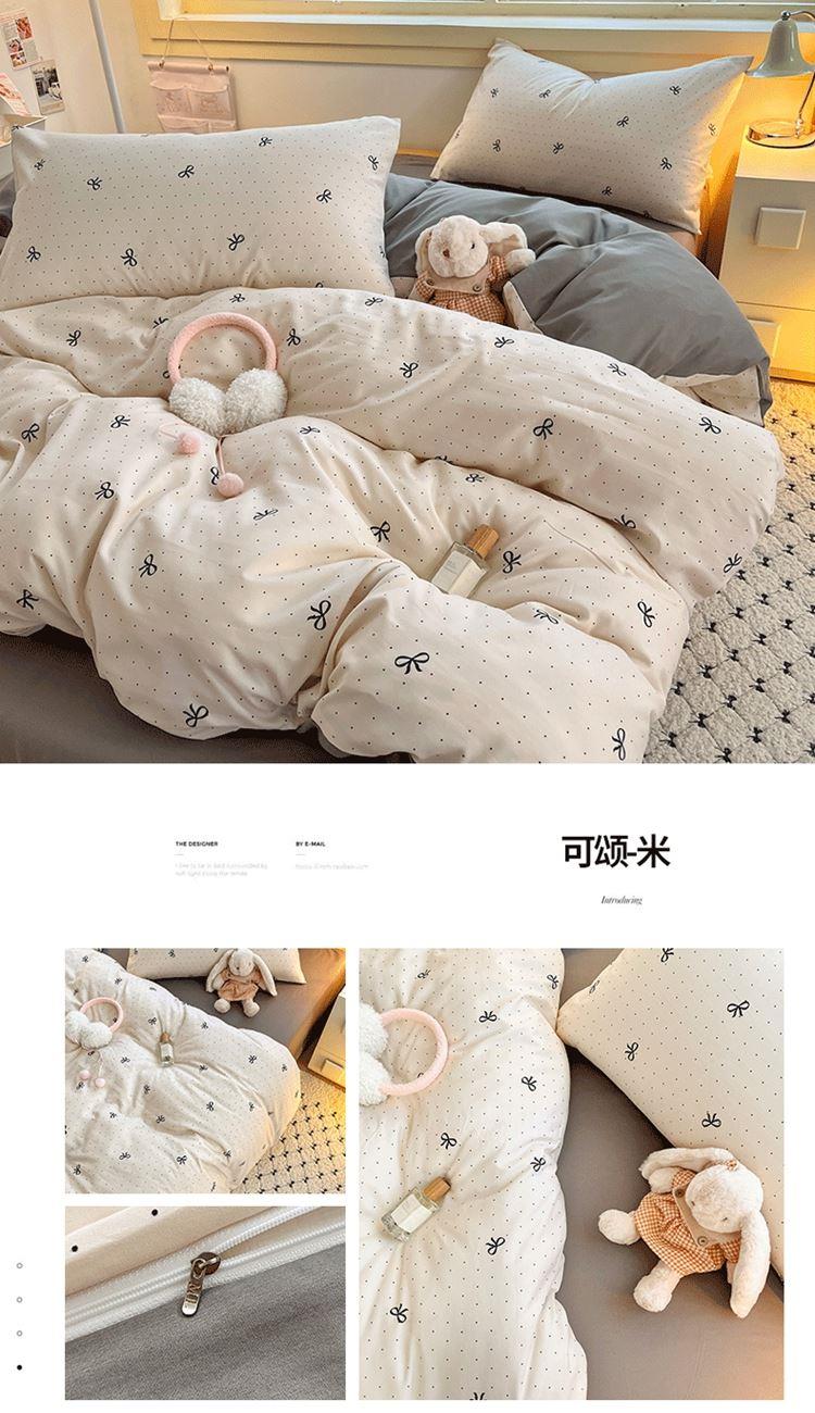 1:甄选绵软水洗棉面料 舒适柔软莹润宠溺你的肌肤 触感细腻 感知好睡眠 2:让睡眠更柔软,绵软透气 如坠云端般睡感 3:撞色搭配设计 层次感丰富有趣 打破单调有颜有范儿 包揽美梦时光 尺寸:被套200*230cm*1 床单:230*230cm*1 枕套:48*74cm*2 包装:彩盒 面料:亲柔棉