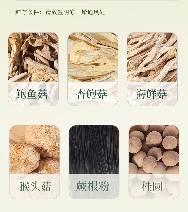鲍鱼菇100g 杏鲍菇100g 海鲜菇100g 猴头菇100g 蕨根粉500g 桂圆180g