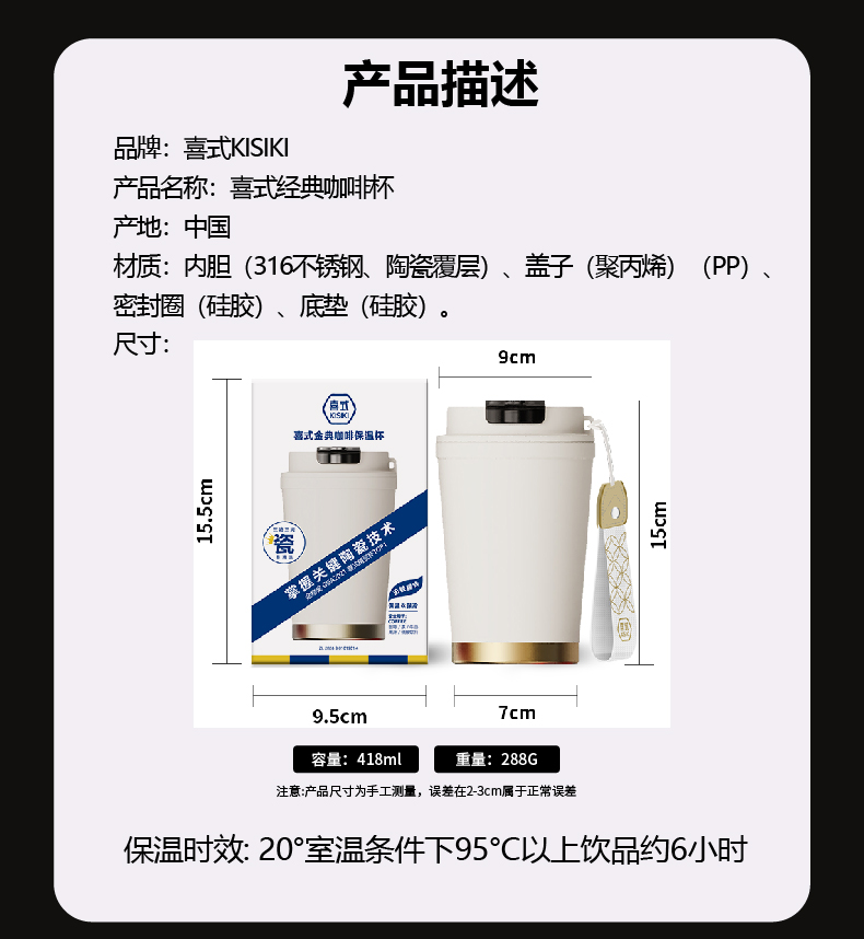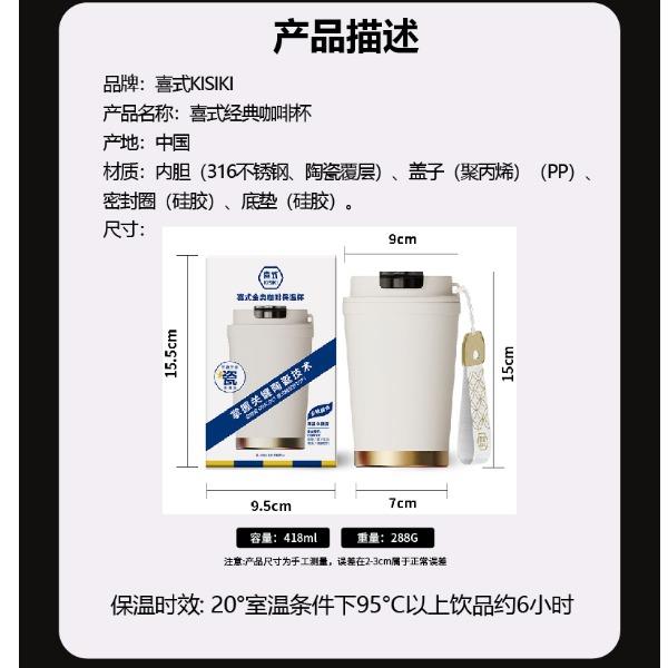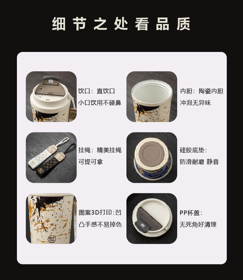 杯身喷塑附着力强、316杯体、瓷内胆,易清洗 包装;彩盒 1.黑科技陶瓷内胆:无金属异味 保温 锁鲜 耐酸碱,冷热酸甜都不惧怕 2.百搭魔法杯:咖啡、红茶、果汁、牛奶、都可泡 3.瓷内胆,不易留茶垢,方便清洗更省心 4.使用新型3D喷墨印刷技术,展现凹凸立体质感,将颜色和细微图案一层一层精心的重叠,再现图案的触感 5.杯盖有隐形拉手,出门一提就走 6.硅胶杯垫,既防滑耐磨又静音,有效保护杯底,车载不怕洒水
