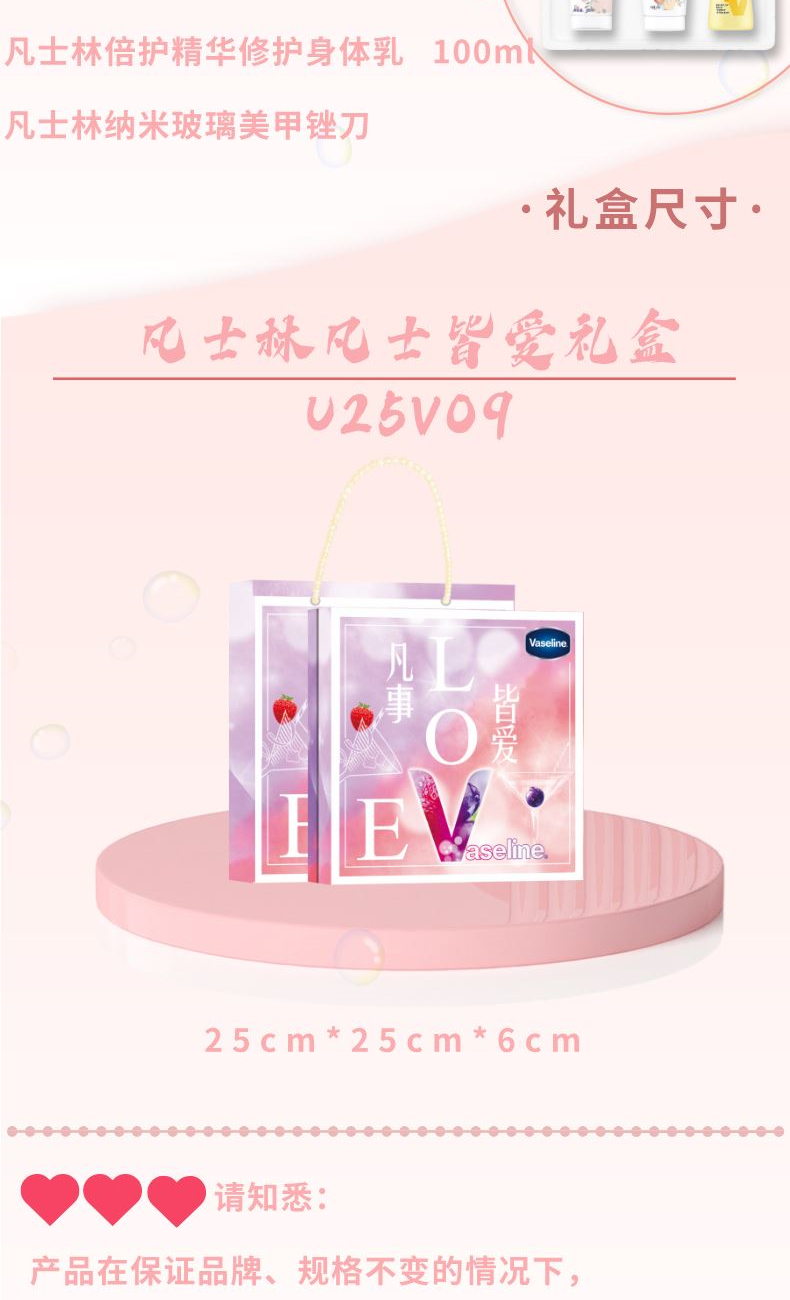 凡士林滋润护手霜玫瑰香型 100ml 凡士林滋润护手霜白桃香型 40ml 凡士林经典修护弹润润唇膏清甜白桃味 3.5g 凡士林经典修护晶冻原味 50g 凡士林倍护精华修护身体乳 100ml 凡士林纳米玻璃美甲锉刀 包 装 :彩盒 重 量 :827g 礼盒尺寸:250*250*60mm