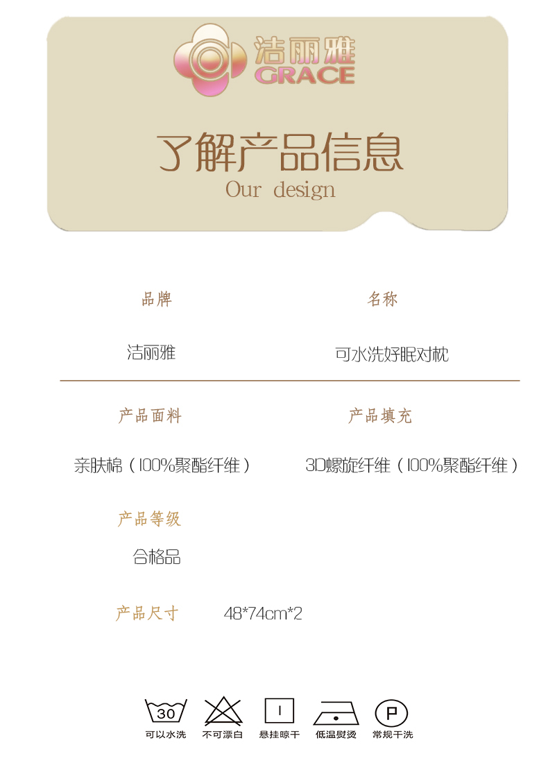 规格:48*74cm*2 面料:亲肤棉(聚酯纤维) 填充:3D螺旋纤维(聚酯纤维) 执行标准:GB/T22796-2021 安全类别:GB18401-2010 B类 柔软舒适,优选亲肤棉面料,良好的呵护颈椎,舒适的睡眠时光。面料透气网眼,不闷热,稀释透气。惊喜绗缝,优质绗缝工艺,不抛料,品质保障。 枕头高弹力,贴合人体脊椎生长曲度,仰睡侧睡都可以,给您更好的承托力。