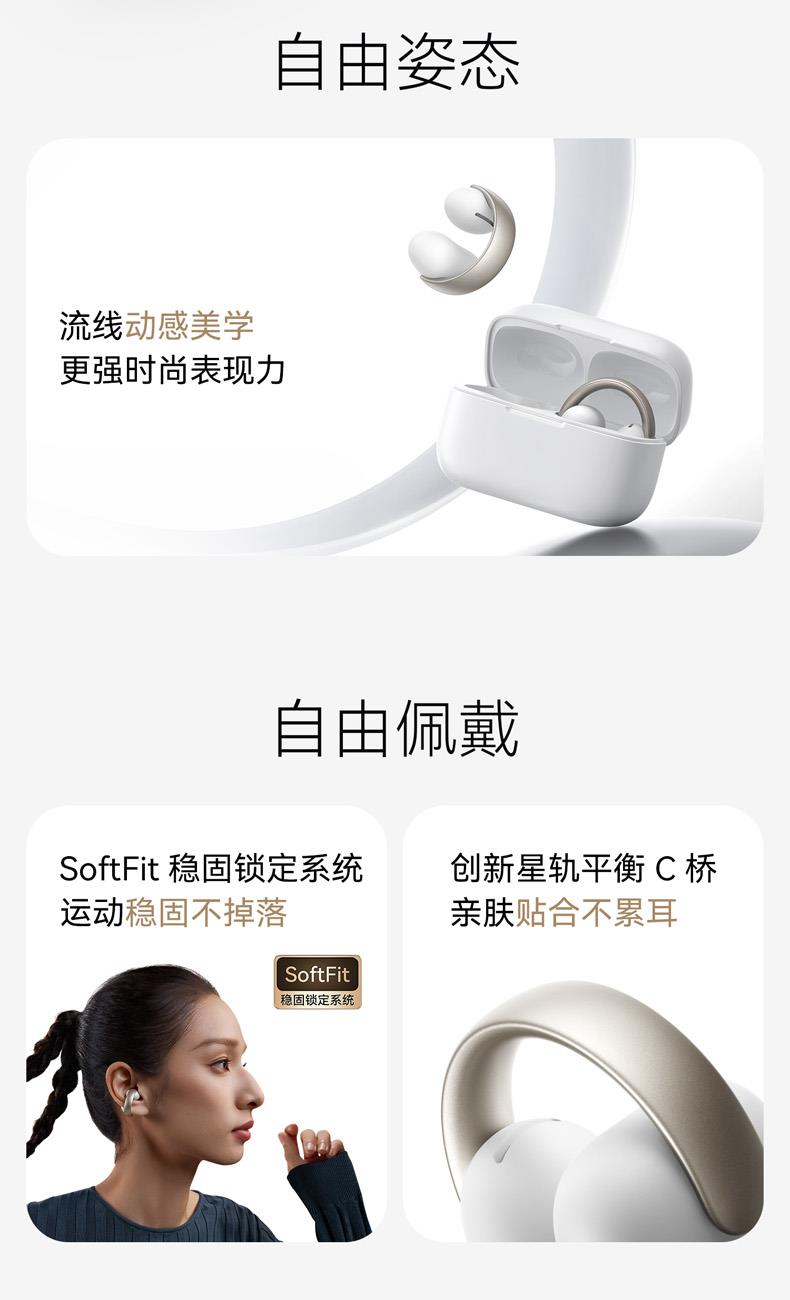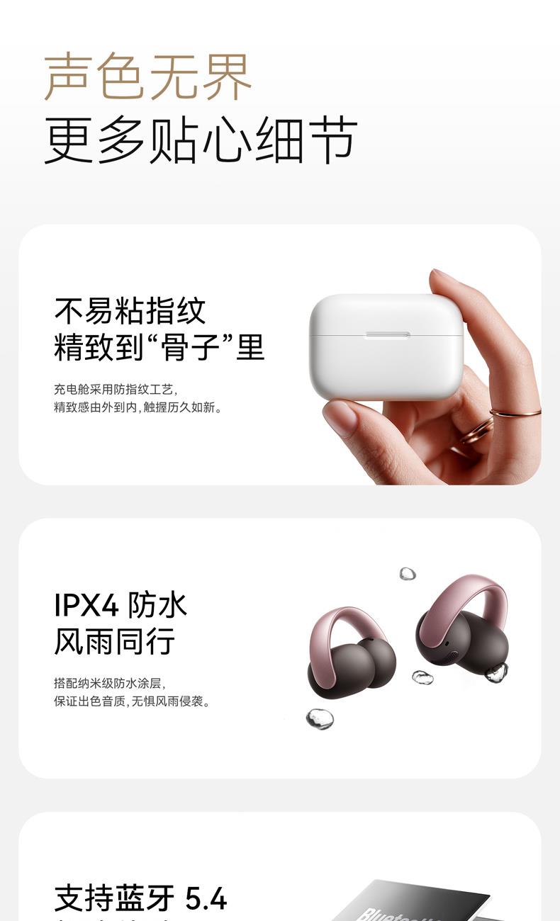 1、超亲肤弹性材质C 桥弧线延长设计高密度云感音腔 2、0.5mm 记忆钦丝柔性液态硅胶耳翼 3、耳机8小时/搭配充电盒使用32小时 4、4mic+Al 通话降噪