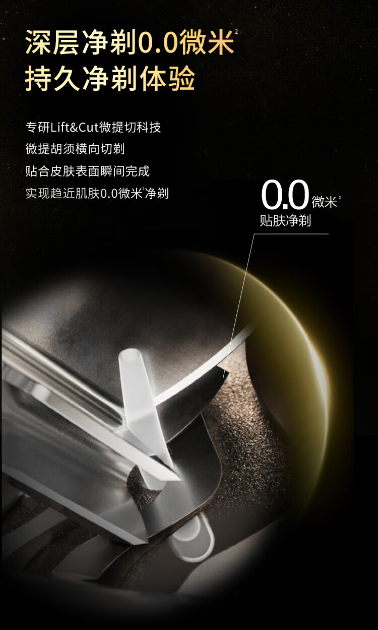 • SkinIQ 肌能感应科技 360度灵动刀头 • 采用多轨须发引入槽,增强表面性能 • 手柄中集成修剪器 是留须髭和修剪鬓角的理想方式。 • 45 片欧洲进口的锋利自研磨刀片,每分钟可完成高达 90,000 次切剃• 充满电后,可提供 60 分钟无线剃须,5 分钟快速充电