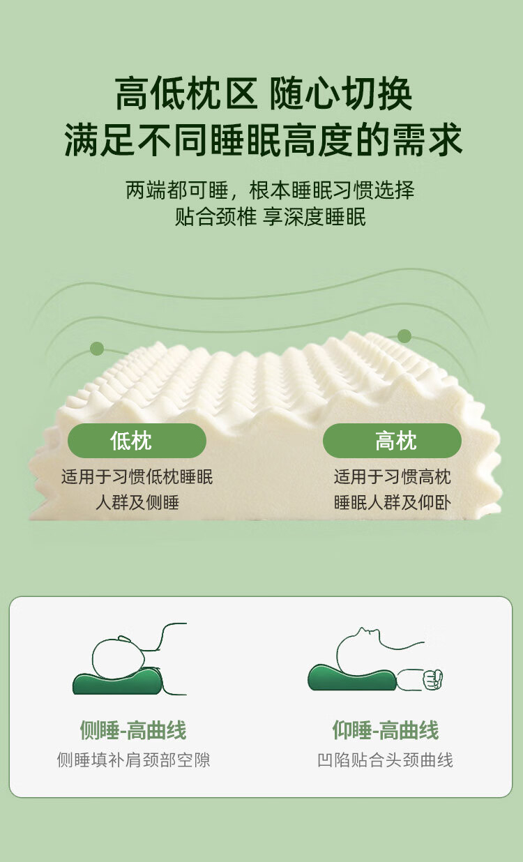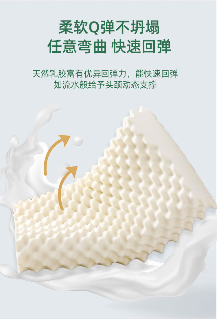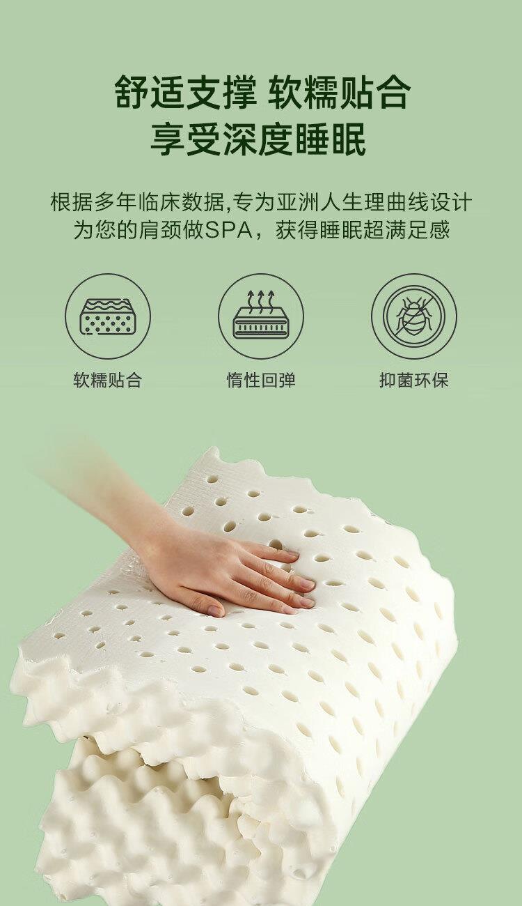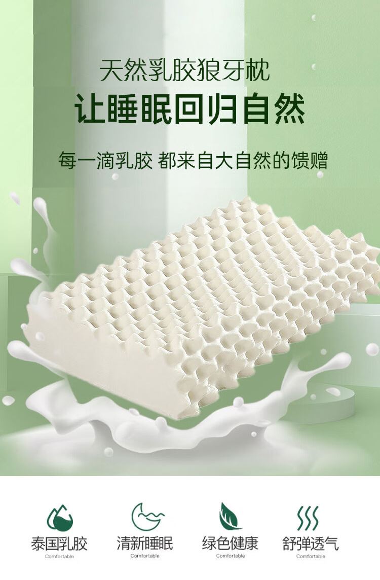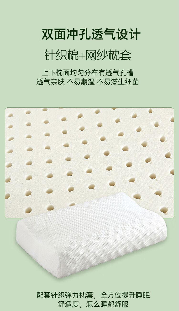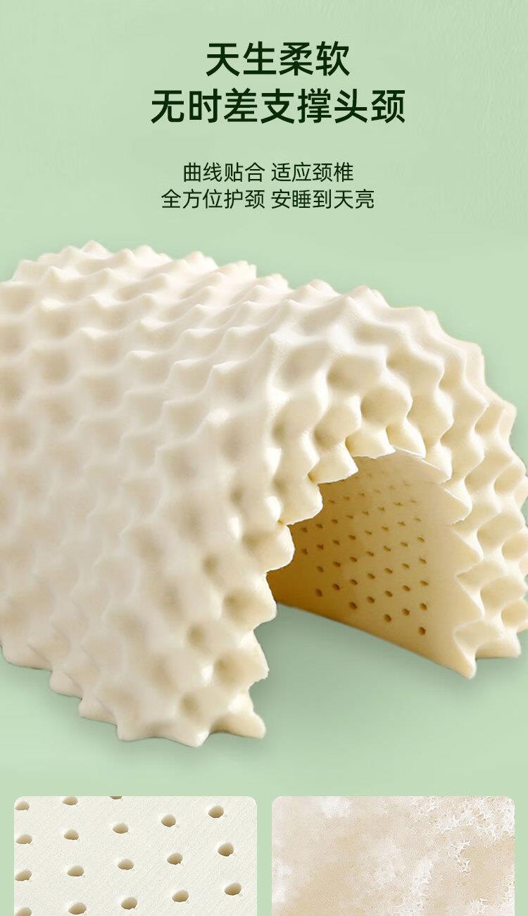 规格:40*60cm 面料:针织棉+网纱 填充:泰国进口乳胶 执行标准:GB/T22843-2009 安全类别:GB18401-2010 B类 1.乳胶是一种天然材质,其原液是直接从橡胶树皮中滴落下来的乳胶汁物理发泡加工一次成型,有天然乳香气息,含量高达90%以上乳胶成分,多纬蜂窝状气孔,较其他枕芯更为舒适,快速散发人体睡眠中余热和湿气。 2.枕头高弹力,贴合人体脊椎生长曲度,仰睡侧睡都可以,给您更好的承托力