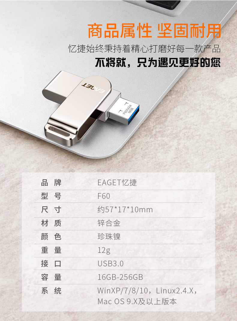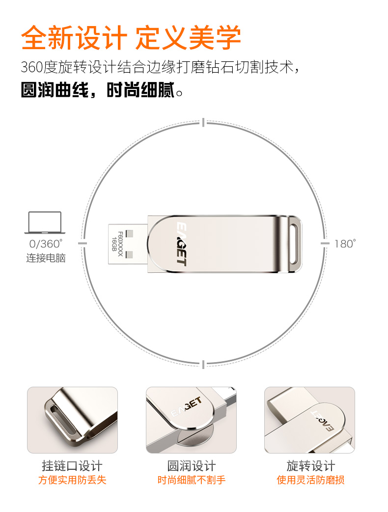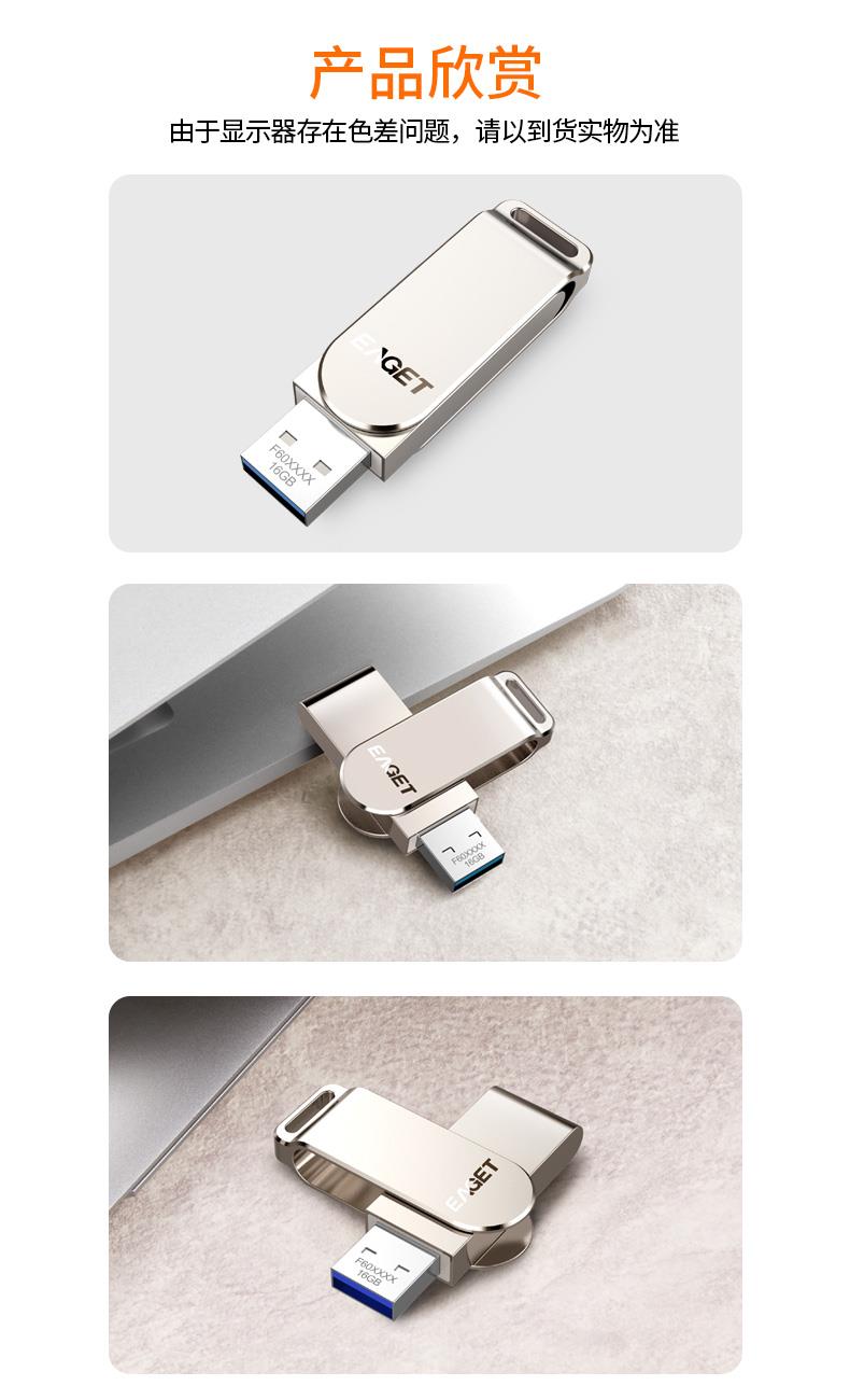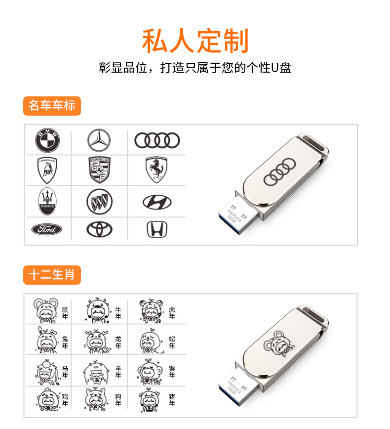 USB3.0接口 高速全金属U盘 360度旋转车载优盘 网红音乐盘 办公优盘 简约小巧 产品尺寸:57*17*10mm 包装尺寸:11.3*9cm 单品重量:9g